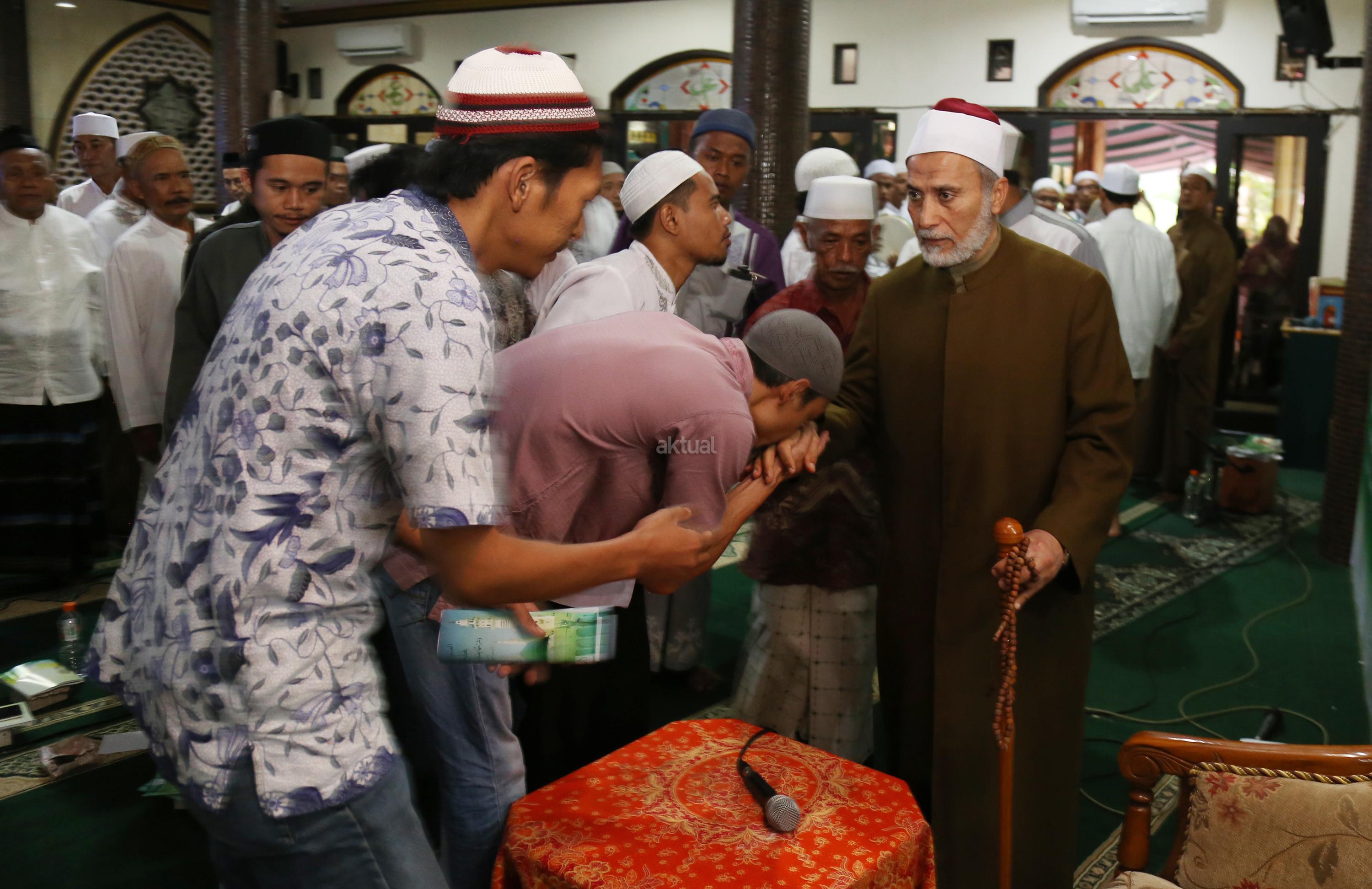 Maulana Syekh Yusri Rusydi Jabr Al Hasani didampingi Khodimu Zawiyah Arraudhah Ihsan Foundation, Al Akh Muhammad Danial Nafis usai acara Majelis Ijazah Shalawat, Tahlil dan HaflahMaulid Akbar Nabi Muhammad SAW di Masjid Arraudhah, Desa Tambakasri, Tangkil, Tajinan, Malang, Jawa Timur, Jumat (27/1/2017). Dalam kesempatan tersebut, Syekh Yusri menjelaskan secara rinci Shalawat Yusriah, dimana Shalawat tersebut merupakan ilham yang beliau dapatkan saat melaksanakan ibadah umroh pada tahun 1432 H. AKTUAL/Tino Oktaviano