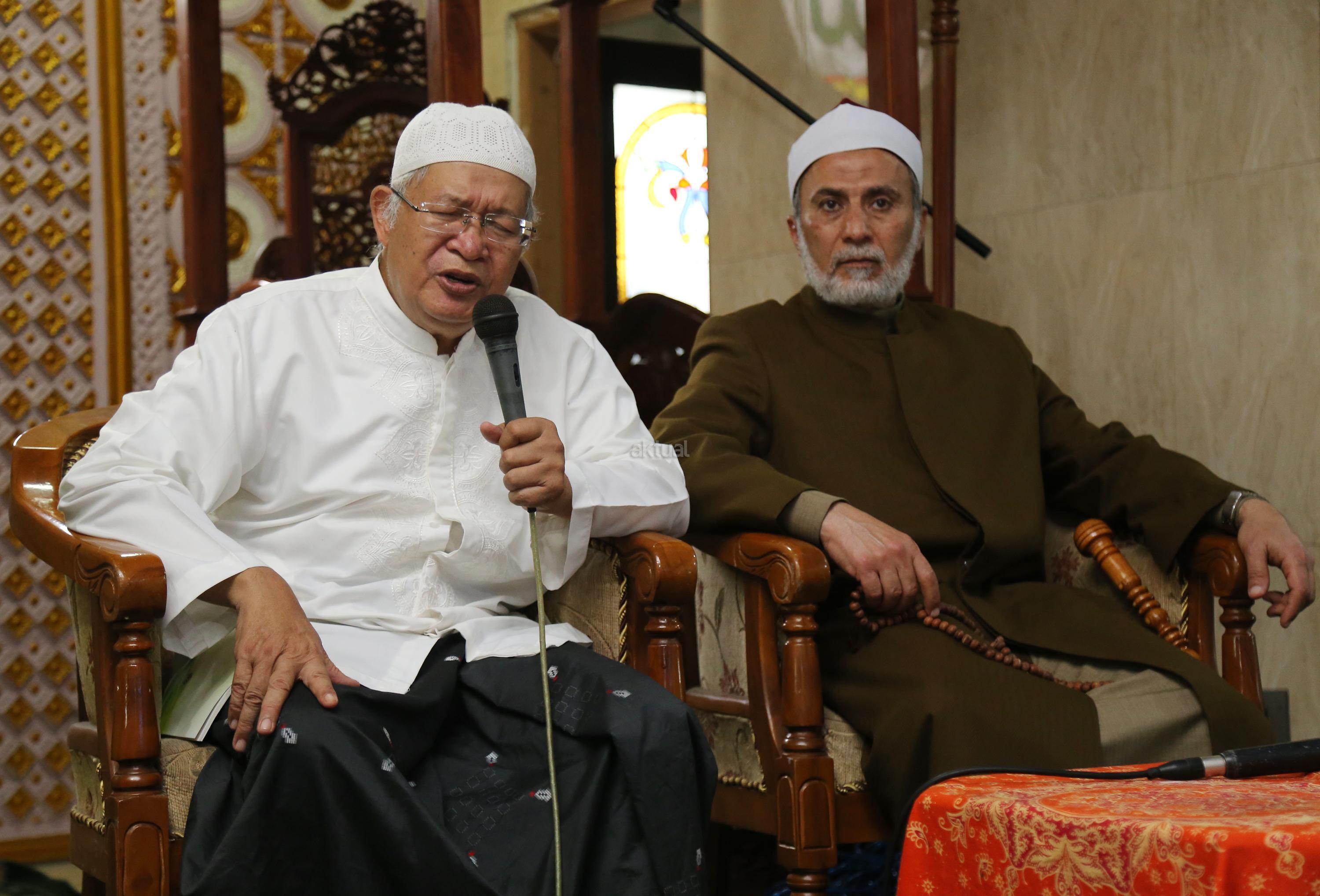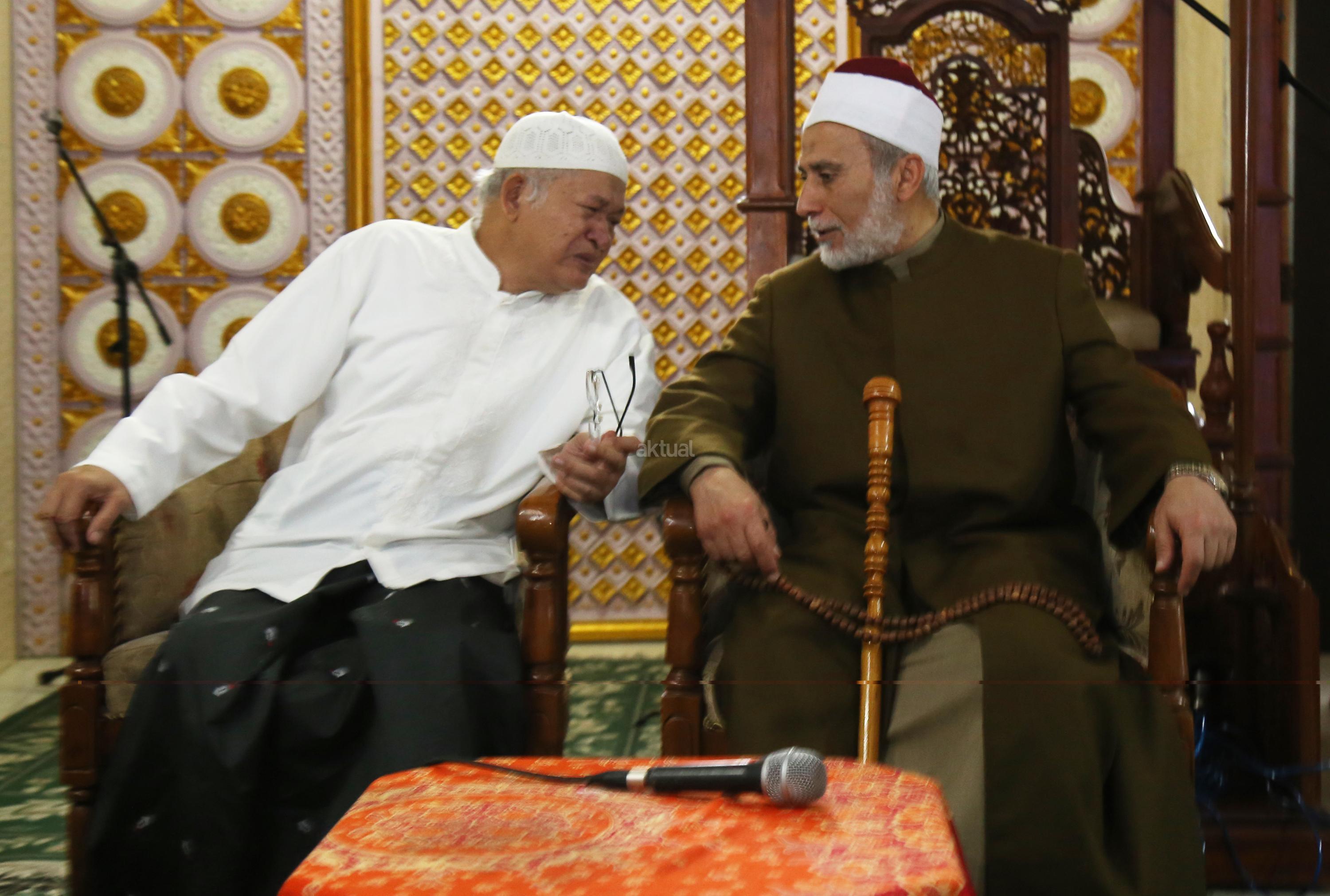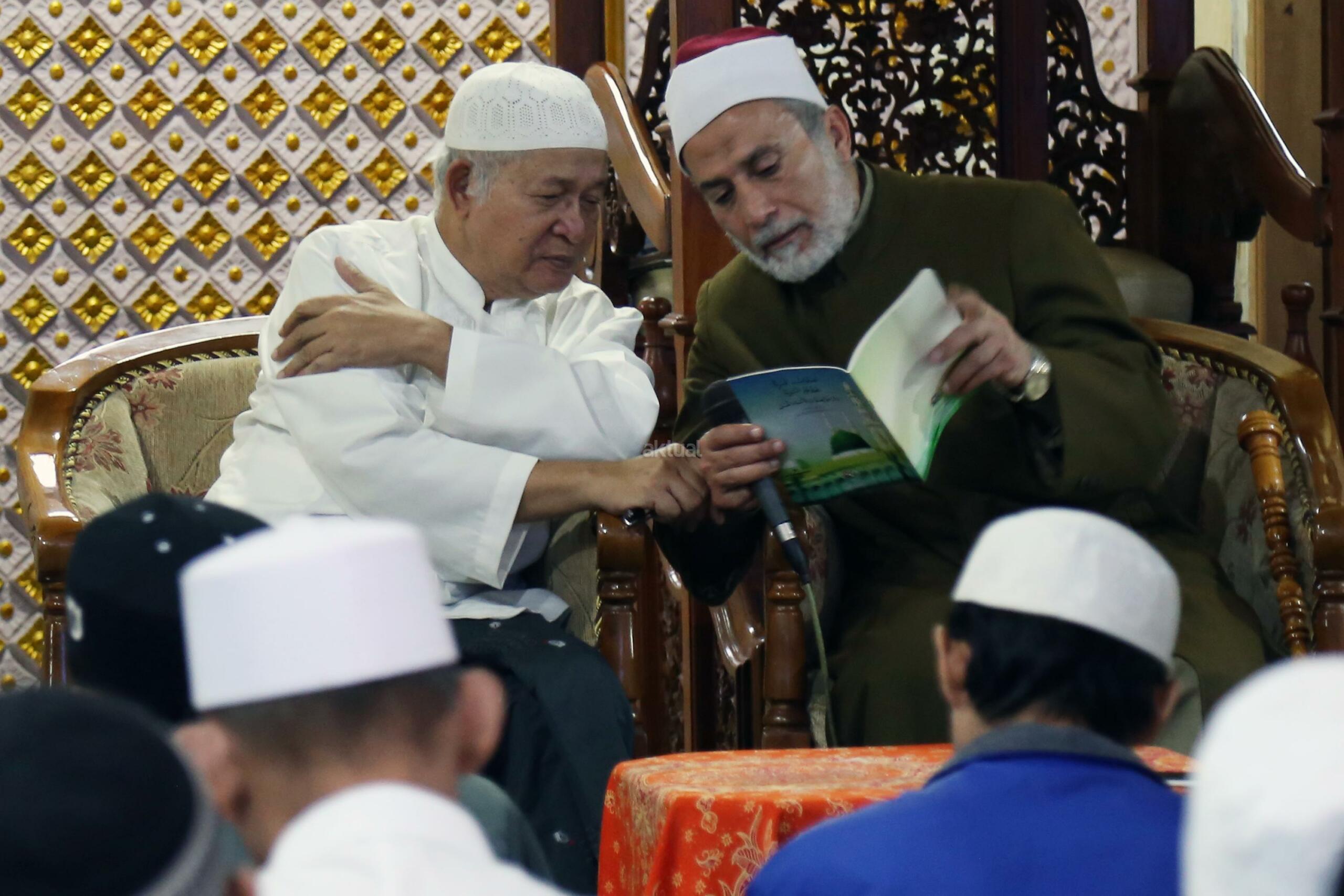 Maulana Syekh Yusri Rusydi Jabr Al Hasani didampingi Pengasuh Masjid dan Madrasah Arraudhah KH Asyari Tafsir saat beristirahat disela acara acara Majelis Ijazah Shalawat, Tahlil dan HaflahMaulid Akbar Nabi Muhammad SAW di Masjid Arraudhah, Desa Tambakasri, Tangkil, Tajinan, Malang, Jawa Timur, Jumat (27/1/2017). Dalam kesempatan tersebut, Syekh Yusri menjelaskan secara rinci Shalawat Yusriah, dimana Shalawat tersebut merupakan ilham yang beliau dapatkan saat melaksanakan ibadah umroh pada tahun 1432 H. AKTUAL/Tino Oktaviano