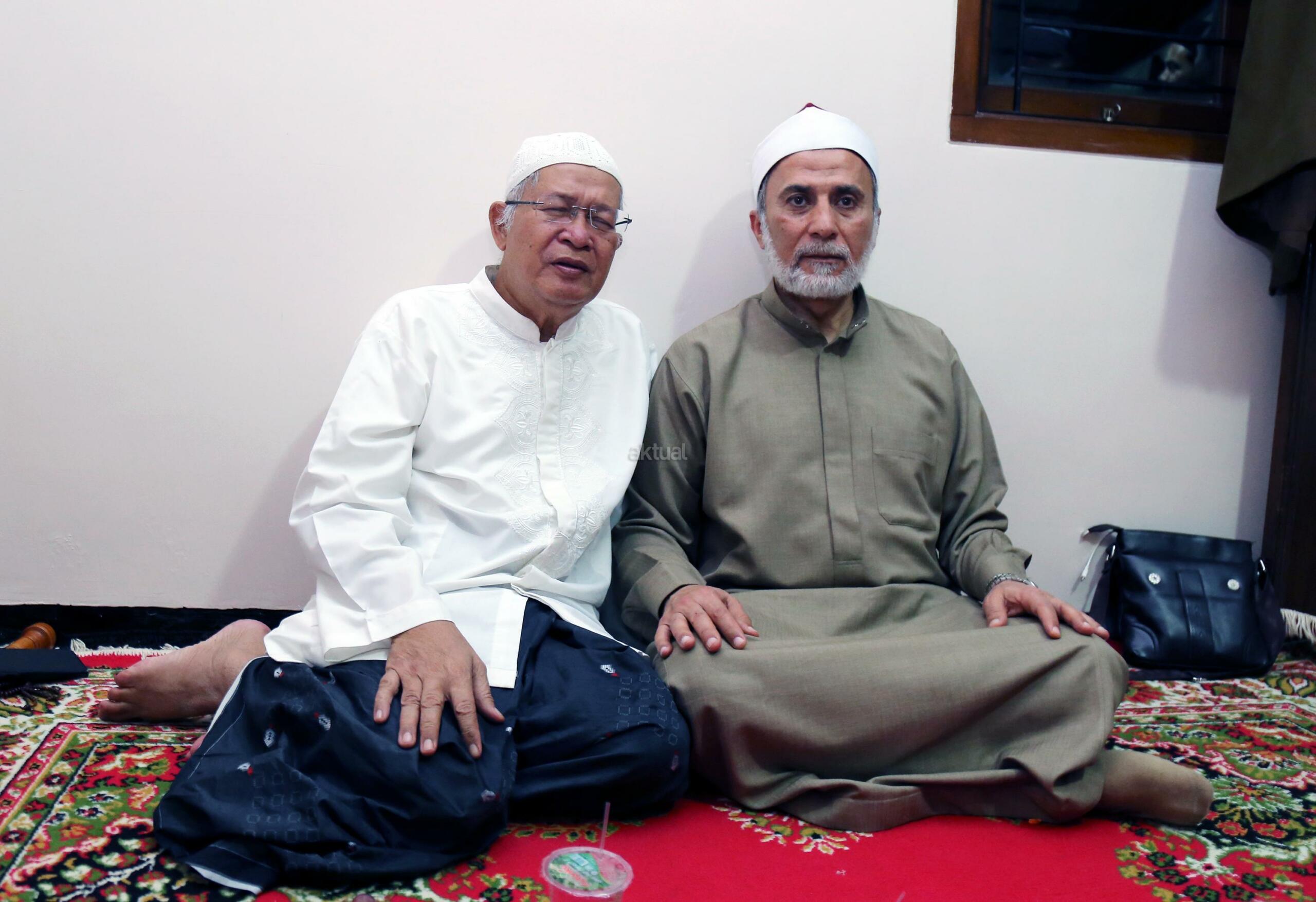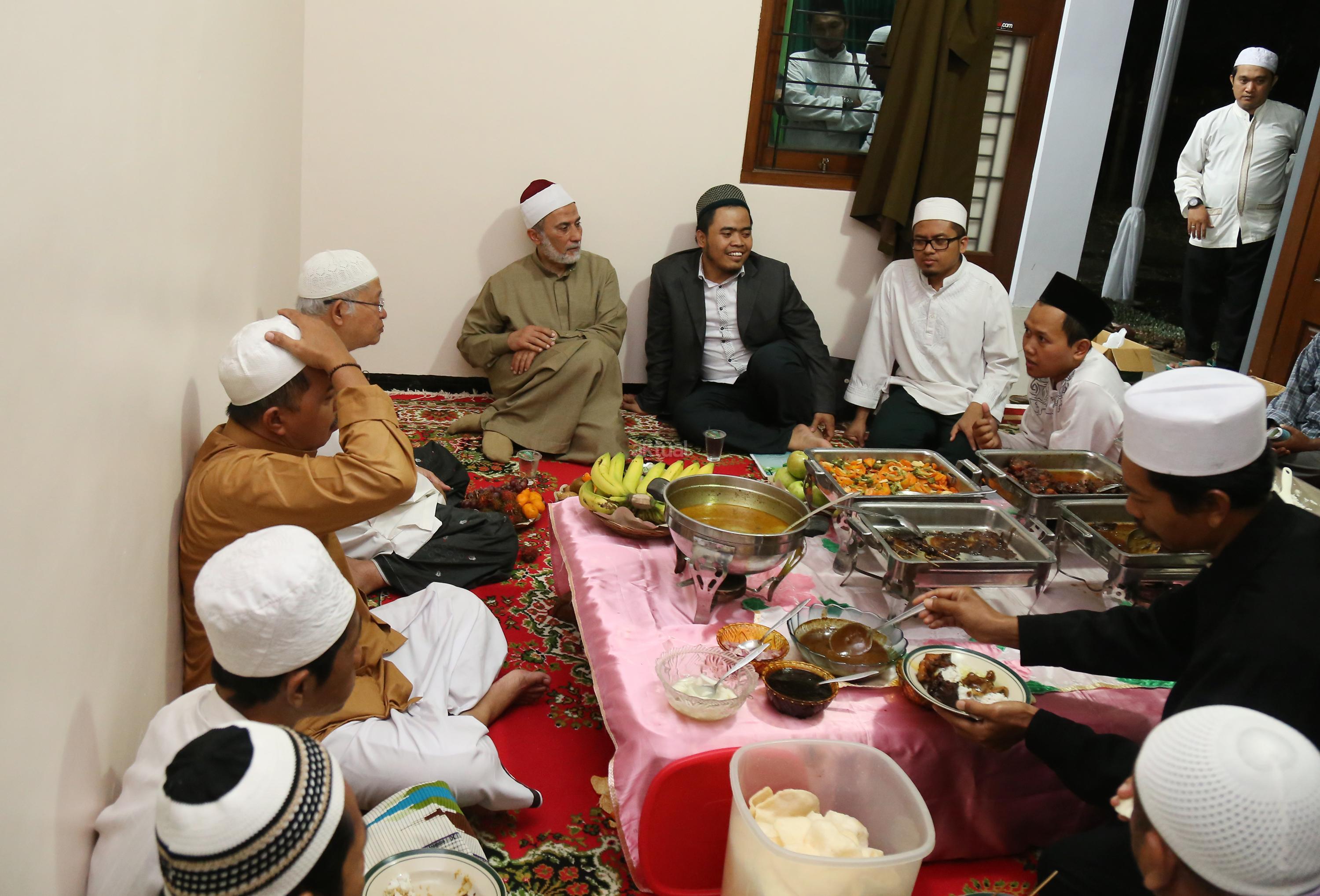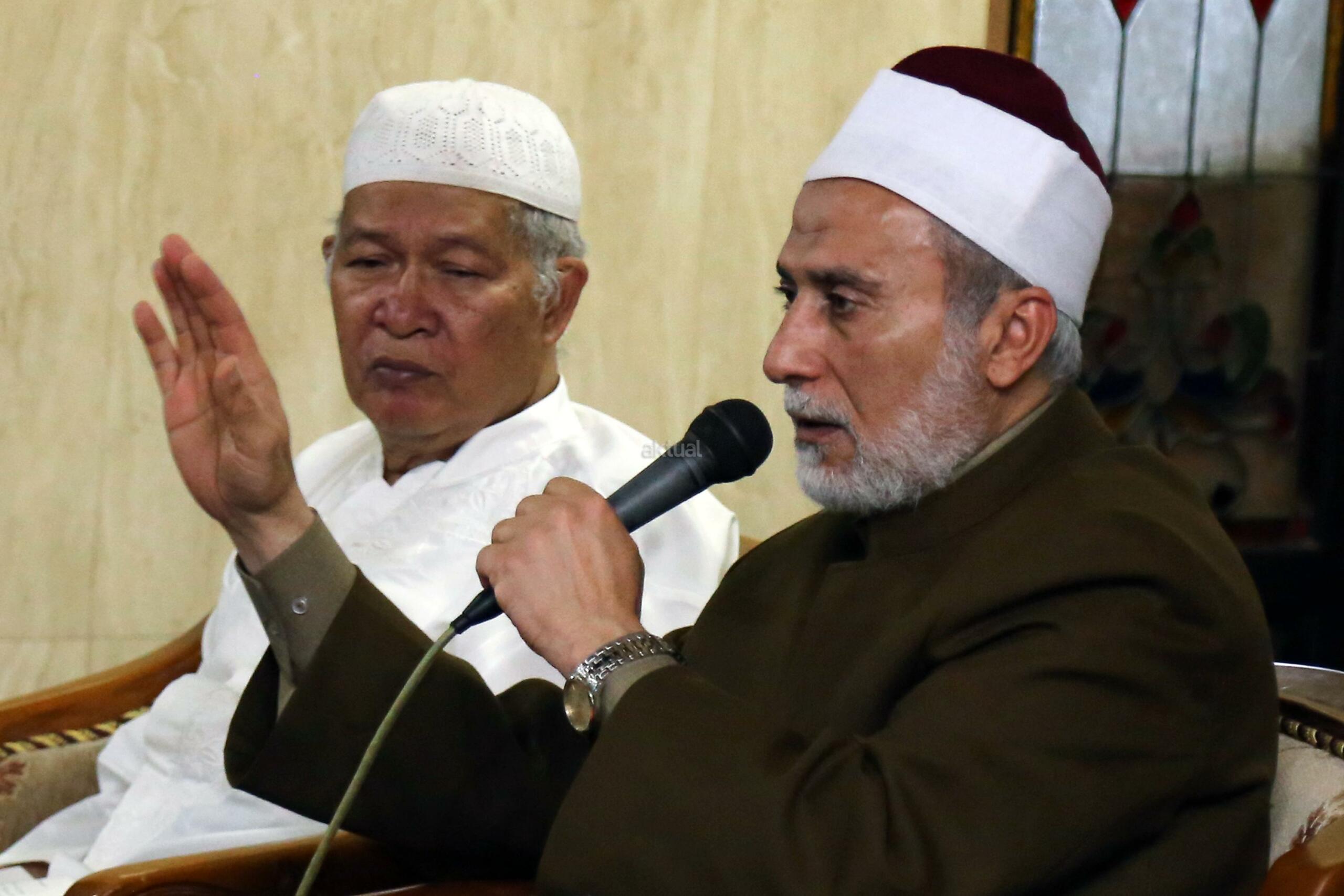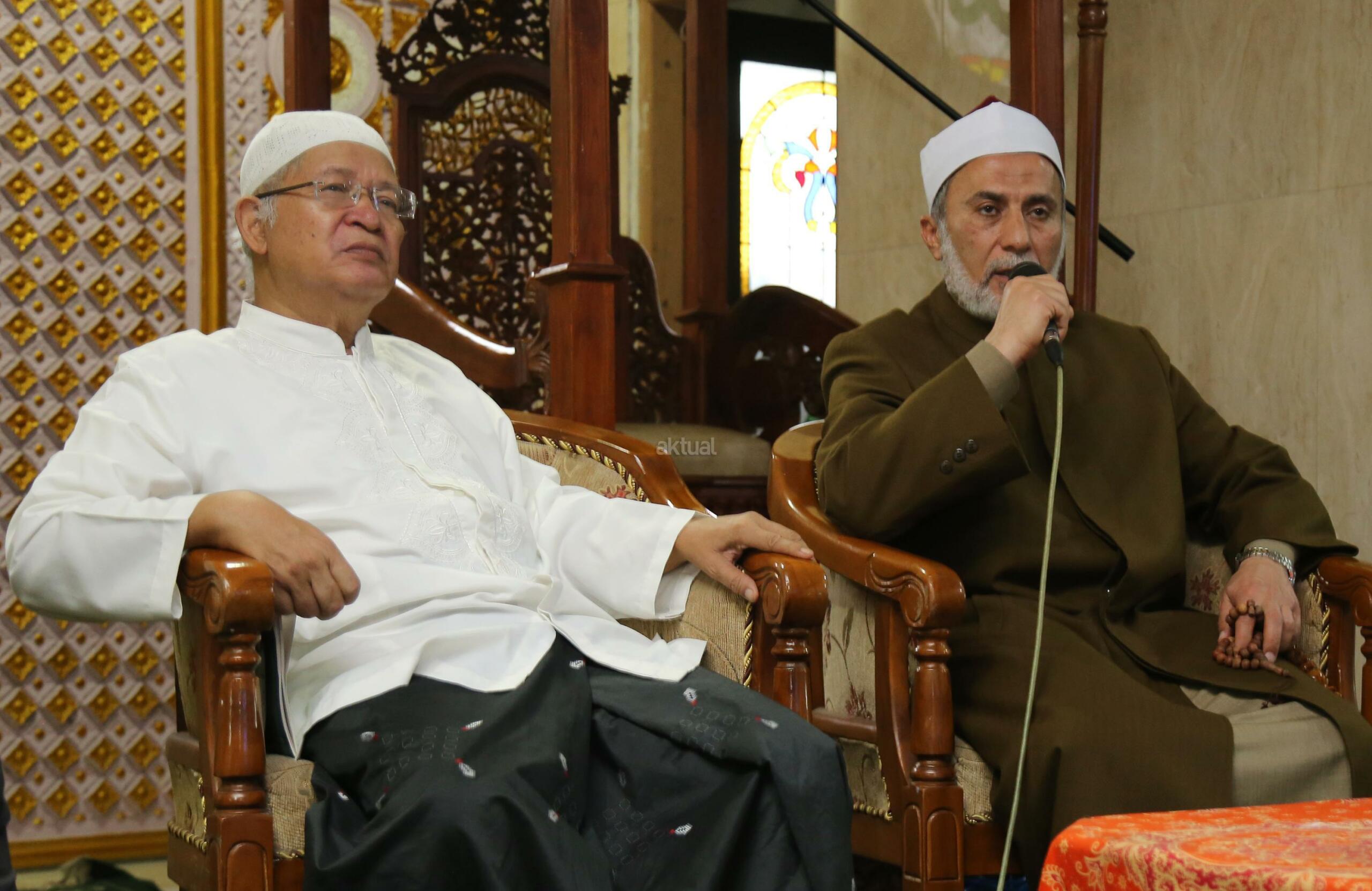 Maulana Syekh Yusri Rusydi Jabr Al Hasani didampingi Pengasuh Masjid dan Madrasah Arraudhah KH Asyari Tafsir saat beristirahat disela acara acara Majelis Ijazah Shalawat, Tahlil dan HaflahMaulid Akbar Nabi Muhammad SAW di Masjid Arraudhah, Desa Tambakasri, Tangkil, Tajinan, Malang, Jawa Timur, Jumat (27/1/2017). Dalam kesempatan tersebut, Syekh Yusri menjelaskan secara rinci Shalawat Yusriah, dimana Shalawat tersebut merupakan ilham yang beliau dapatkan saat melaksanakan ibadah umroh pada tahun 1432 H. AKTUAL/Tino Oktaviano