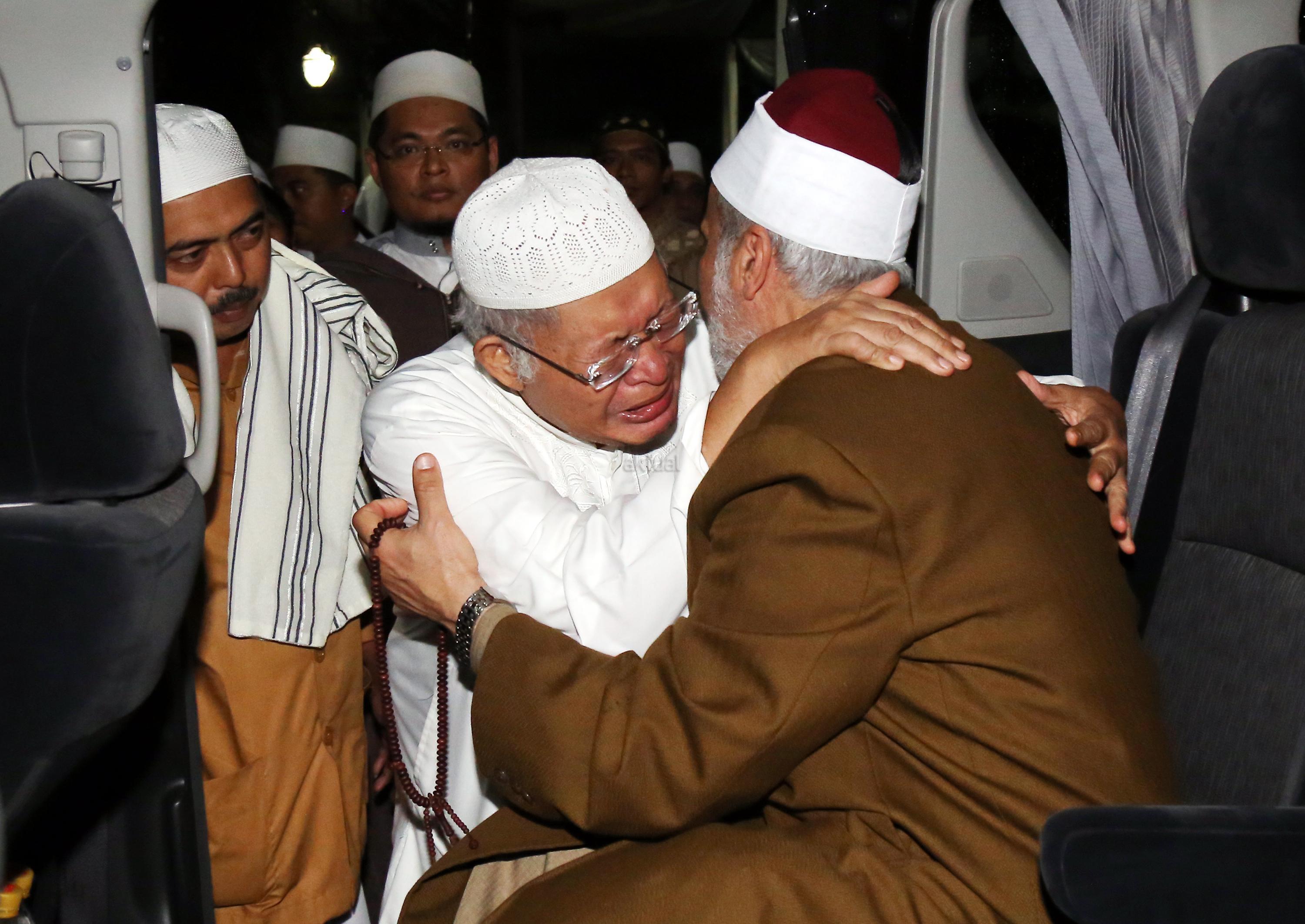 Maulana Syekh Yusri Rusydi Jabr Al Hasani berpamitan kepada Pengasuh Masjid dan Madrasah Arraudhah KH Asyari Tafsir mengikuti acara Majelis Ijazah Shalawat, Tahlil dan HaflahMaulid Akbar Nabi Muhammad SAW di Masjid Arraudhah, Desa Tambakasri, Tangkil, Tajinan, Malang, Jawa Timur, Jumat (27/1/2017). Dalam kesempatan tersebut, Syekh Yusri menjelaskan secara rinci Shalawat Yusriah, dimana Shalawat tersebut merupakan ilham yang beliau dapatkan saat melaksanakan ibadah umroh pada tahun 1432 H. AKTUAL/Tino Oktaviano