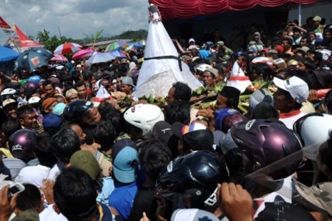 Gunungan tumpeng ukuran besar ditandu oleh empat laki-laki, seorang lainnya berjalan paling depan sambil membawa wadah berisi kemenyan.