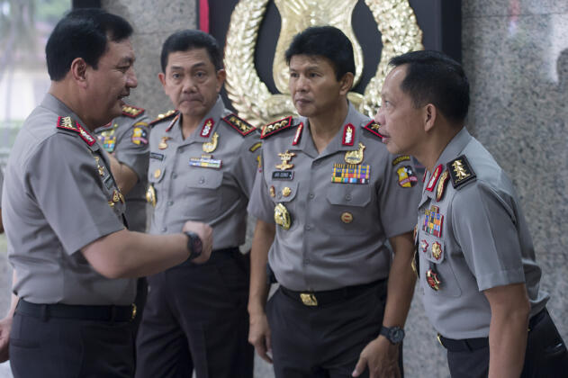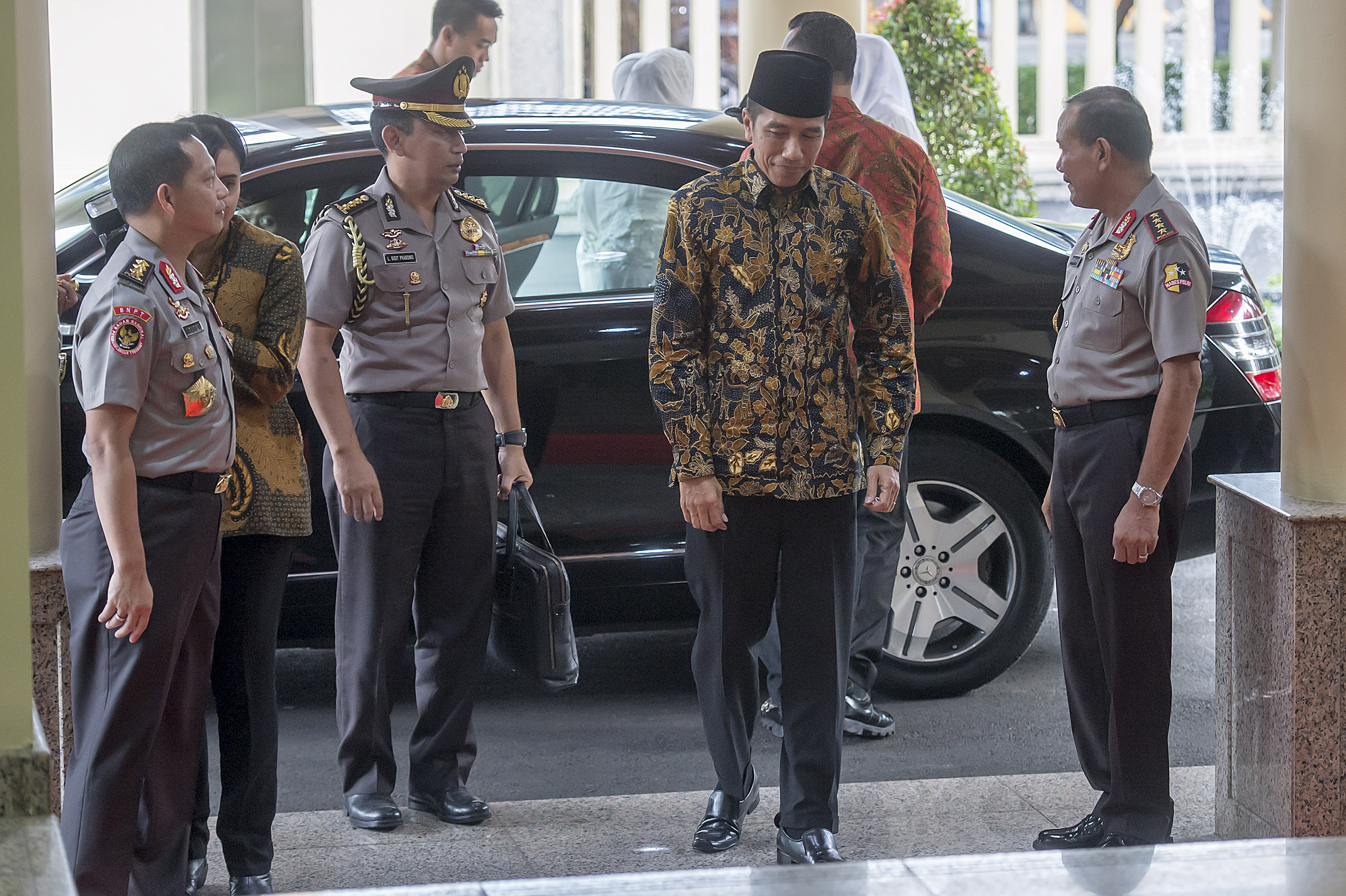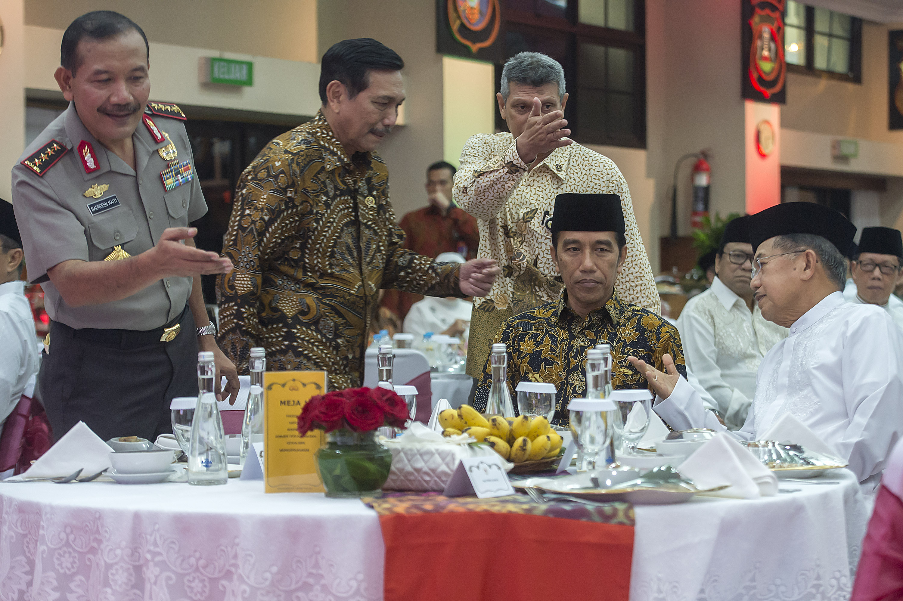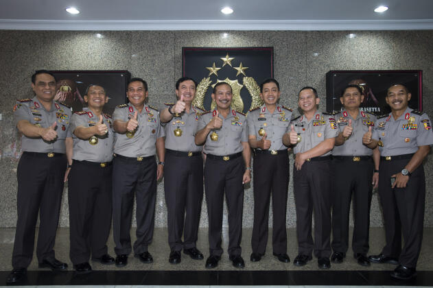 Kapolri Jenderal Pol Badrodin Haiti (kelima kiri) dan Wakil Kapolri Komjen Pol Budi Gunawan (keempat kiri) beserta jajaran perwira tinggi Polri lainnya berfoto bersama sebelum menyambut kedatangan Presiden Joko Widodo di Mabes Polri, Jakarta, Jumat (1/7). Presiden Joko Widodo menghadiri acara Syukuran Hari Bhayangkara ke-70 Tahun 2016 dan Buka Puasa Bersama keluarga besar Polri. ANTARA FOTO/Widodo S. Jusuf/foc/16.