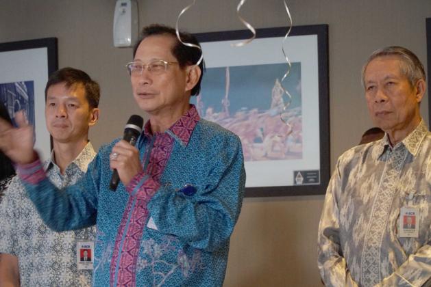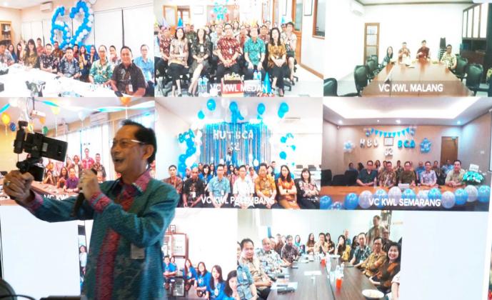 Presiden Direktur BCA Jahja Setiaatmadja (kedua kanan) bersama Presiden Komisaris BCA Djohan Emir Setijoso (kiri) dan jajaran manajemen BCA usai melakukan pemotongan tumpeng sebagai ungkapan syukur memperingati HUT ke-62 BCA di Jakarta, Kamis (21/02). Berdiri kokoh sebagai institusi perbankan swasta terbesar di Indonesia, BCA kini telah melayani lebih dari 18,5 juta rekening nasabah di pelosok Tanah Air. Menyemarakkan HUT ke-62 BCA, BCA akan menggelar perhelatan BCA Expoversary pada 22-24 Februari mendatang di ICE BSD, Tangerang. AKTUAL/STR-Eko S Hilman