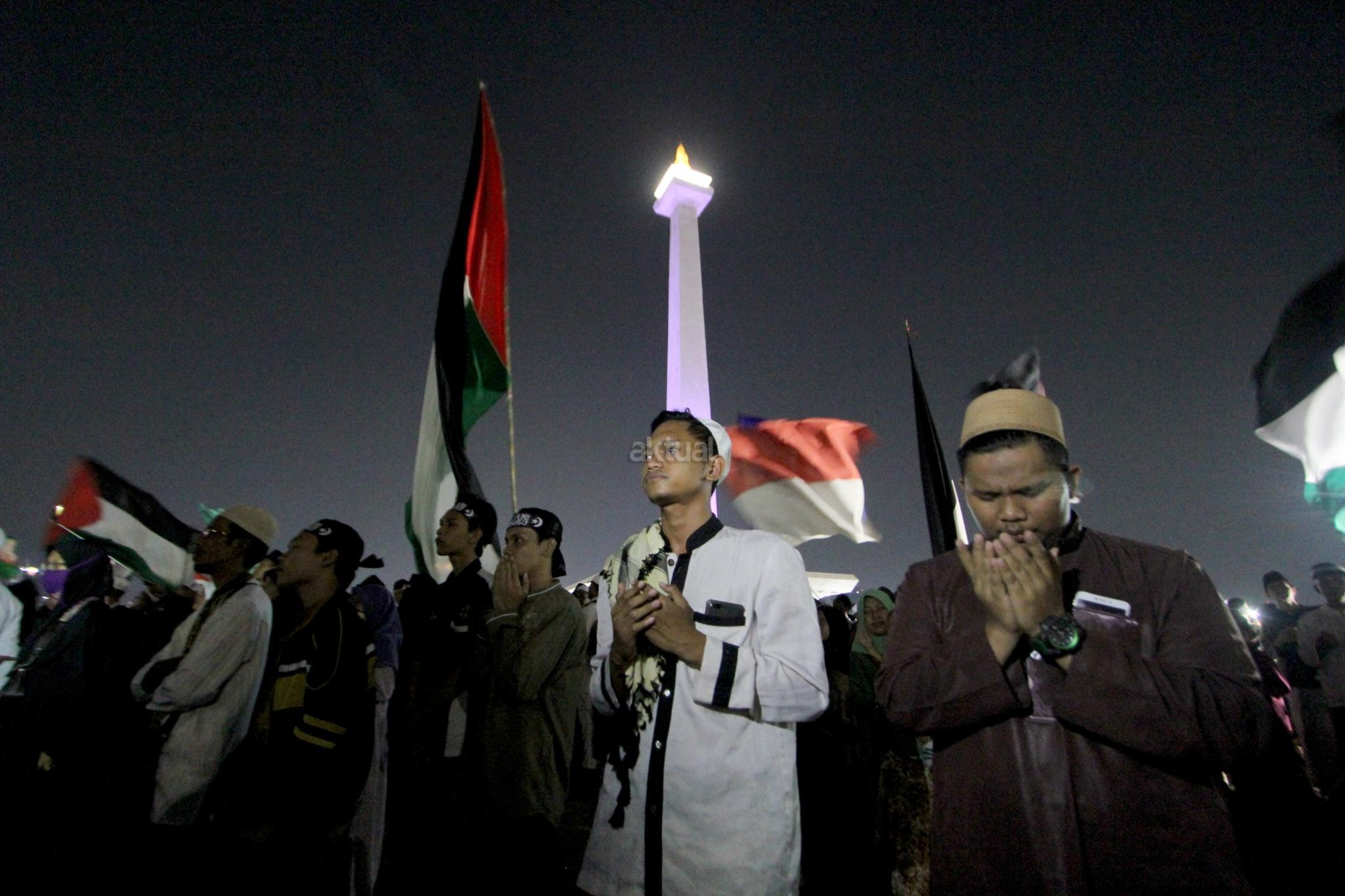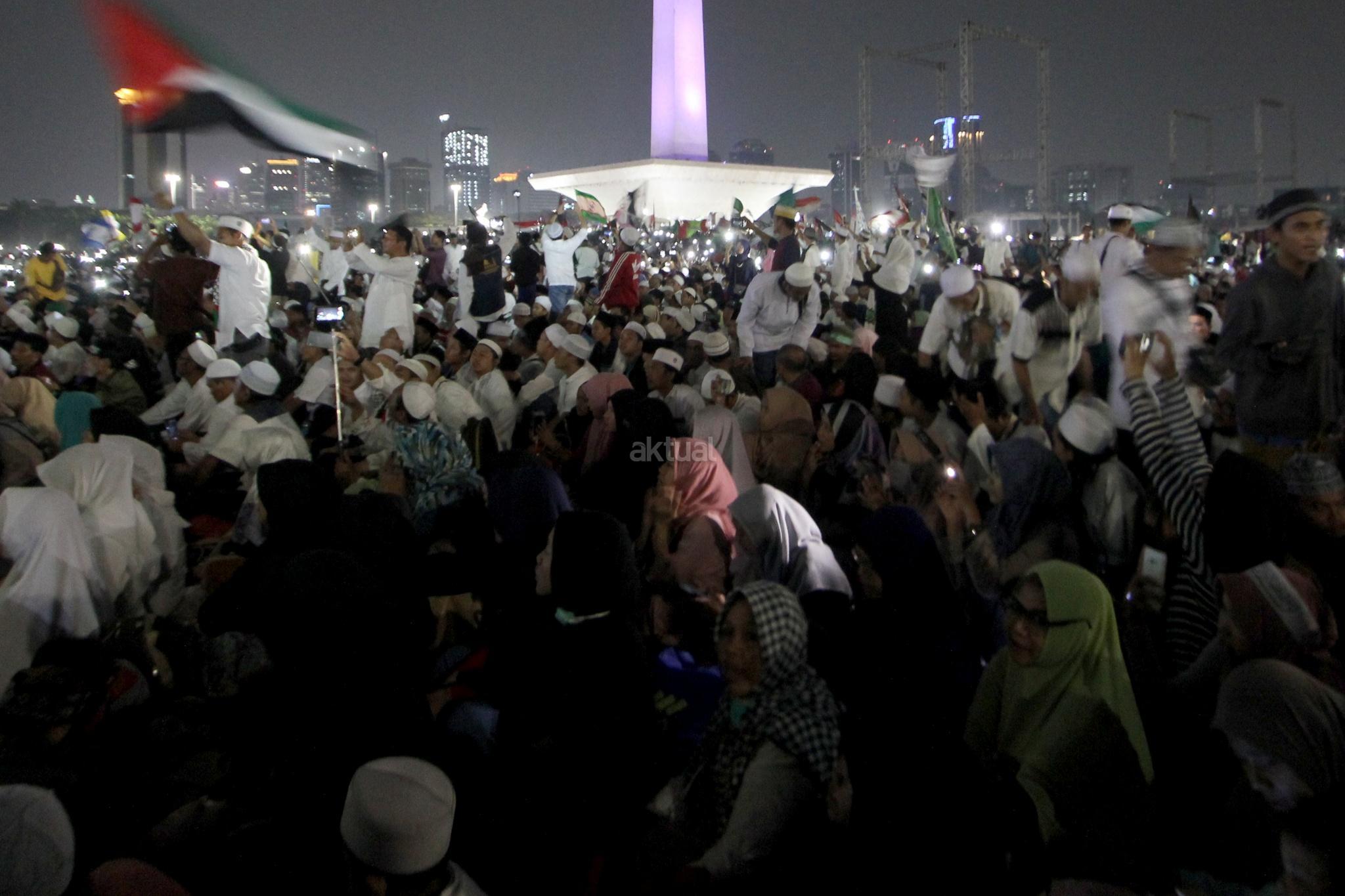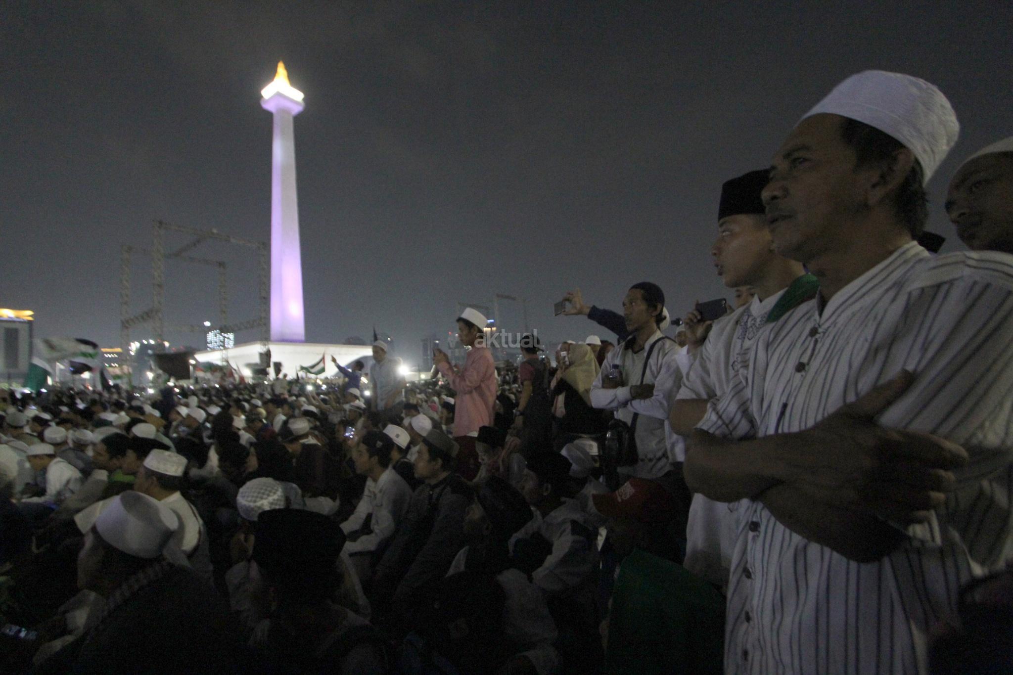 Ribuan umat muslim melakukan Tabligh Akbar dan Doa Keselamatan Bangsa di Monas, Jakarta, Sabtu (29/9) malam. Acara tersebut diisi zikir, santunan anak yatim, tausyiah dan doa untuk bangsa. AKTUAL/Tino Oktaviano