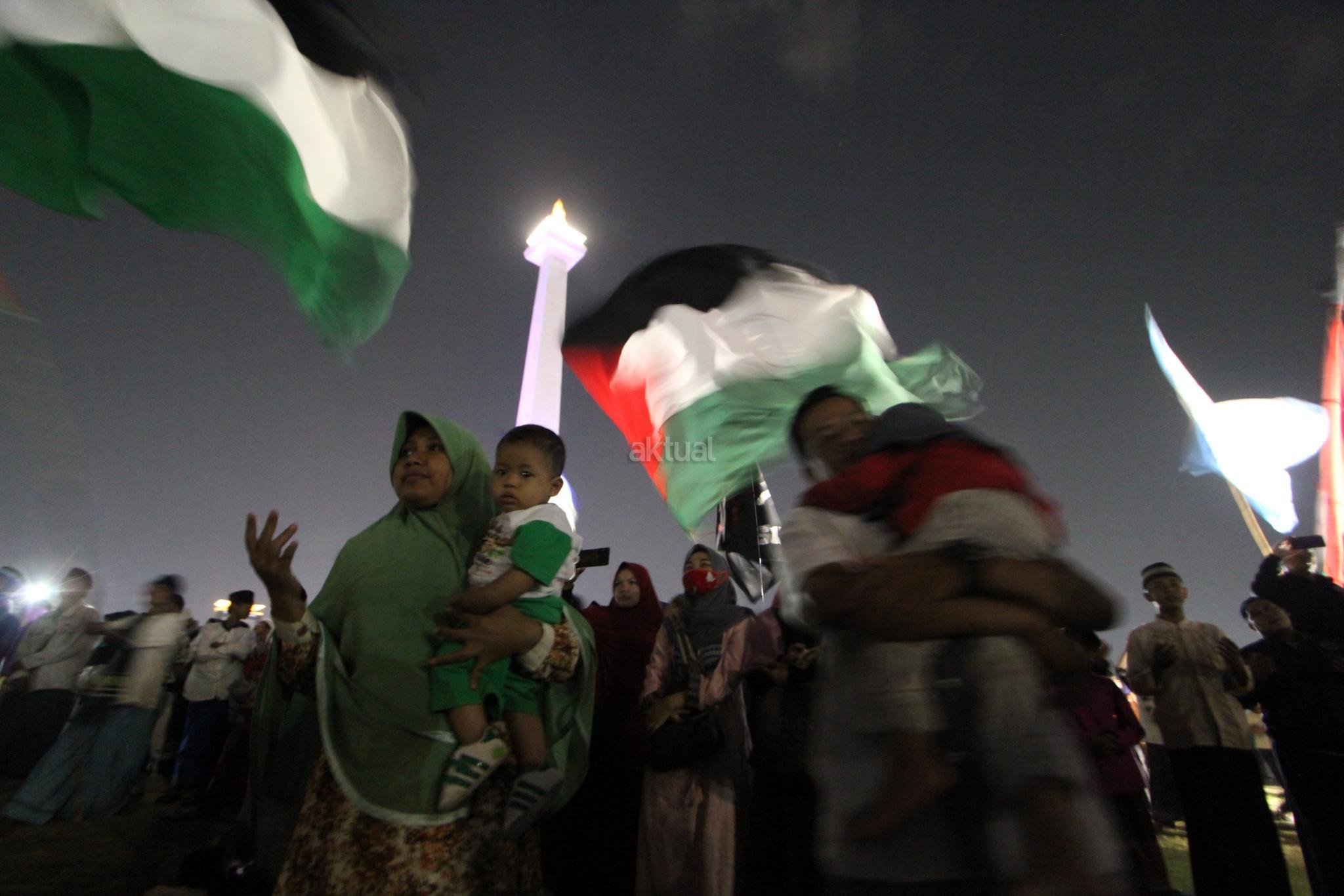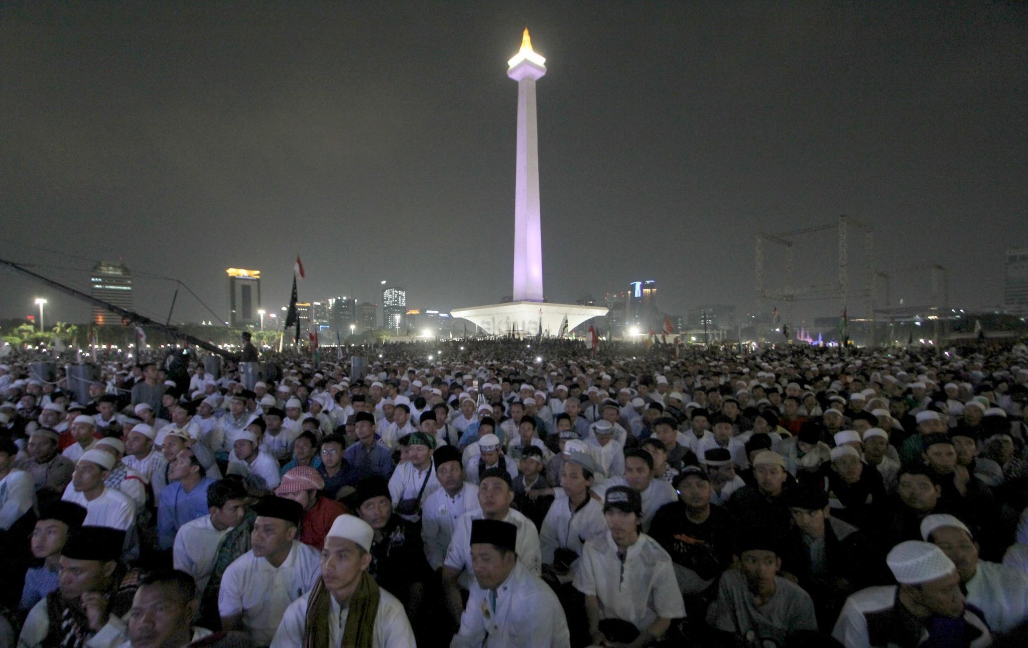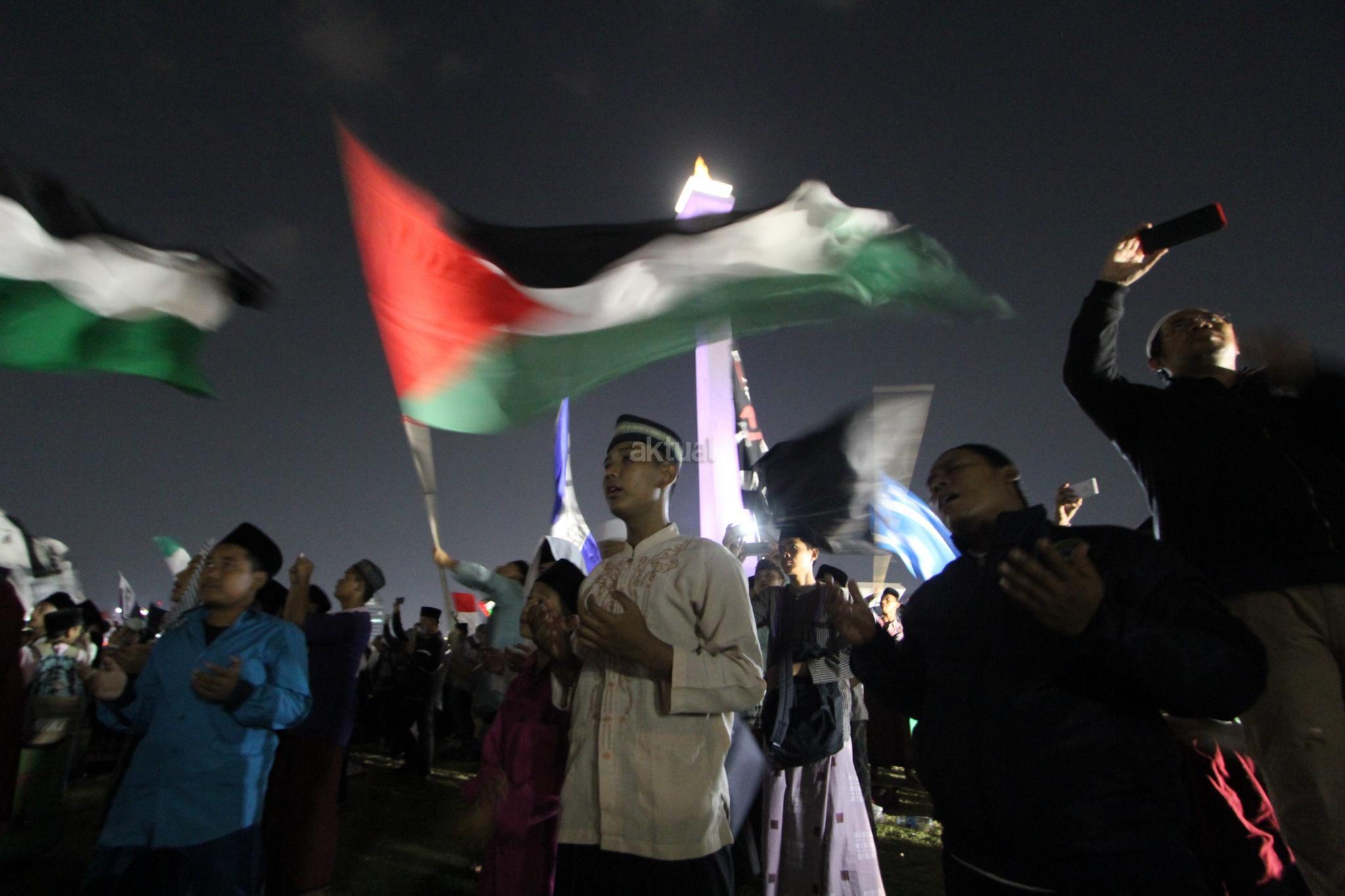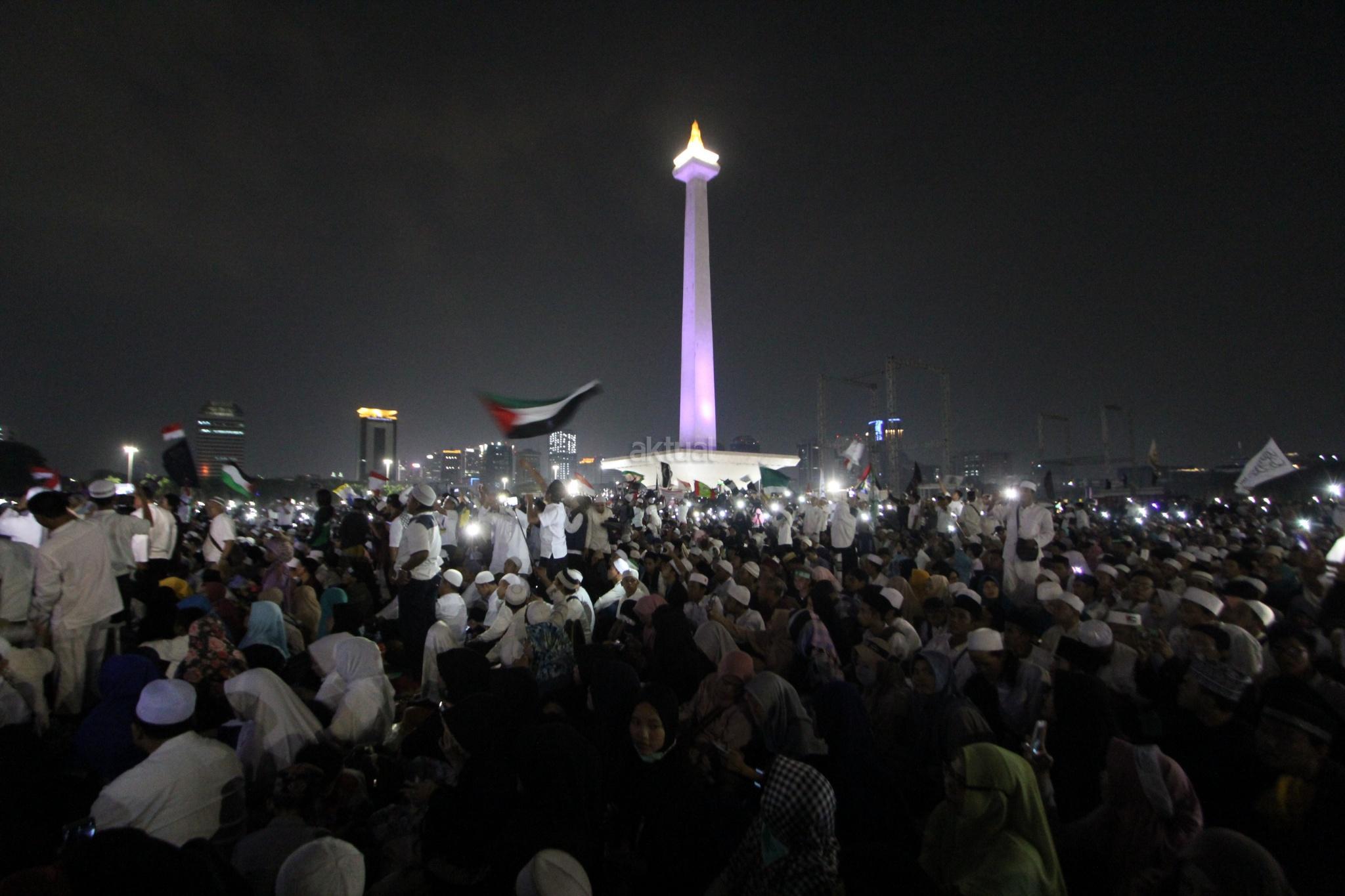 Ribuan umat muslim melakukan Tabligh Akbar dan Doa Keselamatan Bangsa di Monas, Jakarta, Sabtu (29/9) malam. Acara tersebut diisi zikir, santunan anak yatim, tausyiah dan doa untuk bangsa. AKTUAL/Tino Oktaviano