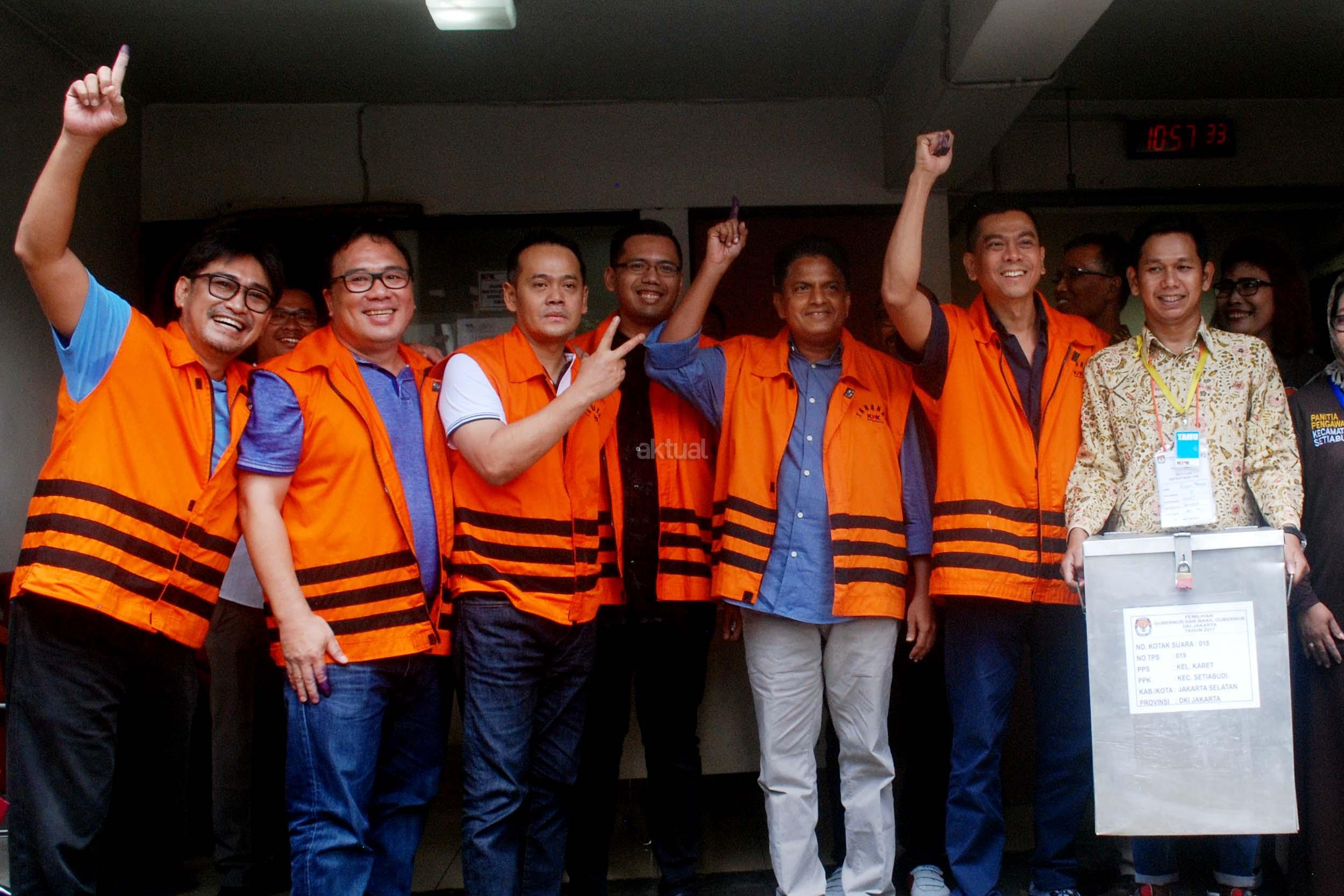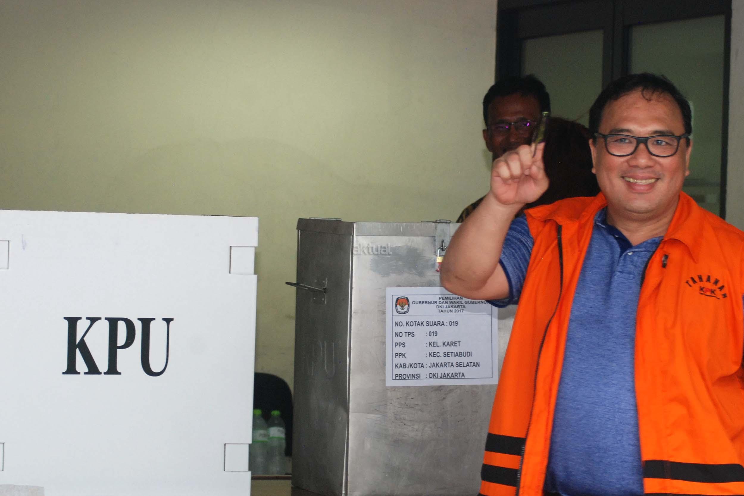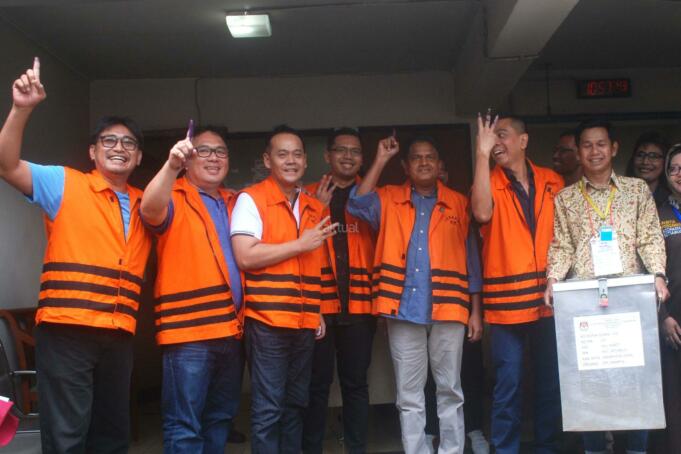 Para tahanan KPK berfoto bersama usaimenggunakan hak pilih di TPS 19, Gedung KPK, Jakarta, Rabu (15/2/2017). Sebanyak tujuh orang dari 10 tahanan KPK menyalurkan suara pada Pilkada DKI Jakarta 2017.