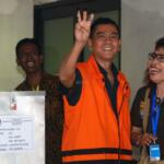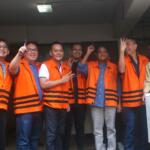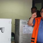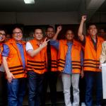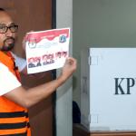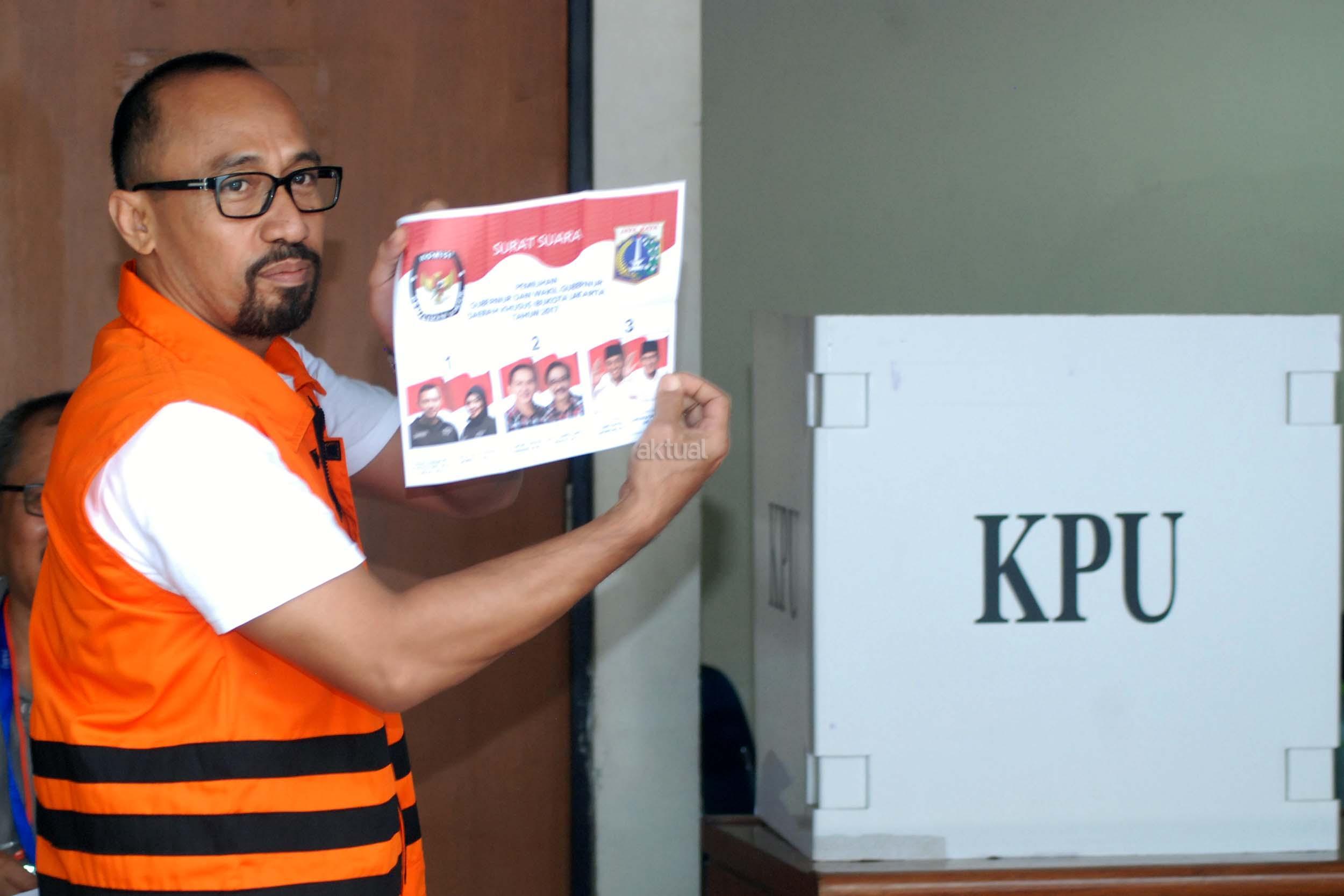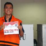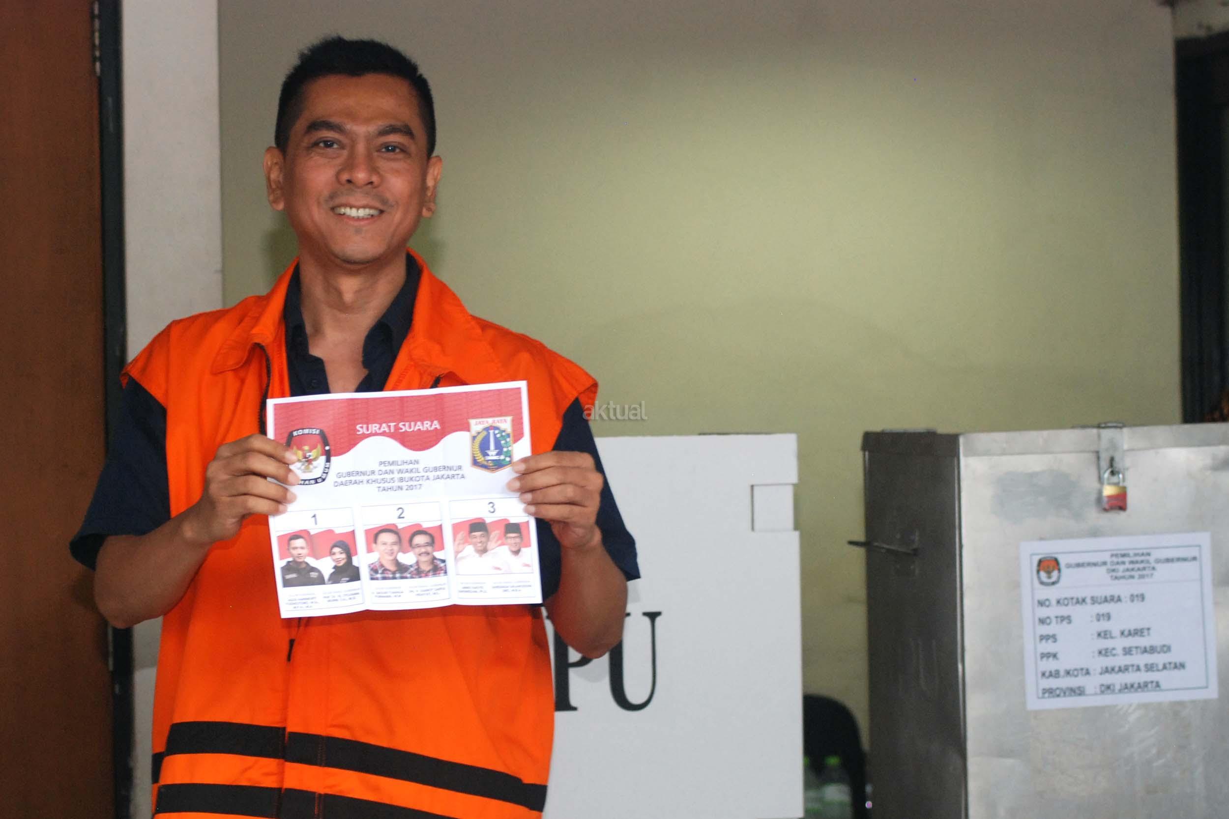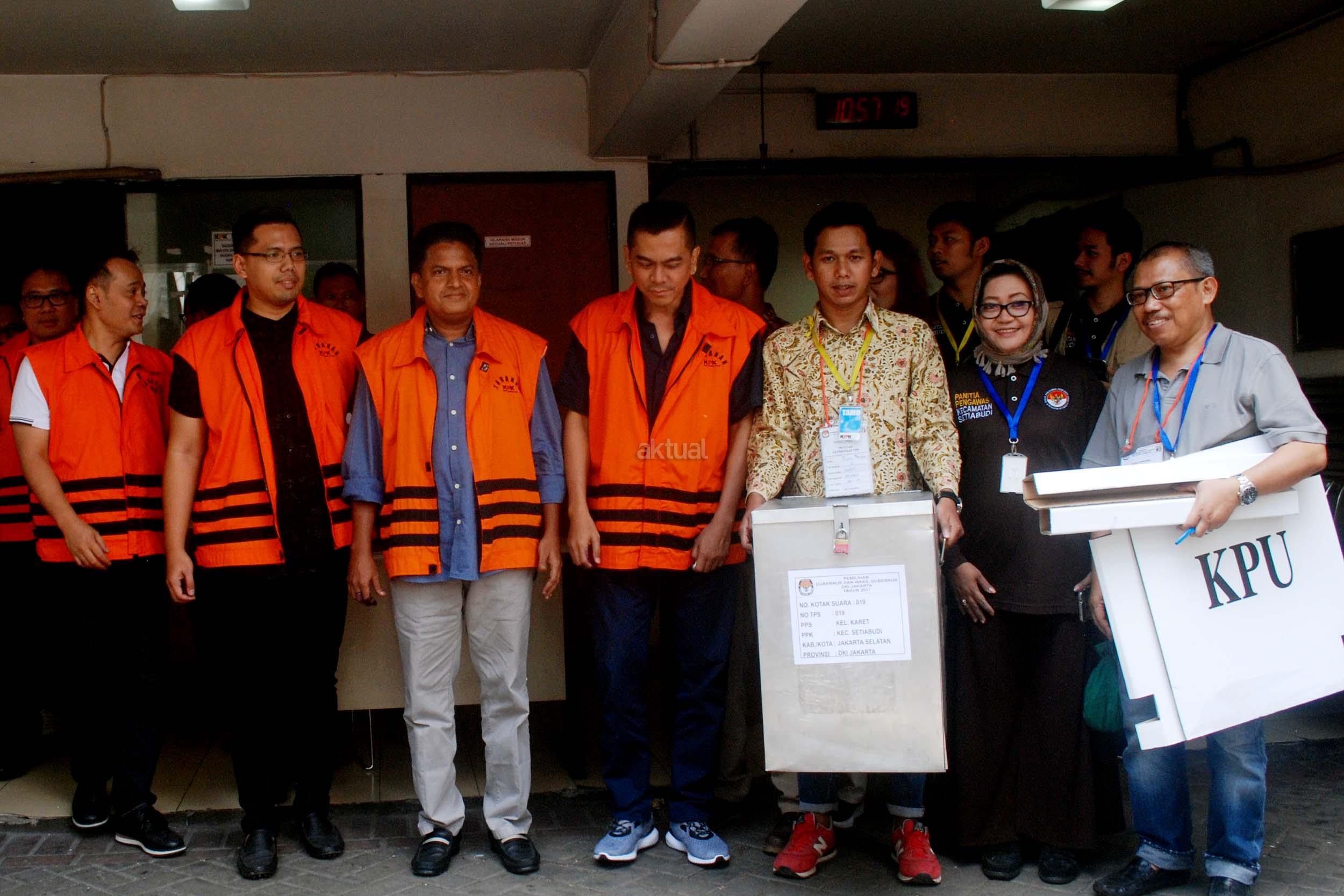 Para tahanan KPK berfoto bersama usaimenggunakan hak pilih di TPS 19, Gedung KPK, Jakarta, Rabu (15/2/2017). Sebanyak tujuh orang dari 10 tahanan KPK menyalurkan suara pada Pilkada DKI Jakarta 2017.