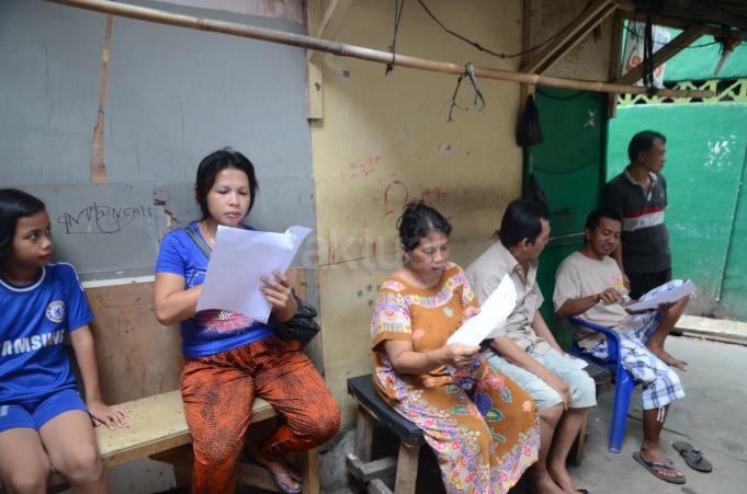 Warga membaca surat peringatan dari pemprov DKI Jakarta di salah satu kafe di Kalijodo, Jakarta, Kamis (18/2). Pemprov DKI Jakarta memberikat surat peringatan ke-1 (SP1) terkait penertiban kawasan Kalijodo.