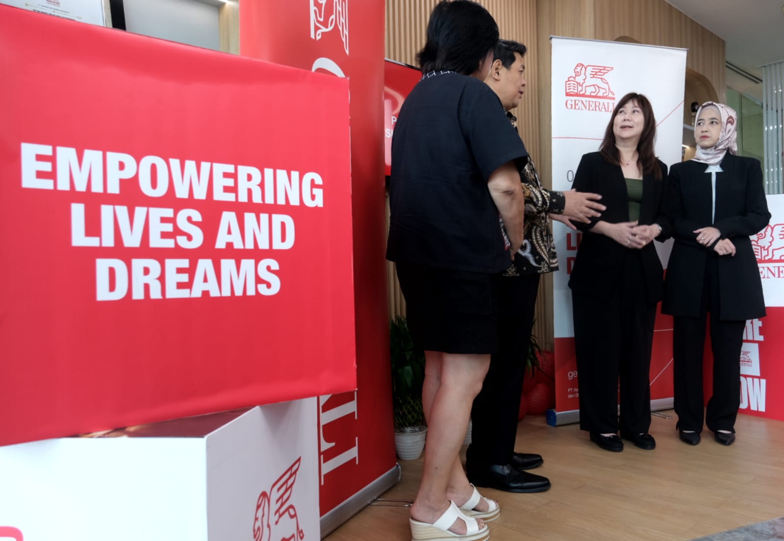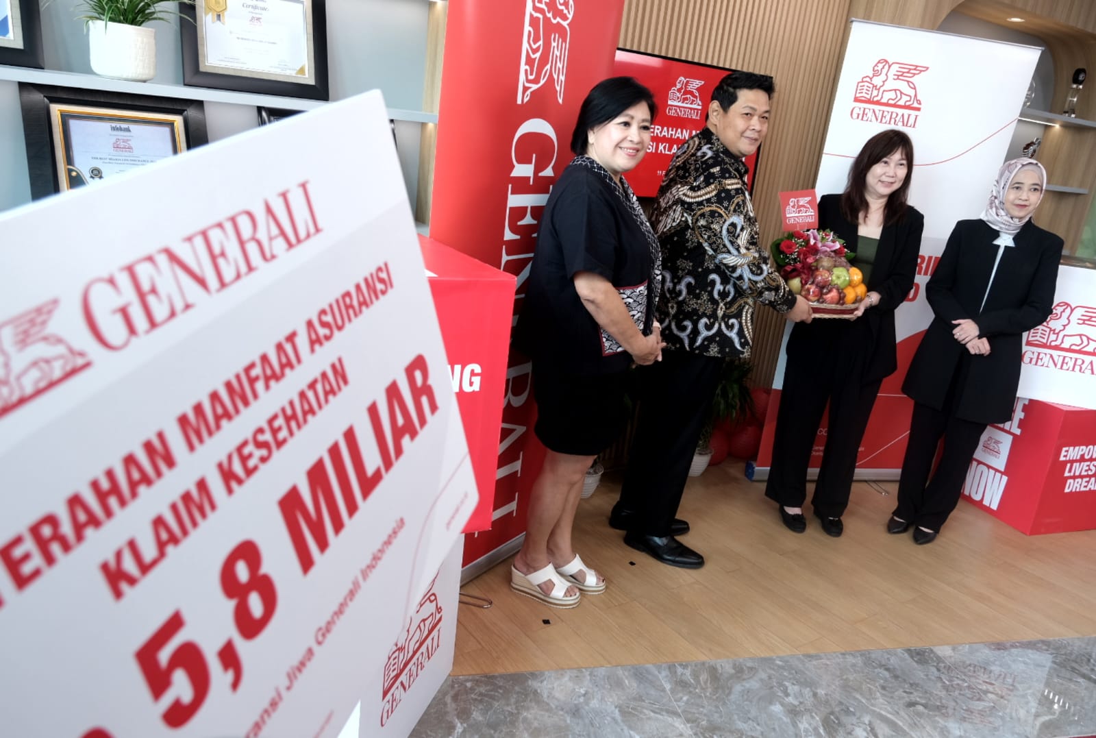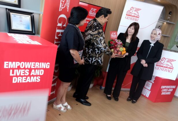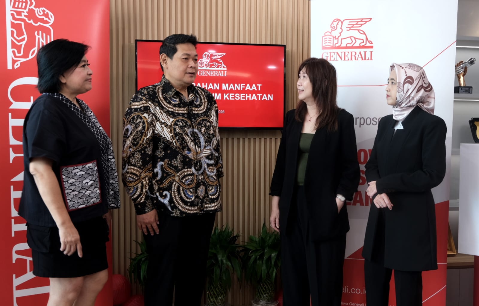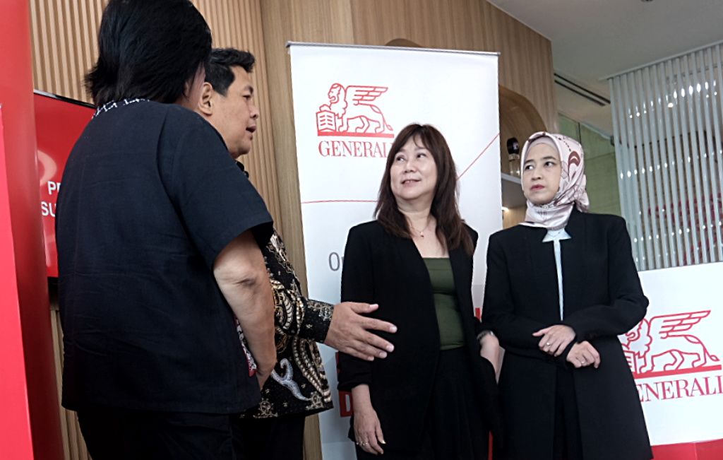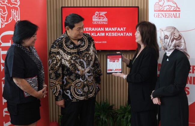 Director and Chief Agency Officer Generali Indonesia, Jutany Japit (kedua kanan) didampingi Operations Group Head Generali Indonesia, Suzwamela Zawawi (kanan) ramah tamah sekaligus seremoni penyerahan klaim manfaat asuransi kesehatan kepada nasabah, Bintoro (kedua kiri) dan Financial Planner, Lilie (kiri), di Kantor Pusat Generali Indonesia, Jakarta, Rabu (11/2/2026).