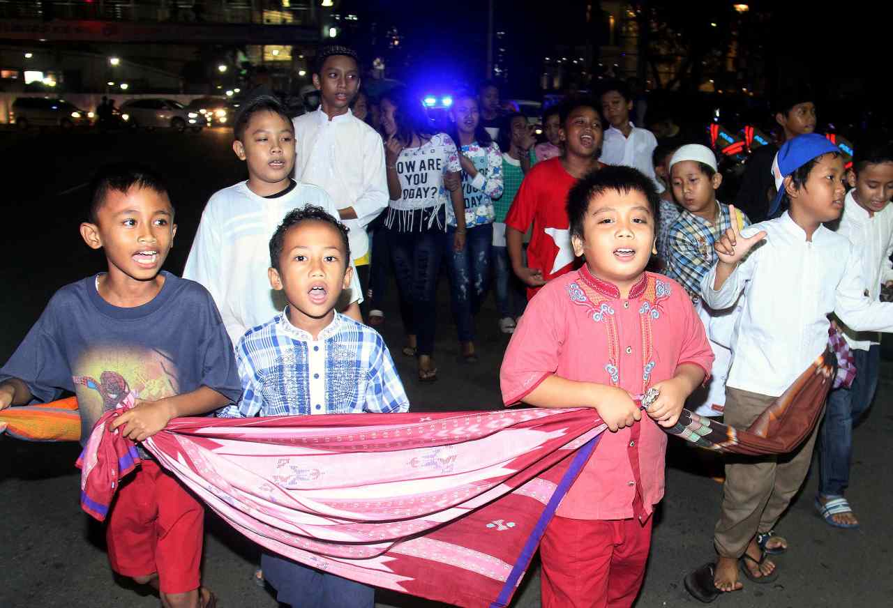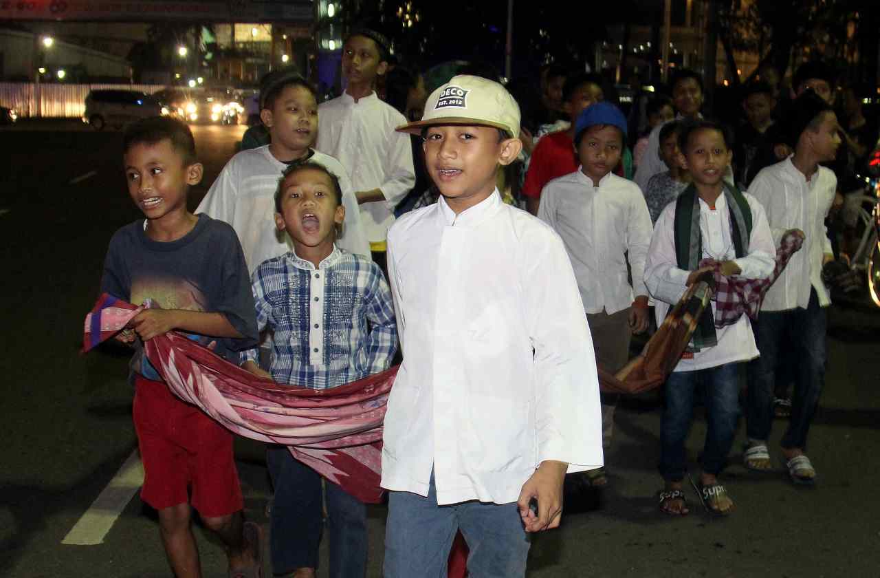 Sejumlah anak kecil mengumandangkan takbir sambil berkeliling di kawasan Bunderan HI, Jakarta,Selasa (5/7/2016). Bagi Umat Muslim Indonesia mengumandangkan Takbir ialah sebagai suatu tanda menyambut hari Raya Idul Fitri 1437 Hijriah.