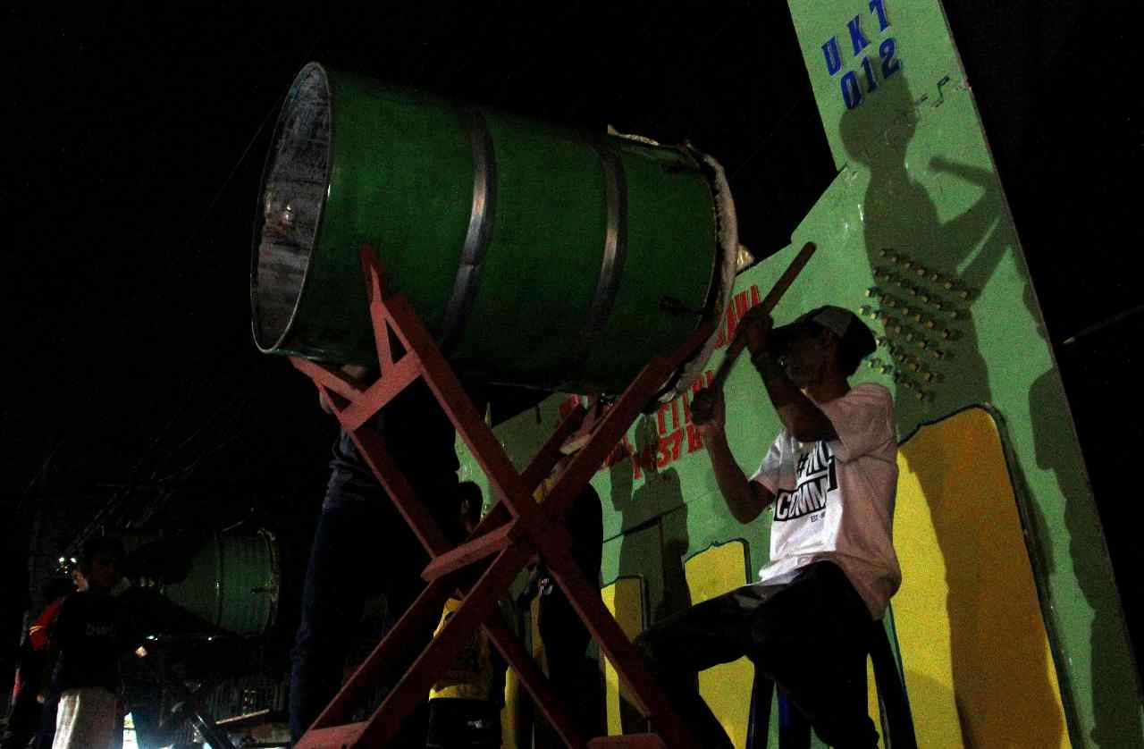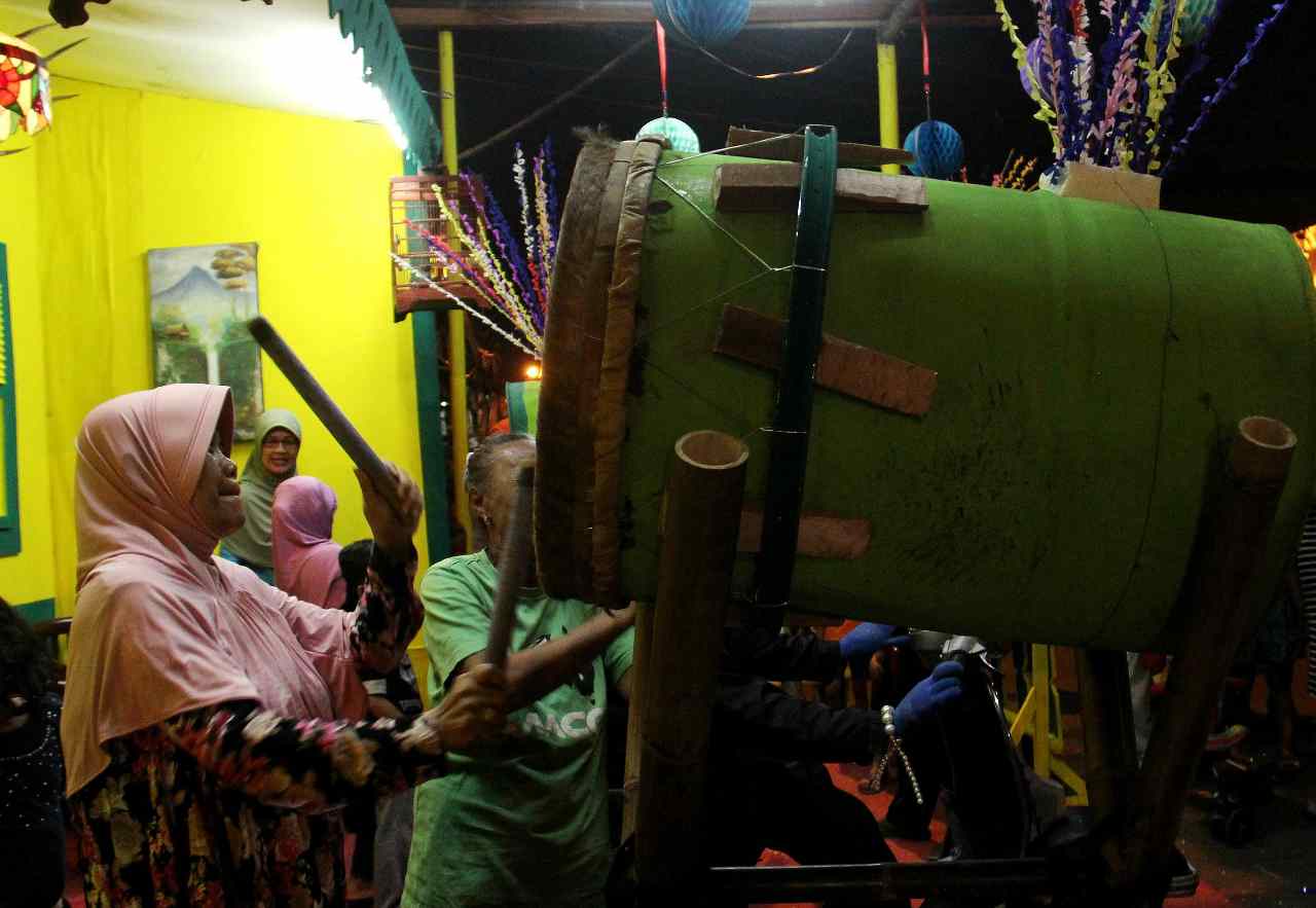Warga melakukan memukul bedug sambil takbir guna menyambut Hari Raya Idul Fitri 1437 H di jalan Tambak, Jakarta, Selasa (5/7/2016). Pemerintah menetapkan Idul Fitri 1437 H jatuh pada Rabu (6/7/2016).