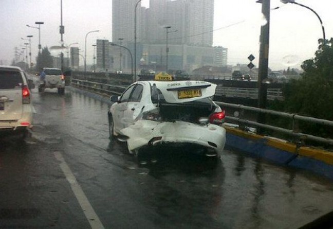 Antara Taxi dan kendaraan pribadi jenis Toyota Rush. Dari foto yang terpampang, terlihat bagian belakang taxi berwarna putih itu ringsek. Kemungkinan ditabrak dari belakang.