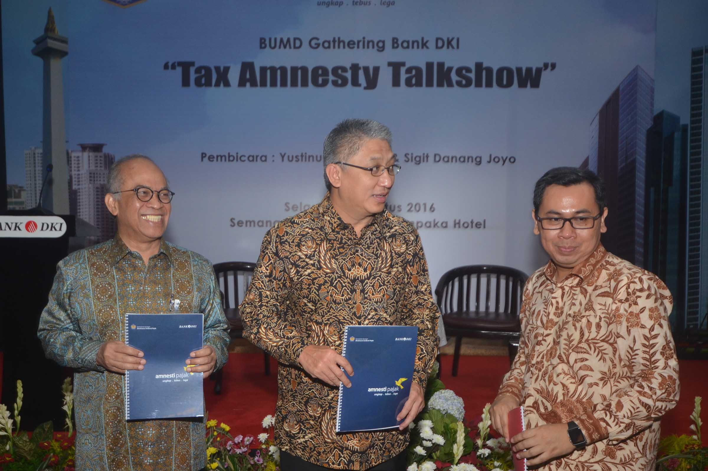 Komisaris Utama Bank DKI,Honggo Kangmasto Widjojo( tengah) , Dirut,Kresno Sediarsi (kiri), Direktur Centre for Indonesia Taxation Analysis, Yustinus Prastowo berbincang sesaat sebelum melakukan talkshow di Jakarta, 30 Agustus 2016 . Kegiatan sosialisasi dan talkshow yang mengambil tema Tax Amnesty tersebut dilakukan dalam rangka BUMD Gathering Bank DKI