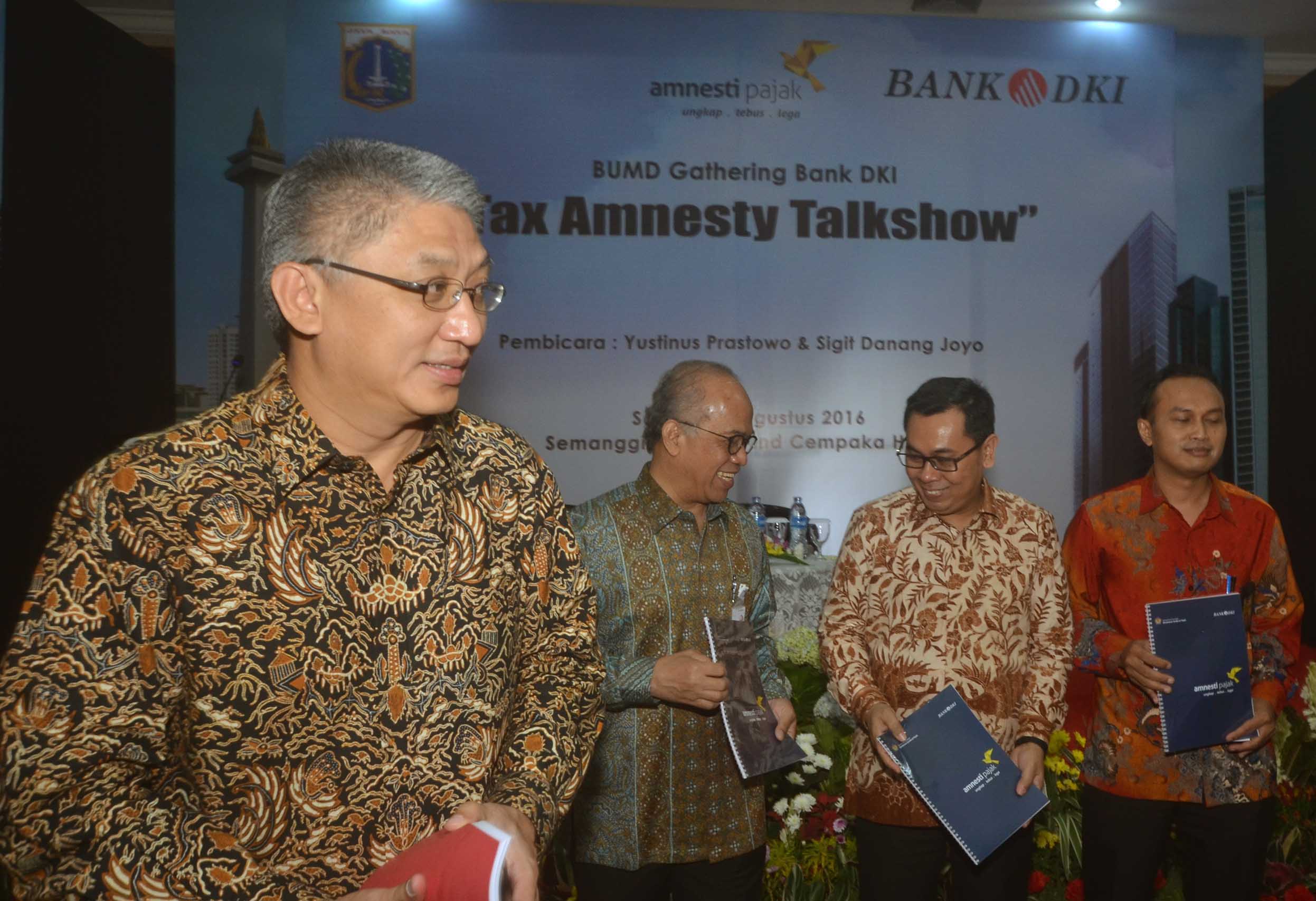Komisaris Utama Bank DKI,Honggo Kangmasto Widjojo( tengah) , Dirut,Kresno Sediarsi (kiri), Direktur Centre for Indonesia Taxation Analysis, Yustinus Prastowo serta Kepala Sub Direktorat Bantuan Hukum Direktorat Jenderal Pajak, Sigit Danang Joyo sesaat sebelum melakukan talkshow di Jakarta, 30 Agustus 2016 . Kegiatan sosialisasi talkshow yang mengambil tema Tax Amnesty tersebut dilakukan dalam rangka BUMD Gathering Bank DKI