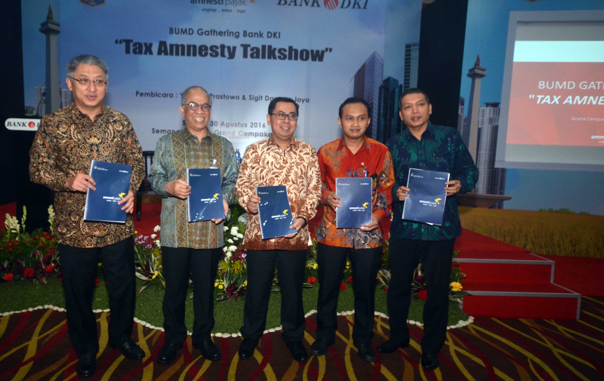 (dari kiri ke kanan) Komisaris Utama Bank DKI,Honggo Kangmasto Widjojo, Dirut Bank DKI,Kresno Sediarsi , Direktur Centre for Indonesia Taxation Analysis, Yustinus Prastowo ,serta Kepala Sub Direktorat Bantuan Hukum Direktorat Jenderal Pajak, Sigit Danang Joyo dan dipandu Direktur Riset Infobank selaku moderator , Eko B Supriyanto berfoto bersama sesaat sebelum melakukan talkshow di Jakarta, 30 Agustus 2016 . Kegiatan talkshow bertema Tax Amnesty tersebut dilakukan dalam rangka BUMD Gathering Bank DKI.