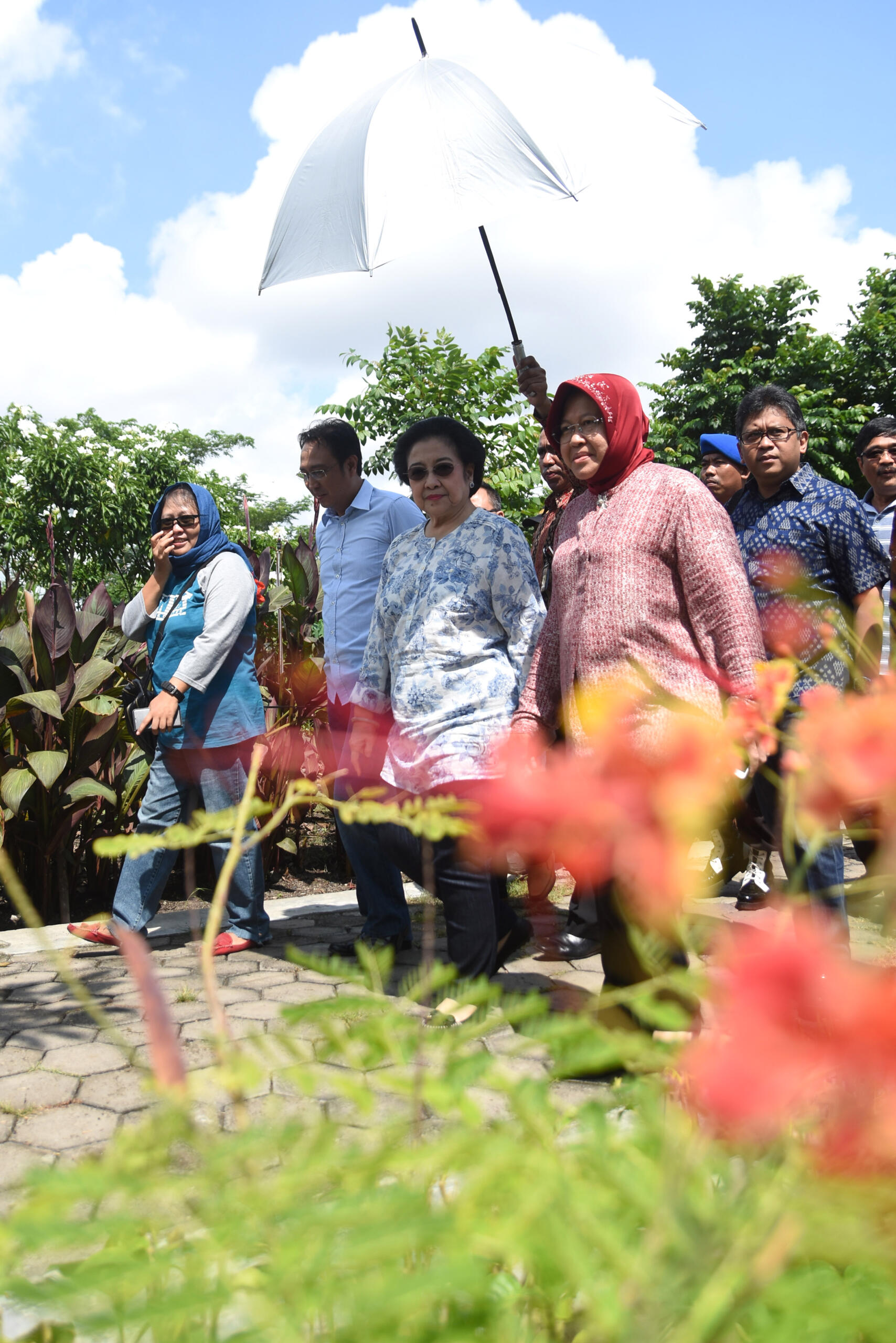 Ketua Umum DPP PDI Perjuangan Megawati Soekarnoputri (ketiga kanan) didampingi Sekjen DPP PDI Perjuangan Hasto Krisyanto (kanan) dan Walikota Surabaya Tri Rismaharini (kedua kanan) berkunjung ke Taman Harmoni, Surabaya, Jawa Timur, Minggu (1/5). Taman Harmoni yang luasnya sekitar 60 hektar tersebut dahulu merupakan tempat pembuangan sampah (TPS). ANTARA FOTO/M Risyal Hidayat/ama/16