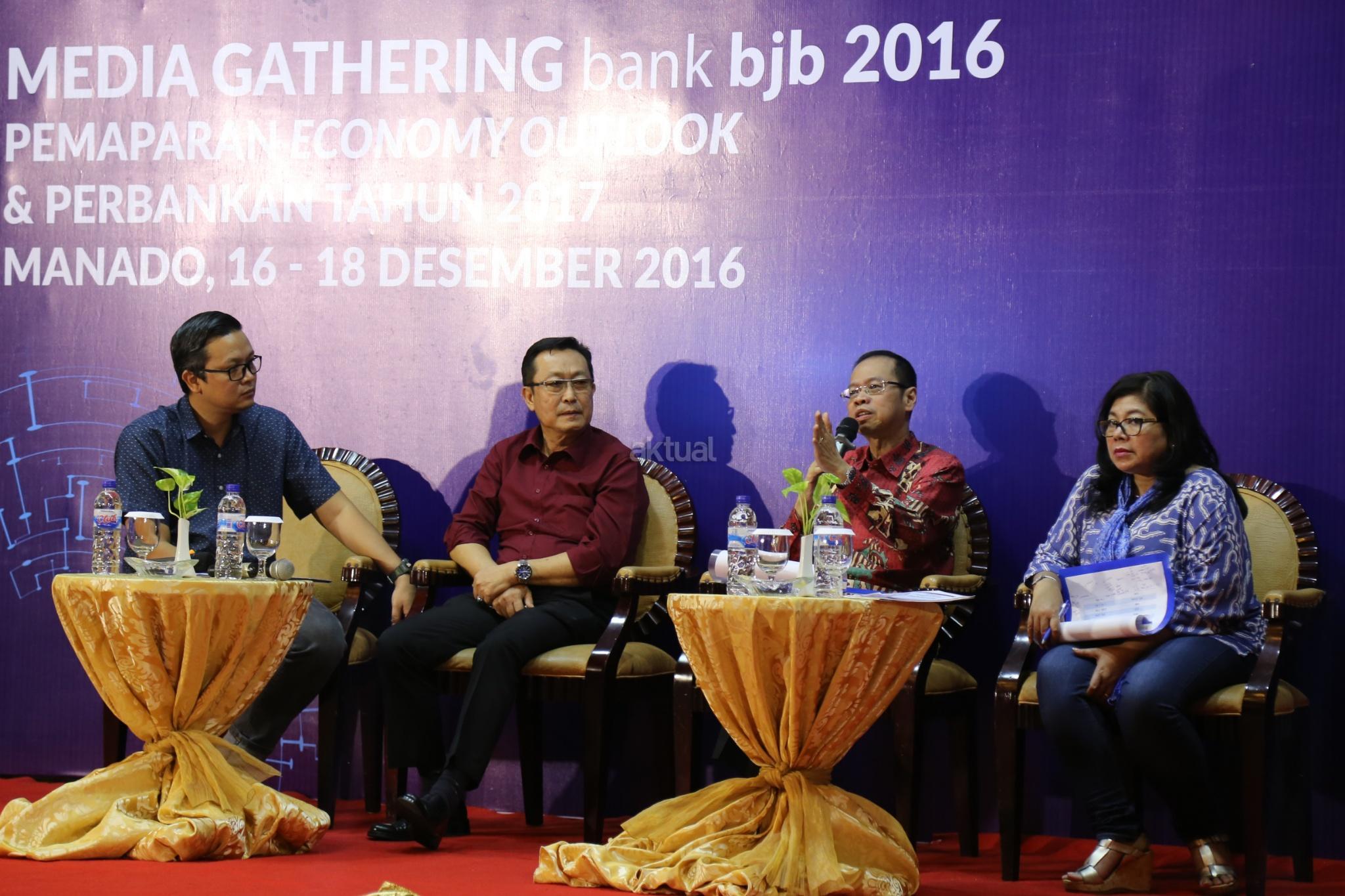 Direktur Utama bank bjb Ahmad Irfan (tengah) didampingi Direktur Konsumer Fermiyanti (kanan) dan Dekan Fakultas Ekonomi & Bisnis Universitas Sam Ratulangi Herman Karamoy (kiri) saat pemaparan Economy Outlook & Perbankan tahun 2017 di Manado, Sulawesi Utara, Jumat (16/12). Untuk kinerja keuangan tahun 2017, bank bjb menargetkan pertumbuhan kredit sebesar 12-13 persen serta mendorong Dana Pihak Ketiga untuk tumbuh sekitar 14-15 persen, sementara pertumbuhan ekonomi Indonesia diprediksi akan tumbuh stabil pada kisaran 5-5,4 persen. AKTUAL/Tino Oktaviano