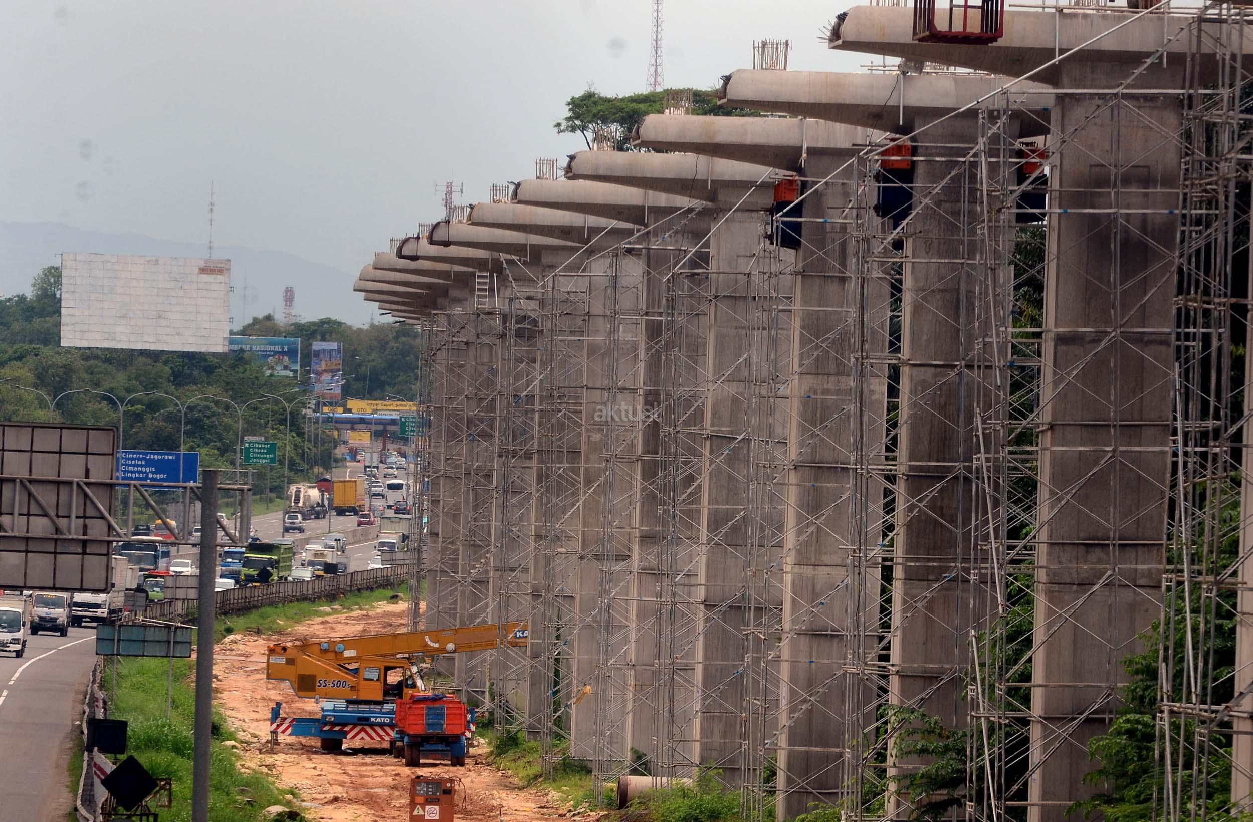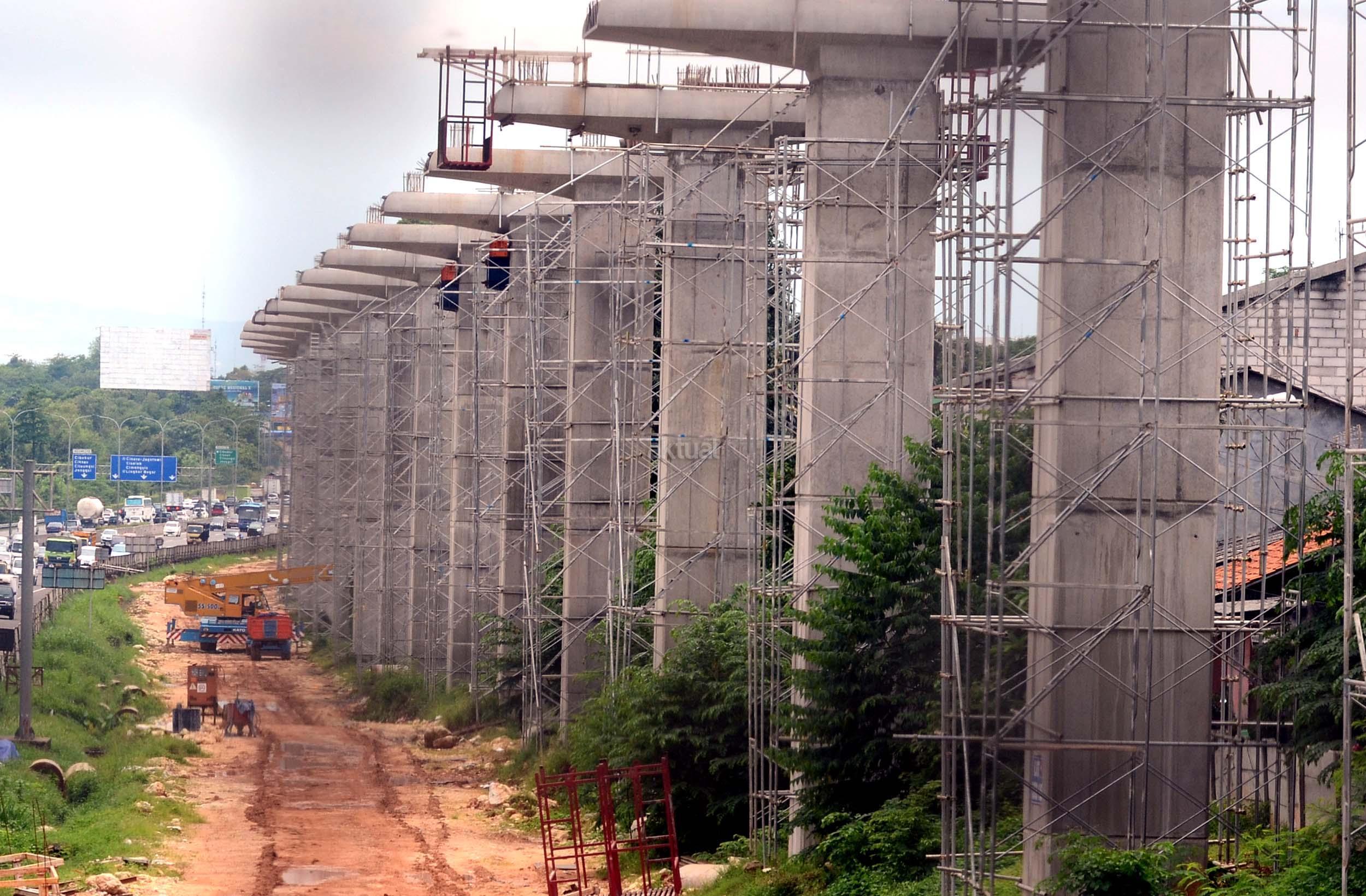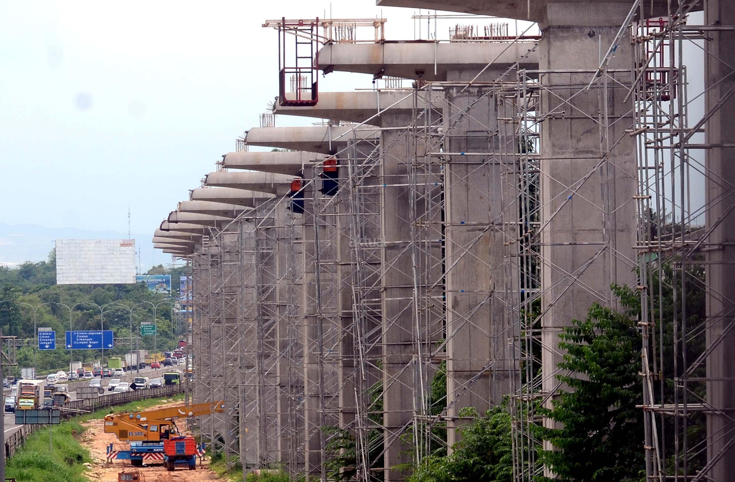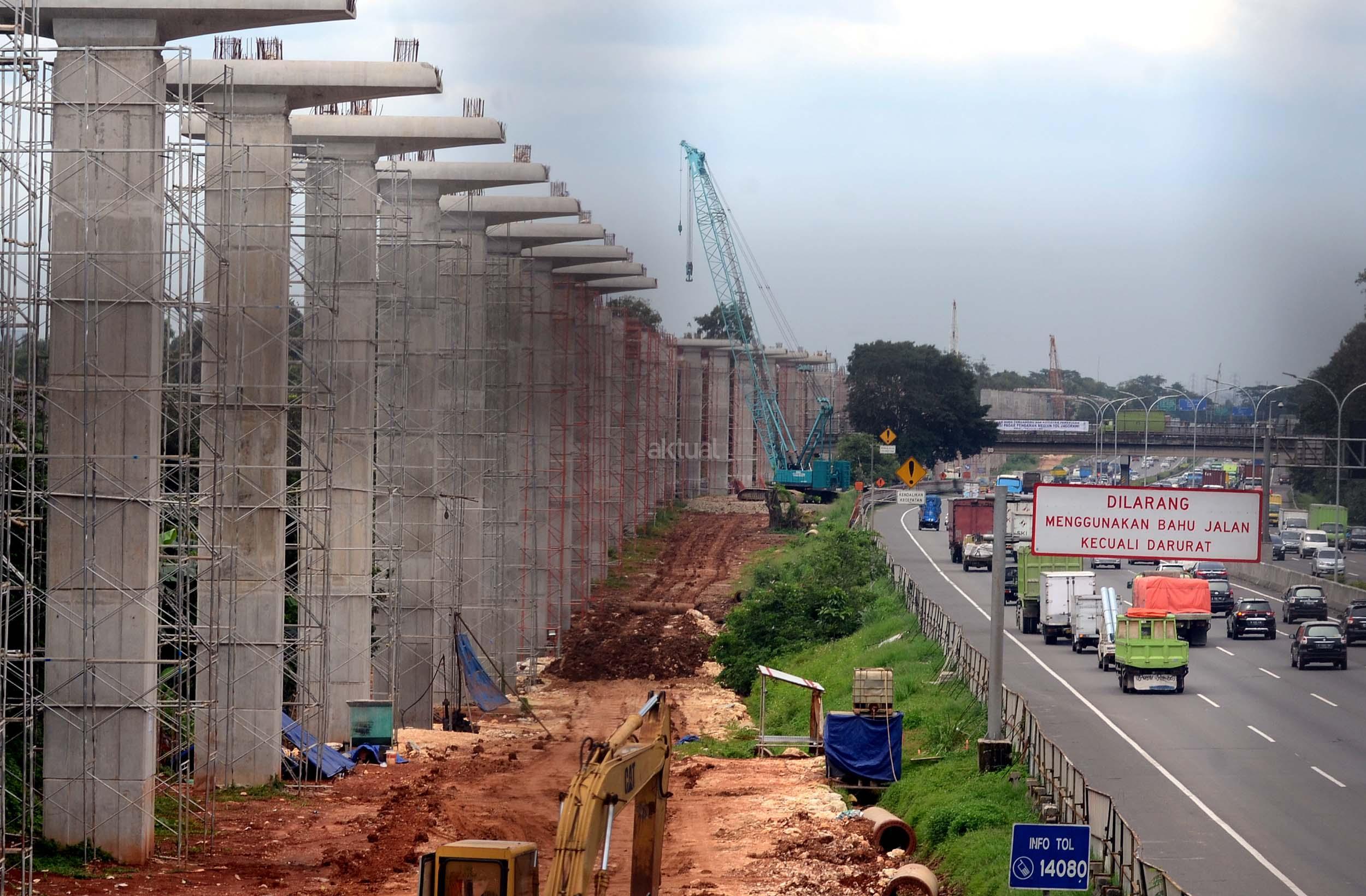 Lokasi pembangunan Proyek Light Rail Transit (LRT) di sepanjang Tol Jagorawi, Cibubur, Jakarta Timur, Selasa (8/11/2016). Pembangunan LRT sudah mencapai 6,5 persen di rute Cibubur-Cawang, Bekasi Timur-Cawang, Cawang-Dukuh Atas, yang ditargetkan rampung pada tahun 2018. AKTUAL/Munzir