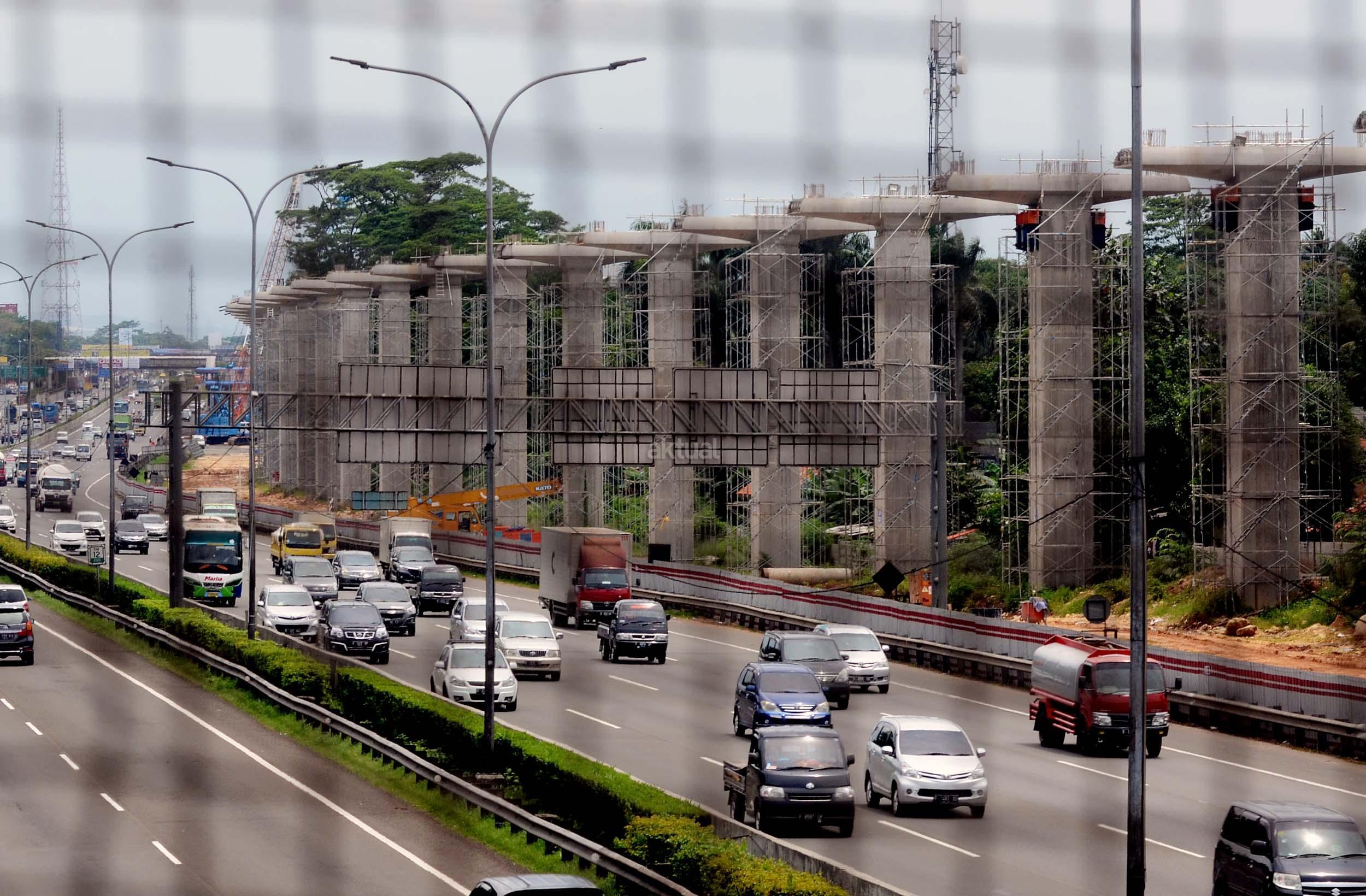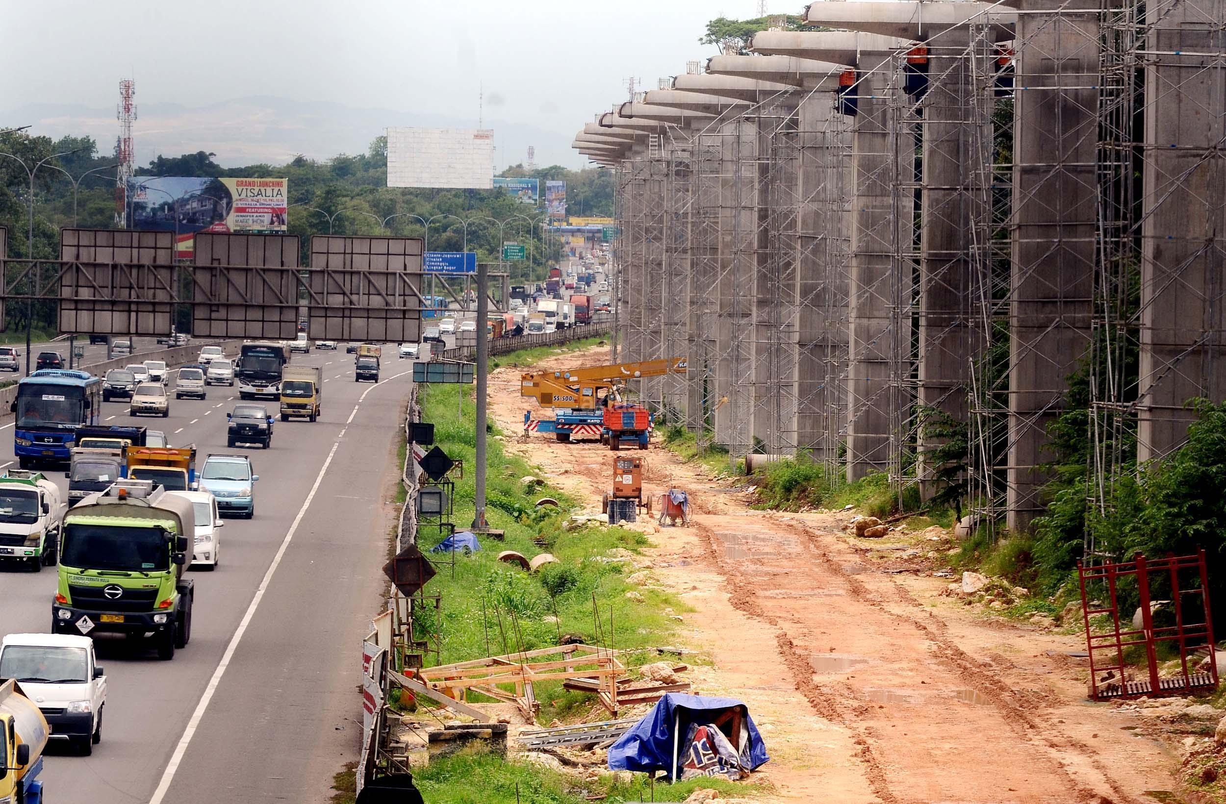 Lokasi pembangunan Proyek Light Rail Transit (LRT) di sepanjang Tol Jagorawi, Cibubur, Jakarta Timur, Selasa (8/11/2016). Pembangunan LRT sudah mencapai 6,5 persen di rute Cibubur-Cawang, Bekasi Timur-Cawang, Cawang-Dukuh Atas, yang ditargetkan rampung pada tahun 2018.