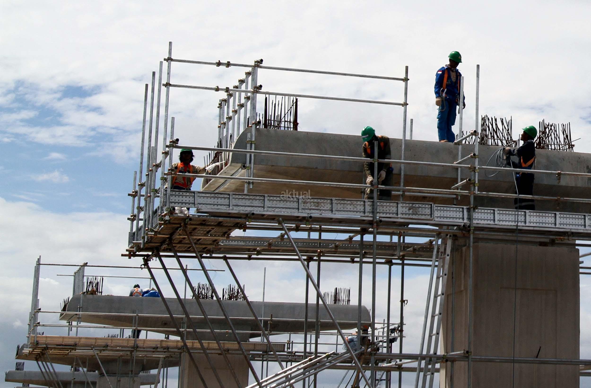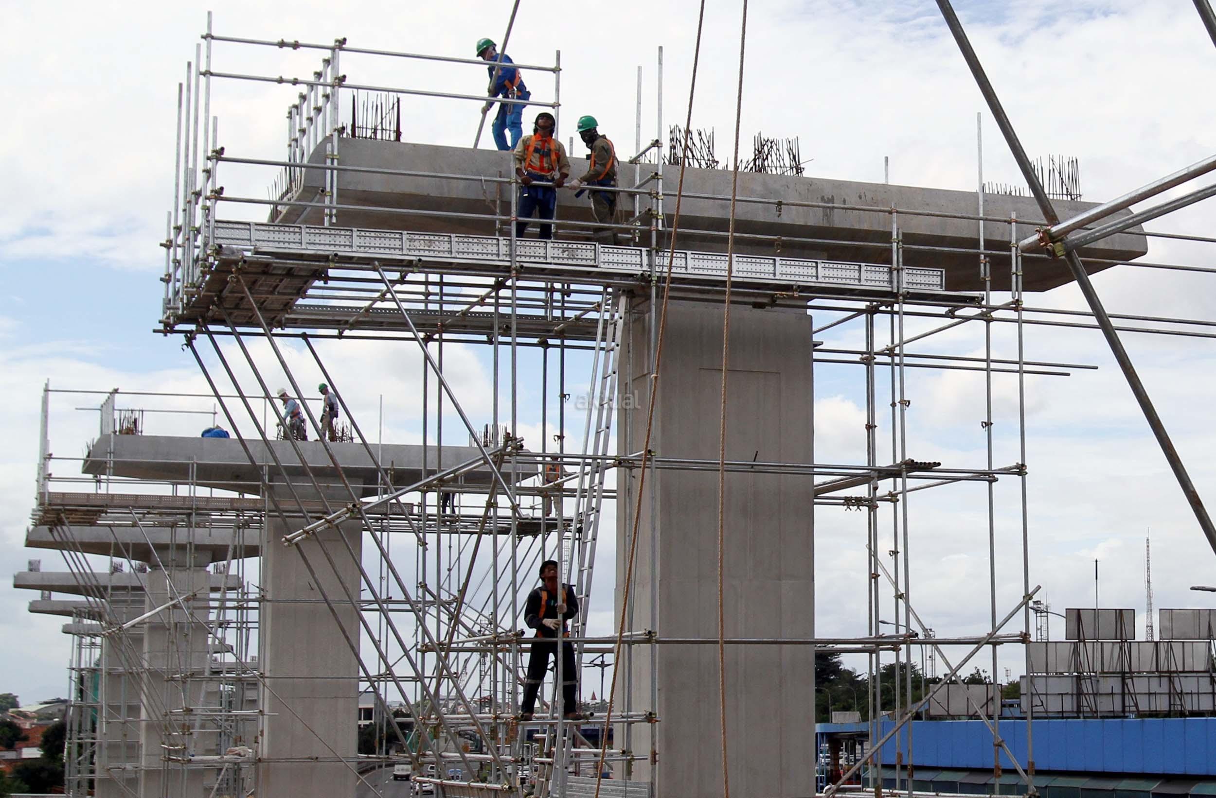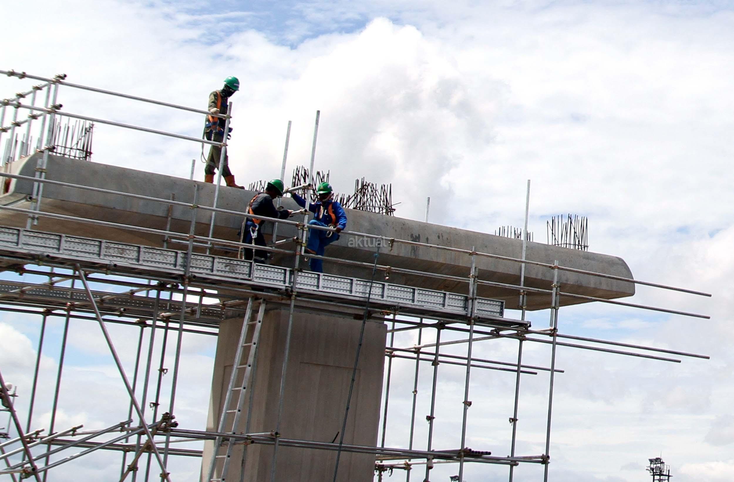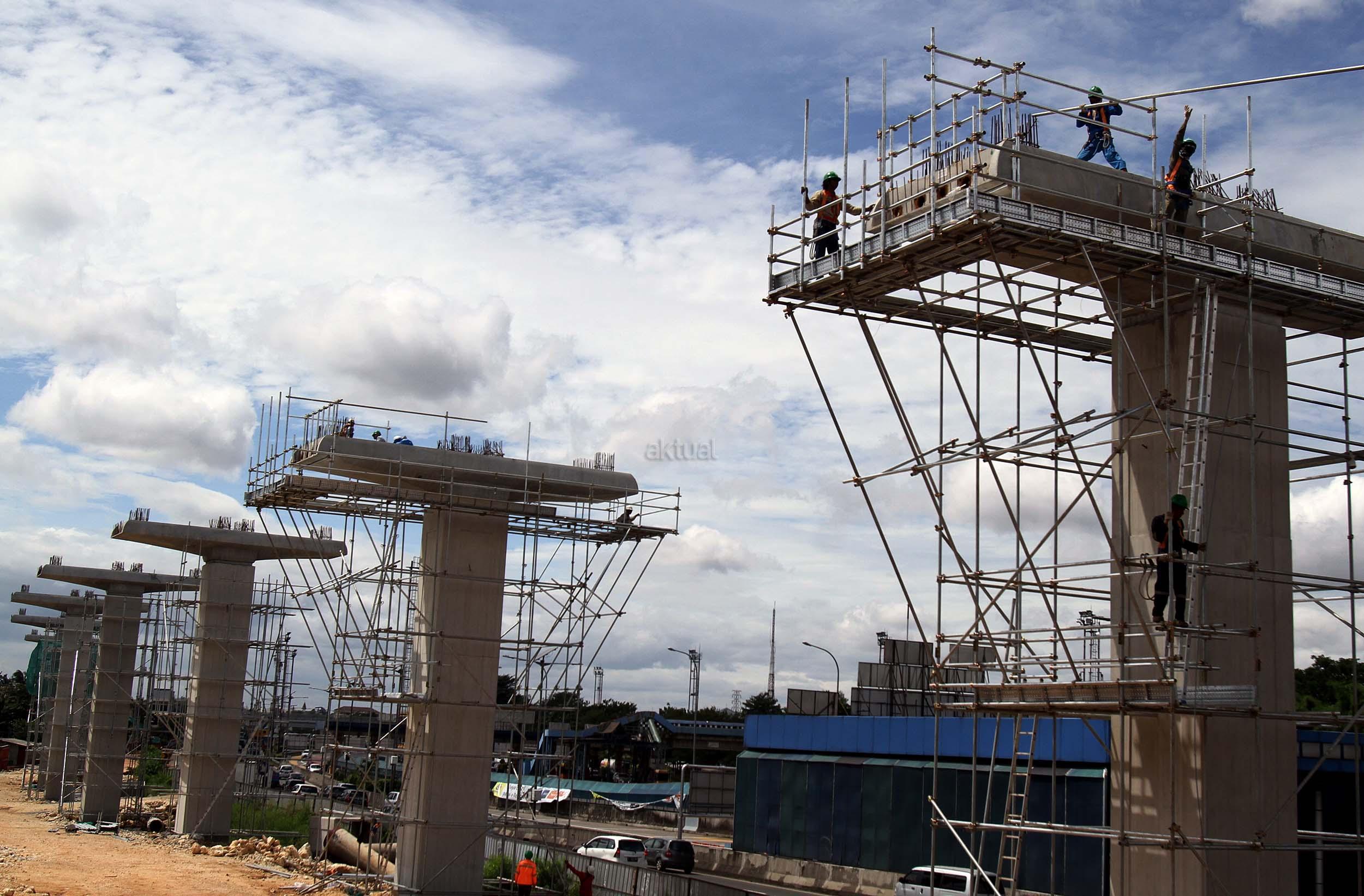 Sejumlah pekerja menyelesaikan pembangunan tiang Light Rail Transit (LRT) di sepanjang Tol Jagorawi, Cibubur, Jakarta Timur, Jumat (13/1/2017). Proyek LRT yang terdiri enam lintas layanan tersebut meliputi tahap pertama, yakni Cawang-Cibubur (14,3 km) Cawang-Kuningan-Dukuh Atas (10,5 km), Cawang-Bekasi Timur (18,3 km), sementara tahap kedua meliputi Dukuh Atas-Palmerah-Senayan (7,8 km), Cibubur-Bogor (25 km), dan Palmerah-Grogol (5,7 km) ditargetkan rampung pada tahun 2018 sebelum Asian Games dimulai. AKTUAL/Munzir