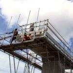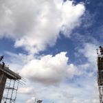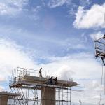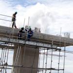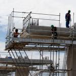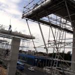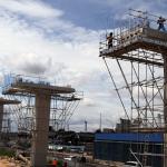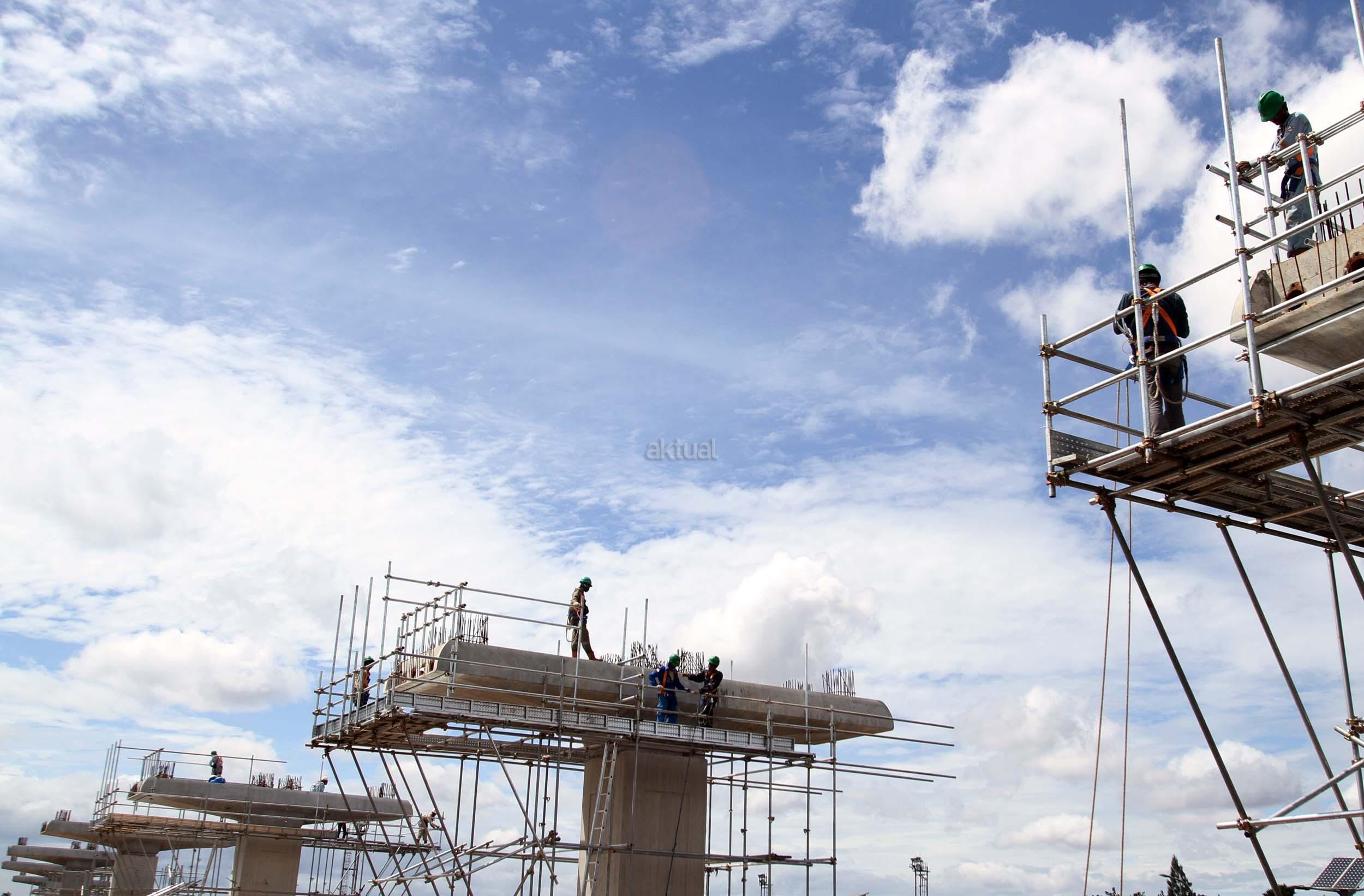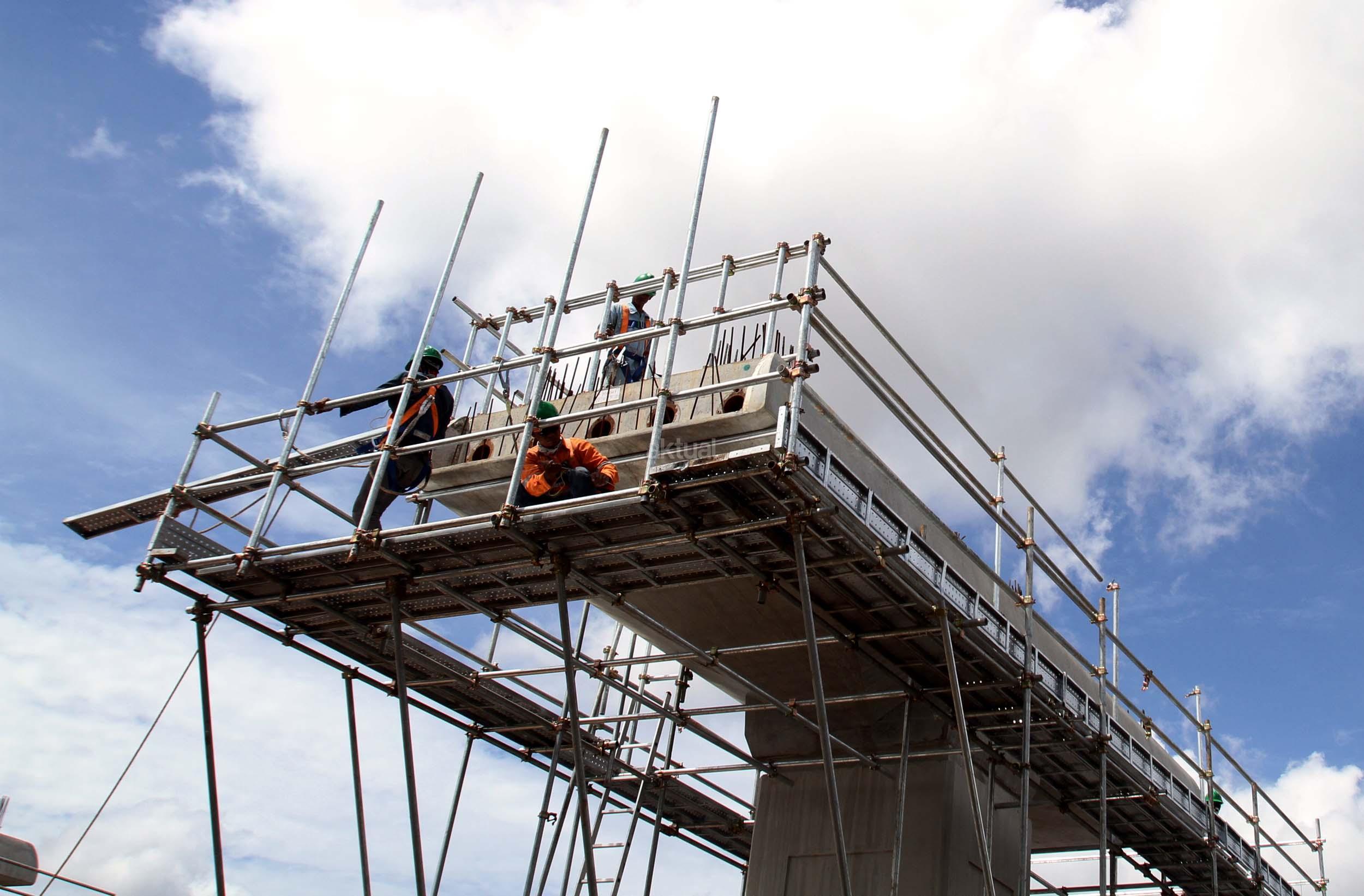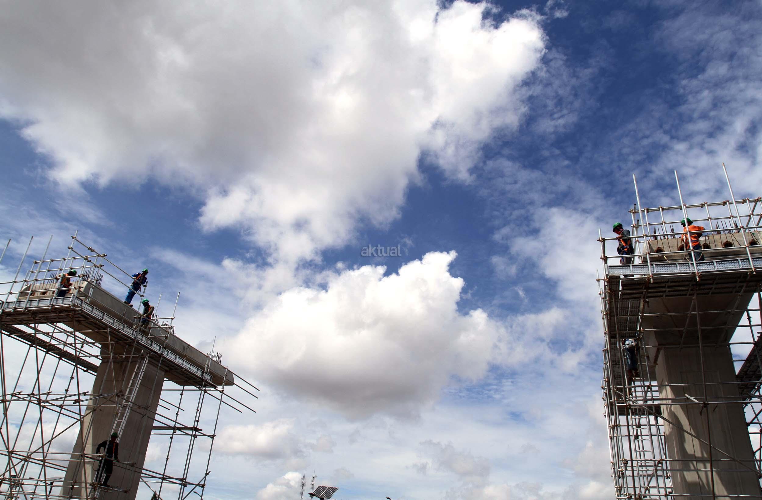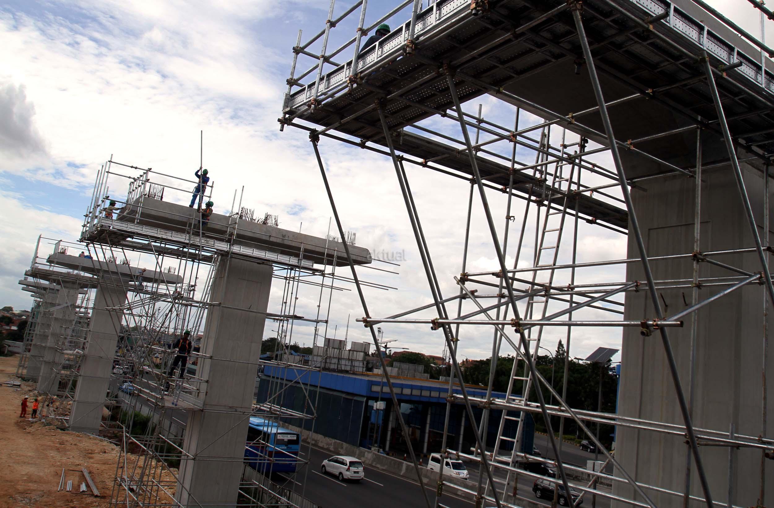 Sejumlah pekerja menyelesaikan pembangunan tiang Light Rail Transit (LRT) di sepanjang Tol Jagorawi, Cibubur, Jakarta Timur, Jumat (13/1/2017). Proyek LRT yang terdiri enam lintas layanan tersebut meliputi tahap pertama, yakni Cawang-Cibubur (14,3 km) Cawang-Kuningan-Dukuh Atas (10,5 km), Cawang-Bekasi Timur (18,3 km), sementara tahap kedua meliputi Dukuh Atas-Palmerah-Senayan (7,8 km), Cibubur-Bogor (25 km), dan Palmerah-Grogol (5,7 km) ditargetkan rampung pada tahun 2018 sebelum Asian Games dimulai. AKTUAL/Munzir