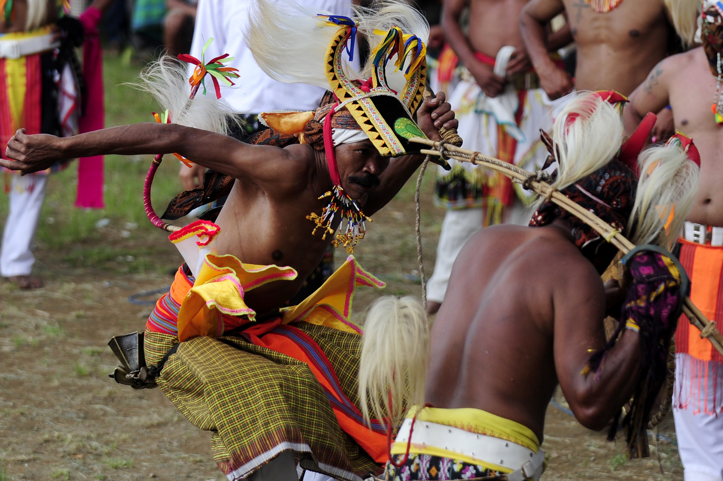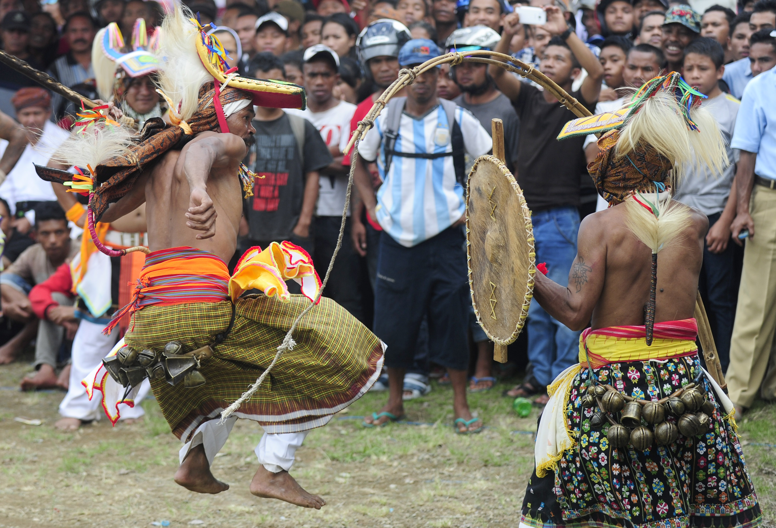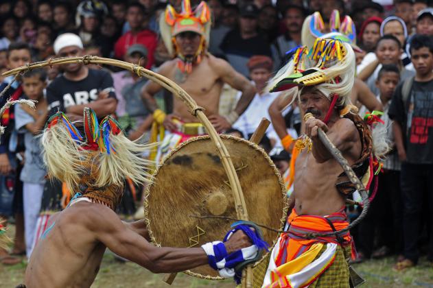 Penari mencambuk rekannya ketika menampilkan tari perang Caci di Manggarai, NTT, Minggu (22/5). Tari Caci merupakan permainan adu ketangkasan antara dua orang laki-laki dalam mencambuk dan menangkis cambukan lawan secara bergantian mengandung makna kepahlawanan dan keperkasaan yang merupakan warisan budaya Manggarai yang harus dilestarikan. ANTARA FOTO/Wahyu Putro A/pd/16