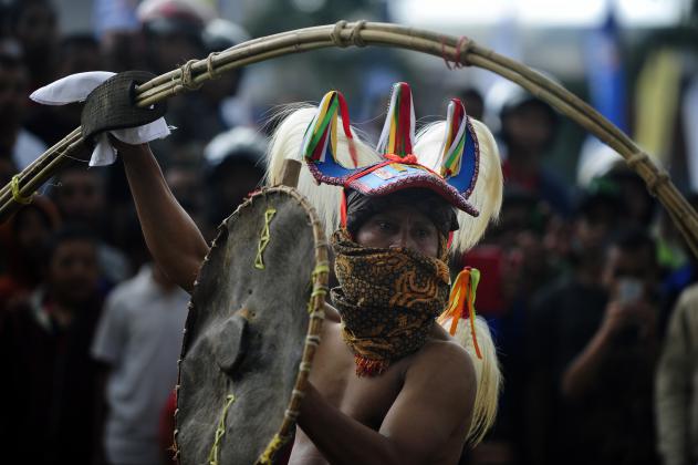 Penari menampilkan tari perang Caci di Manggarai, NTT, Minggu (22/5). Tari Caci merupakan permainan adu ketangkasan antara dua orang laki-laki dalam mencambuk dan menangkis cambukan lawan secara bergantian mengandung makna kepahlawanan dan keperkasaan yang merupakan warisan budaya Manggarai yang harus dilestarikan. ANTARA FOTO/Wahyu Putro A/pd/16