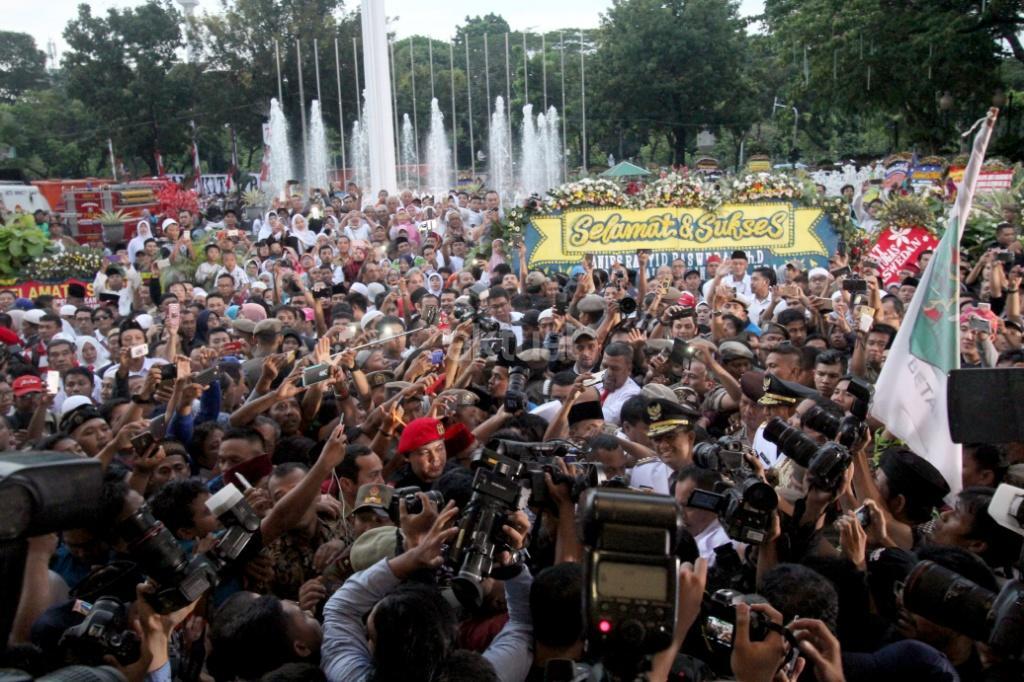 Gubernur DKI Jakarta Anies Baswedan dan Wakil Gubernur DKI Jakarta Sandiaga Uno disambut ribuan warga dan wartawan saat akan sertijab usai pelantikan di Balaikota, Jakarta, Senin (16/10). Pemerintah Provinsi DKI Jakarta melakukan penyambutan Gubernur dan Wakil Gubernur terpilih Anies Baswedan dan Sandiaga Uno dengan tradisi Betawi. Di sambut dengan tarian selamat datang dengan 'Palang Pintu', kedua pemimpin Jakarta terpilih tersebut akan melakukan serah terima jabatan dari Gubernur DKI sekarang, Djarot Saiful Hidayat, di ruang Balai Agung, Balai Kota. AKTUAL/Tino Oktaviano