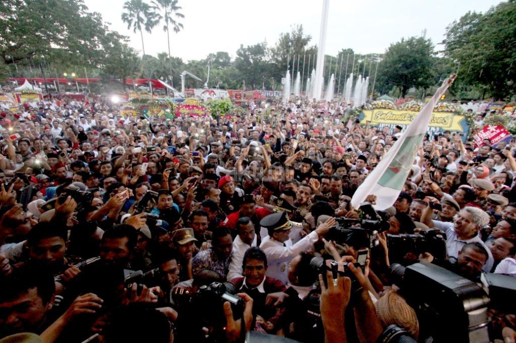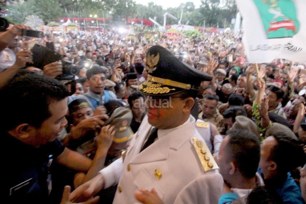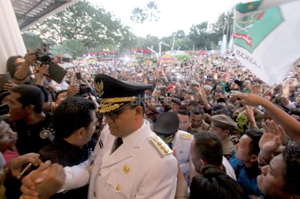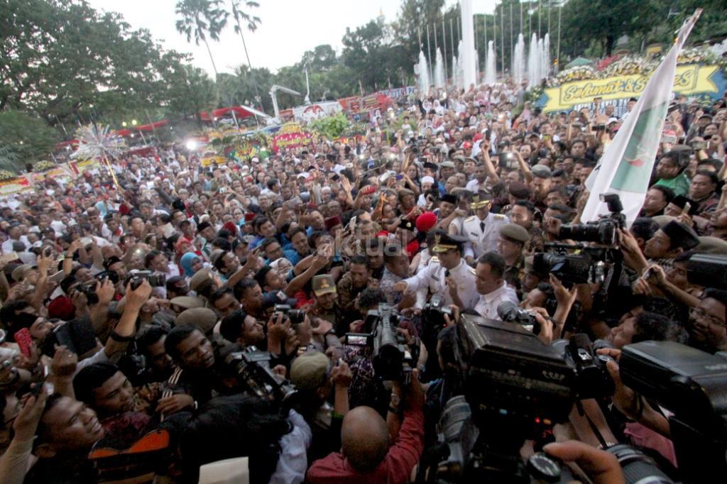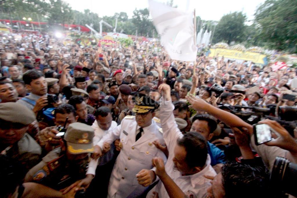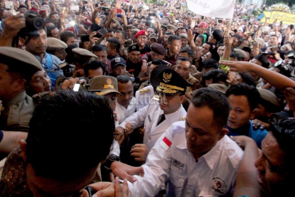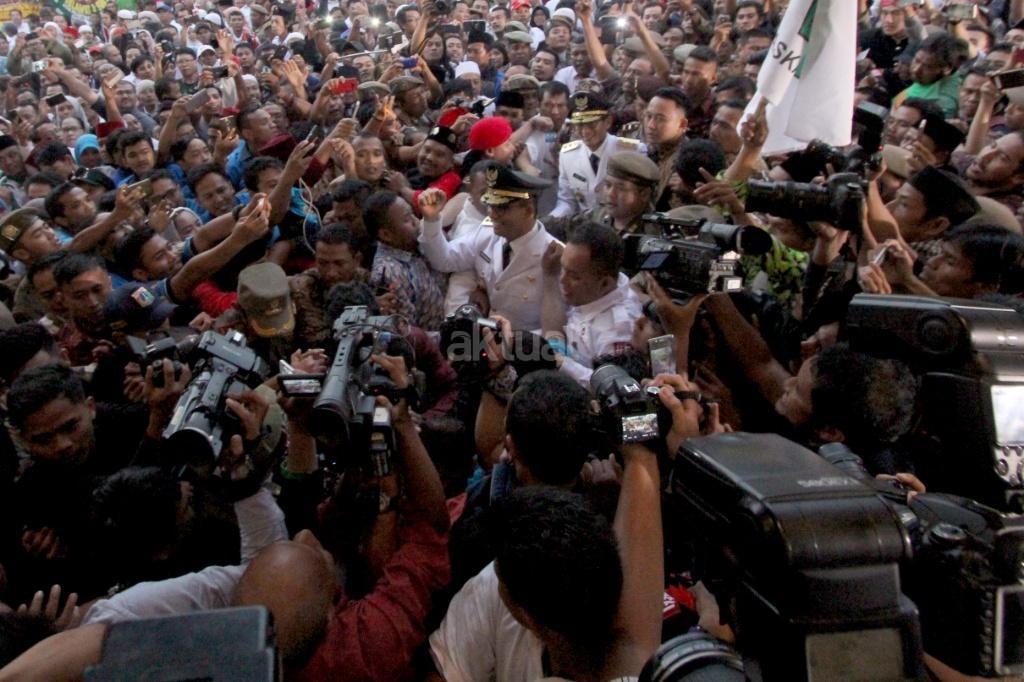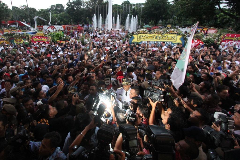 Gubernur DKI Jakarta Anies Baswedan dan Wakil Gubernur DKI Jakarta Sandiaga Uno disambut ribuan warga dan wartawan saat akan sertijab usai pelantikan di Balaikota, Jakarta, Senin (16/10). Pemerintah Provinsi DKI Jakarta melakukan penyambutan Gubernur dan Wakil Gubernur terpilih Anies Baswedan dan Sandiaga Uno dengan tradisi Betawi. Di sambut dengan tarian selamat datang dengan ‘Palang Pintu’, kedua pemimpin Jakarta terpilih tersebut akan melakukan serah terima jabatan dari Gubernur DKI sekarang, Djarot Saiful Hidayat, di ruang Balai Agung, Balai Kota. AKTUAL/Tino Oktaviano