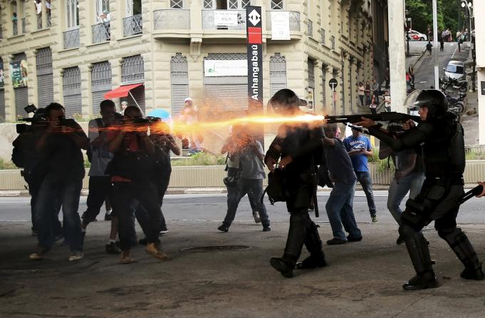 Polisi huru-hara menembakkan gas air mata ke arah pendemo saat protes kenaikan harga tarif bis di Sao Paolo, Brazil, Jumat (8/1). Polisi huru-hara Brazil menembakkan gas air mata untuk membubarkan demo anarkis yang memprotes kenaikan harga tarif kendaraan umum di kota terbesar di negara tersebut. ANTARA FOTO/REUTERS/Nacho Doce/cfo/16