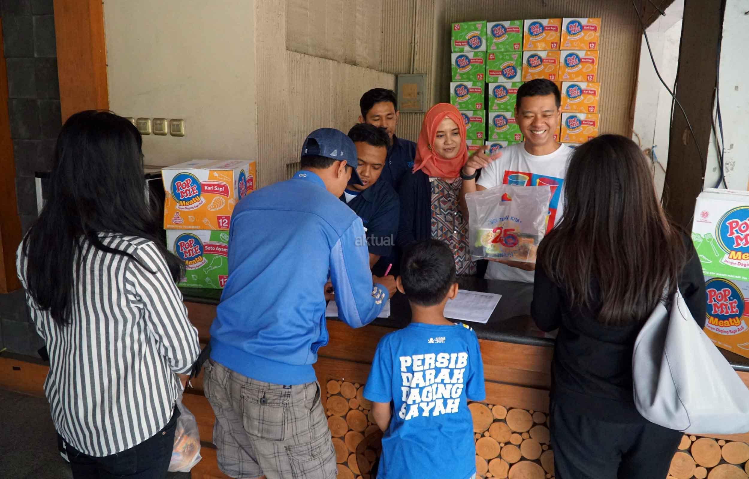 Penonton bola saat melakukan penukaran bukti pembelian tiket dengan produk baru popmie di Graha Persib, Jalan Sulanjana Kota Bandung, Jawa Barat Jumat (7/4). Peluncuran inovasi baru tersebut juga dalam rangka peringatan 25 tahun kehadiran Pop Mie di Indonesia serta ditandai dengan digelarnya pertandingan persahabatan dua klub sepakbola nasional yakni Persib Bandung vs Bali United di lapangan Bandung Lautan Api Kota Bandung,Jawa Barat. AKTUAL/Eko S Hilman