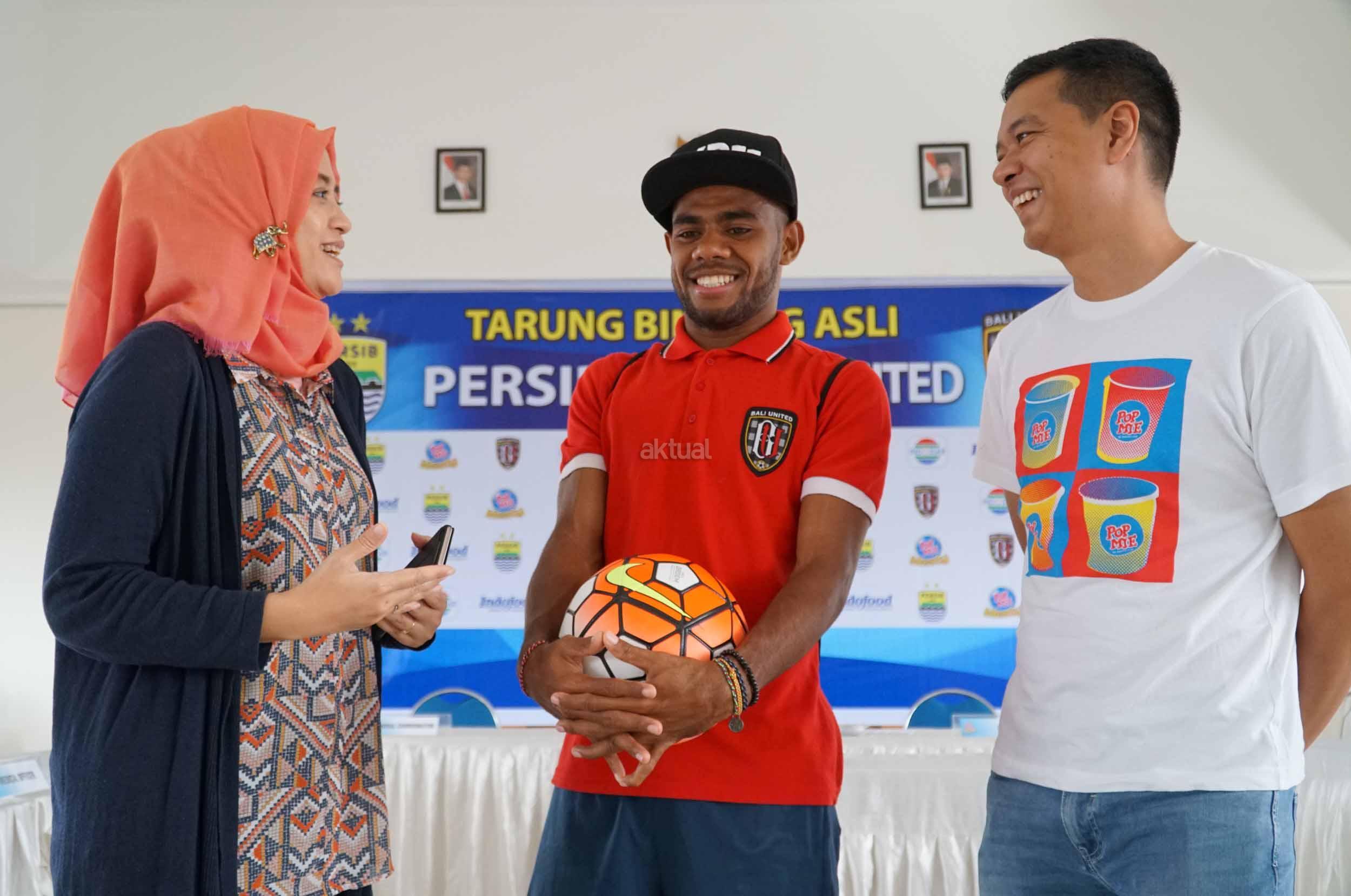 Head of PR Corporate Communications PT Indofood Sukses Makmur Tbk Nurulita Novi Arlaida (kiri) berbincang dengan Pesepak bola Bali United Yabes Maulani (tengah) dan Senior Brand Manager Popmie PT Indofood CBP Sukses Makmur Tbk Vemri Venadi Junaidi disela peluncuran inovasi terbaru ICBP yaitu Pop Mie Meaty, mi instan dalam kemasan cup dengan topping daging sapi dan ayam asli di Graha Persib, Jalan Sulanjana Kota Bandung, Jawa Barat Jumat (7/4). Peluncuran inovasi baru tersebut juga dalam rangka peringatan 25 tahun kehadiran Pop Mie di Indonesia serta ditandai dengan digelarnya pertandingan persahabatan dua klub sepakbola nasional yakni Persib Bandung vs Bali United di lapangan Bandung Lautan Api Kota Bandung,Jawa Barat. AKTUAL/Eko S Hilman