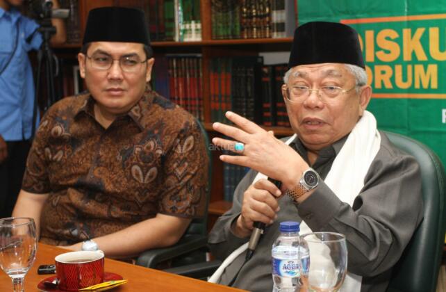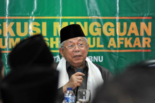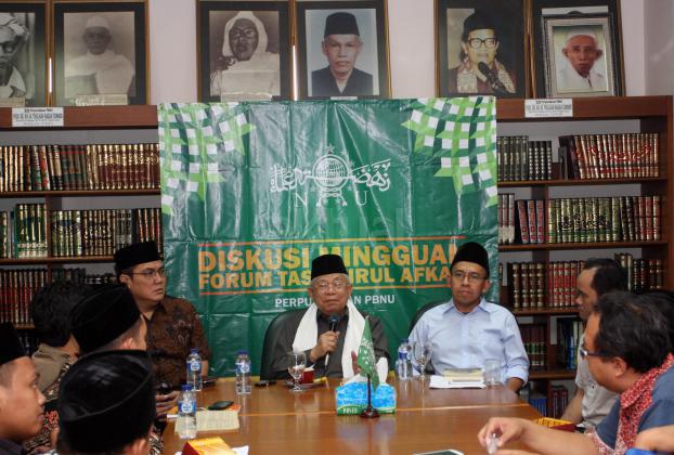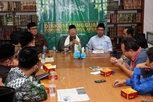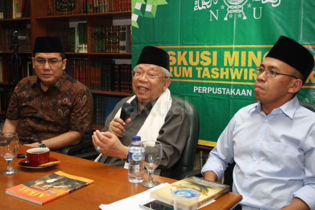Sekjen PBNU Helmy Faizal Zaini, Rais Aam PBNU KH Maruf Amin, Intelektual Muda NU (PCI NU Amerika) Akhmad Sahal saat menjadi narasumber pada acara Forum Taswirul Afkar di Perpustakaan Gedung PBNU, Jl Kramat Raya, Jakarta, Sabtu (18/9/2015). Diskusi mingguan dalam Forum Taswirul Afkar ini membahas Islam Nusantara.