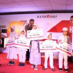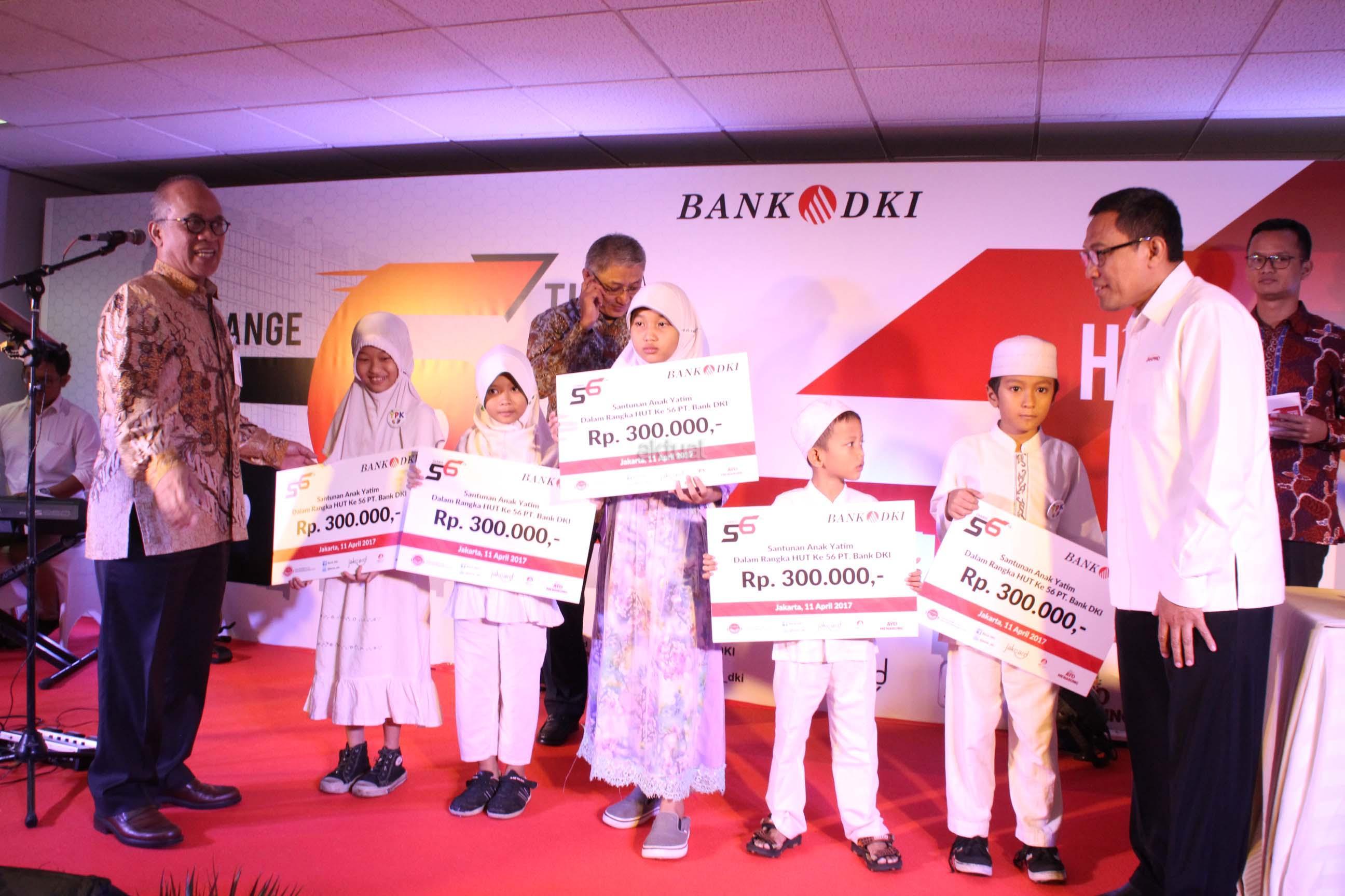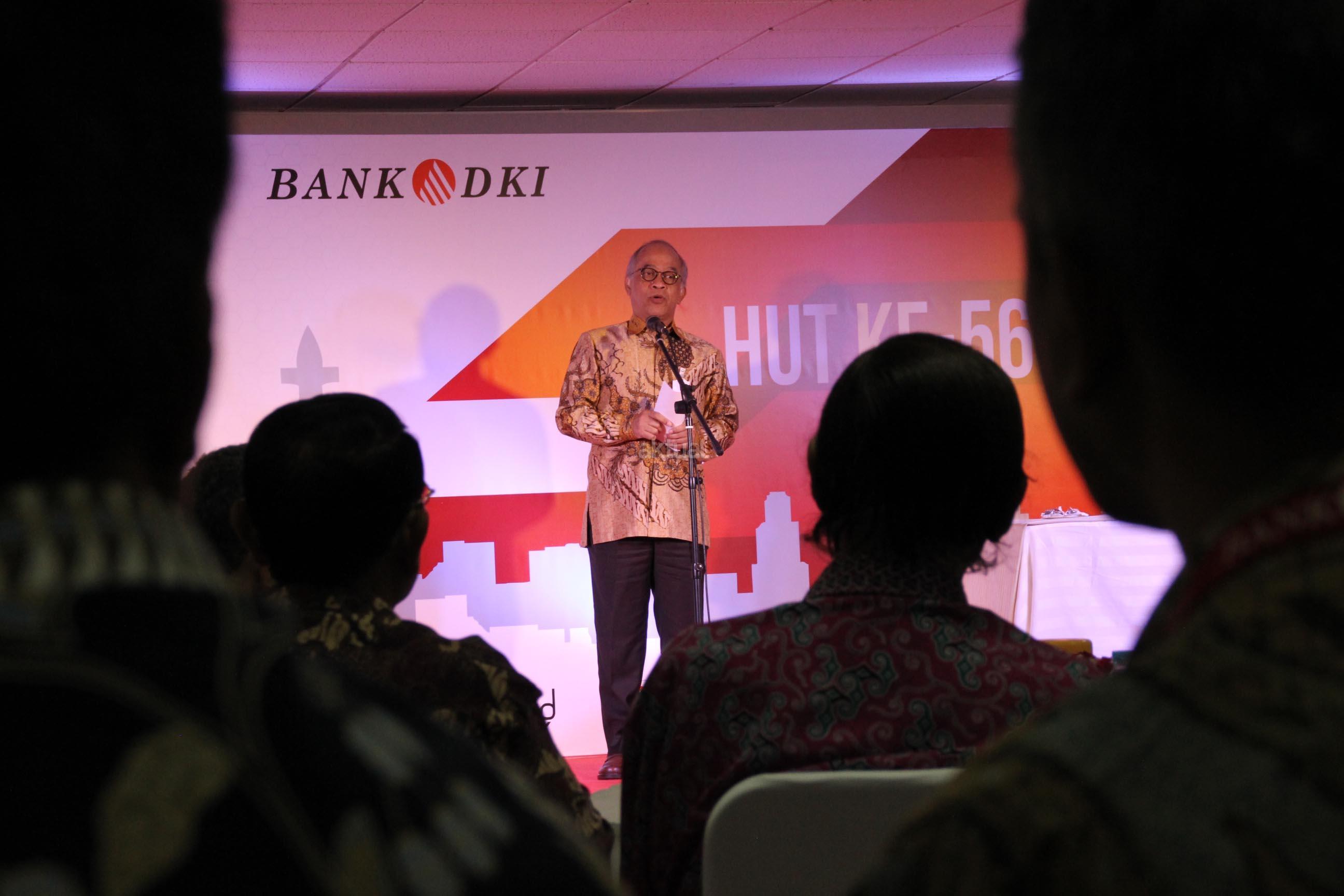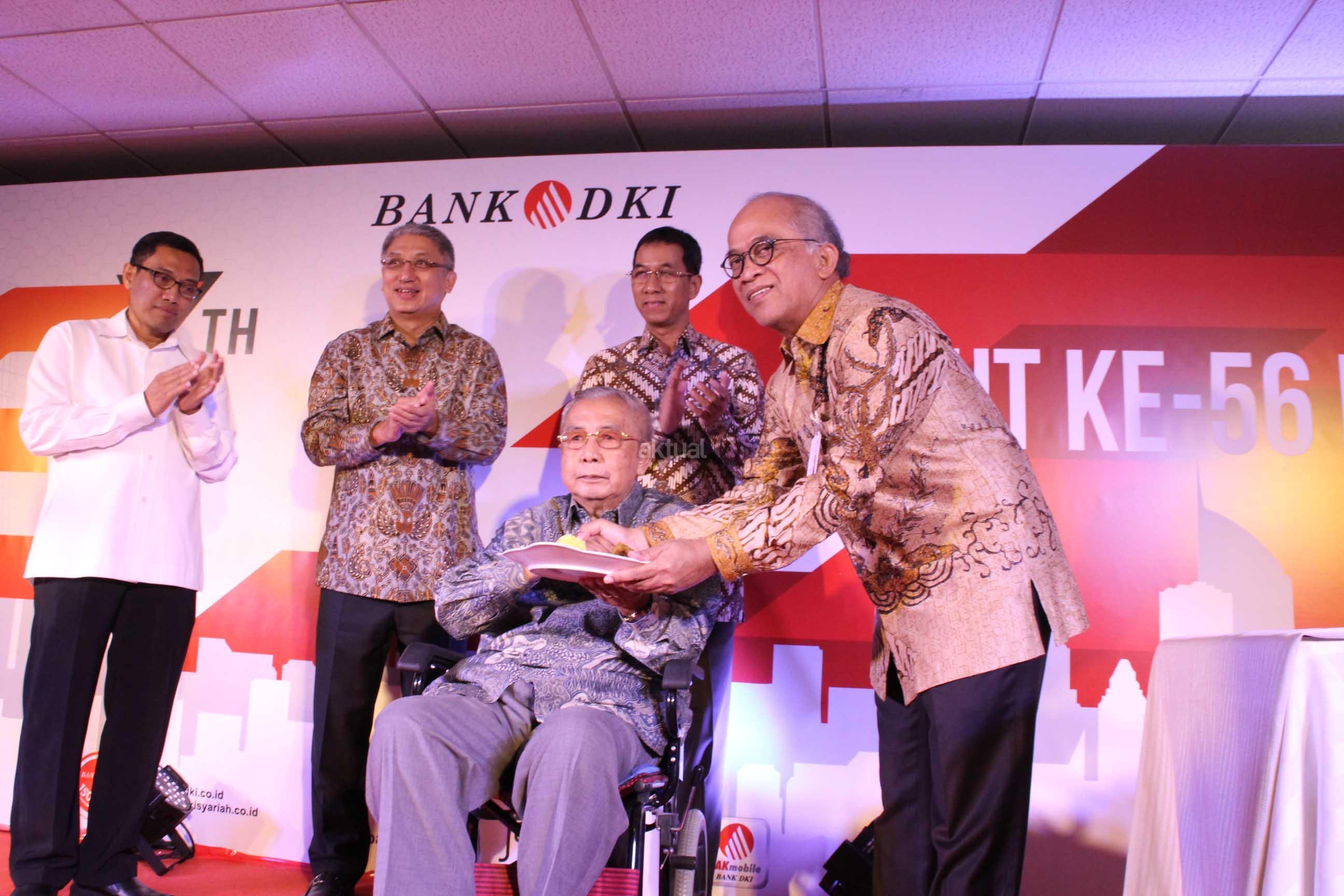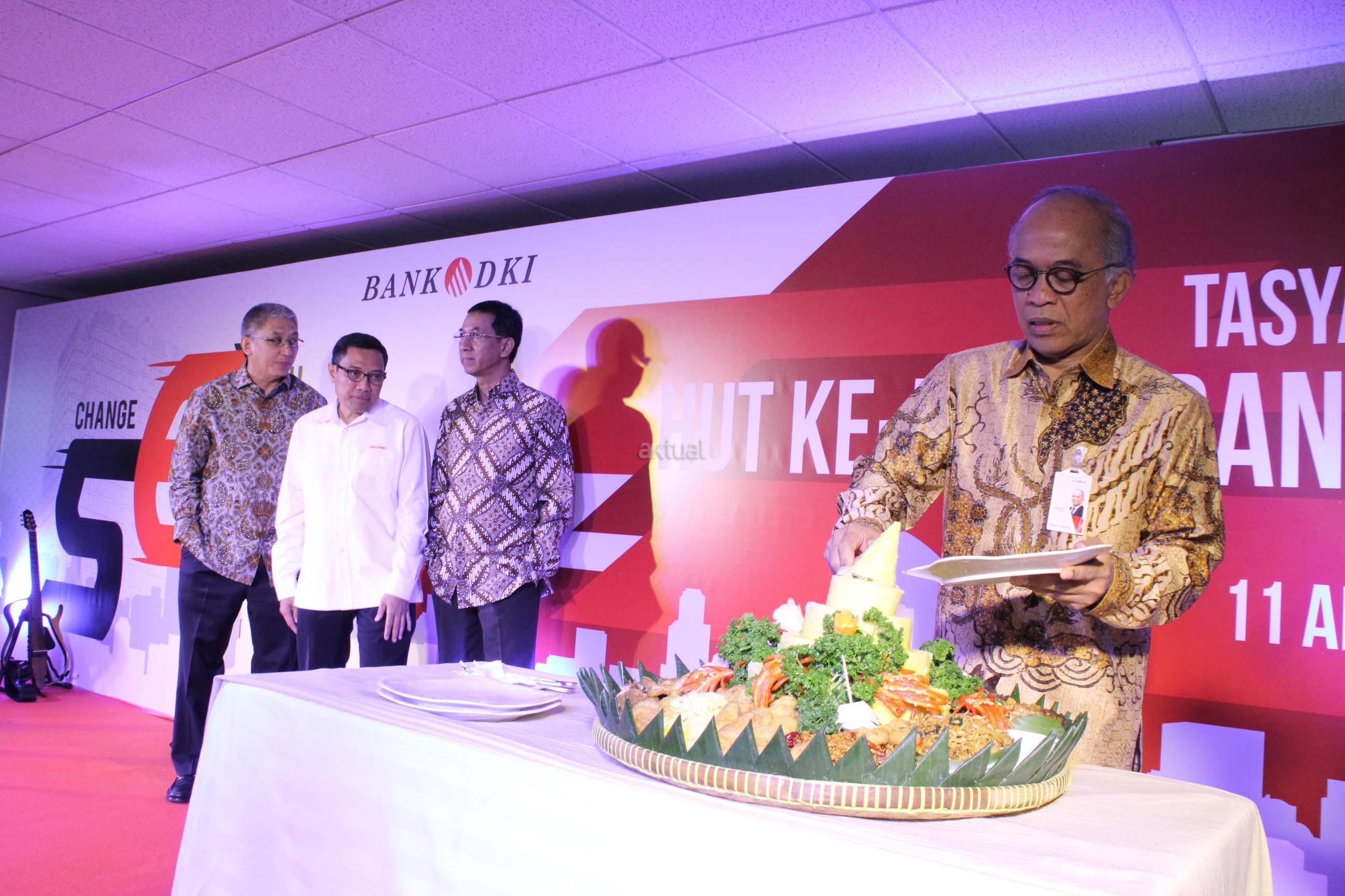 Direktur Utama PT Bank DKI, Kresno Sediarsi memberikan potongan tumpeng kepada mantan Direktur Utama PT Bank DKI periode 1980-1988, M. Zein Djamaloeddin disaksikan Kepala Badan Pembinaan Badan Usaha Milik Daerah DKI Jakarta, Yurianto, Komisaris Utama PT Bank DKI, Honggo Widjojo Kangmasto dan kepala Badan Pengelola Keuangan Daerah, Heru Budi Hartono pada acara Tasyakuran HUT PT Bank DKI ke 56 di Jakarta, Selasa (11/04). AKTUAL/Eko S Hilman