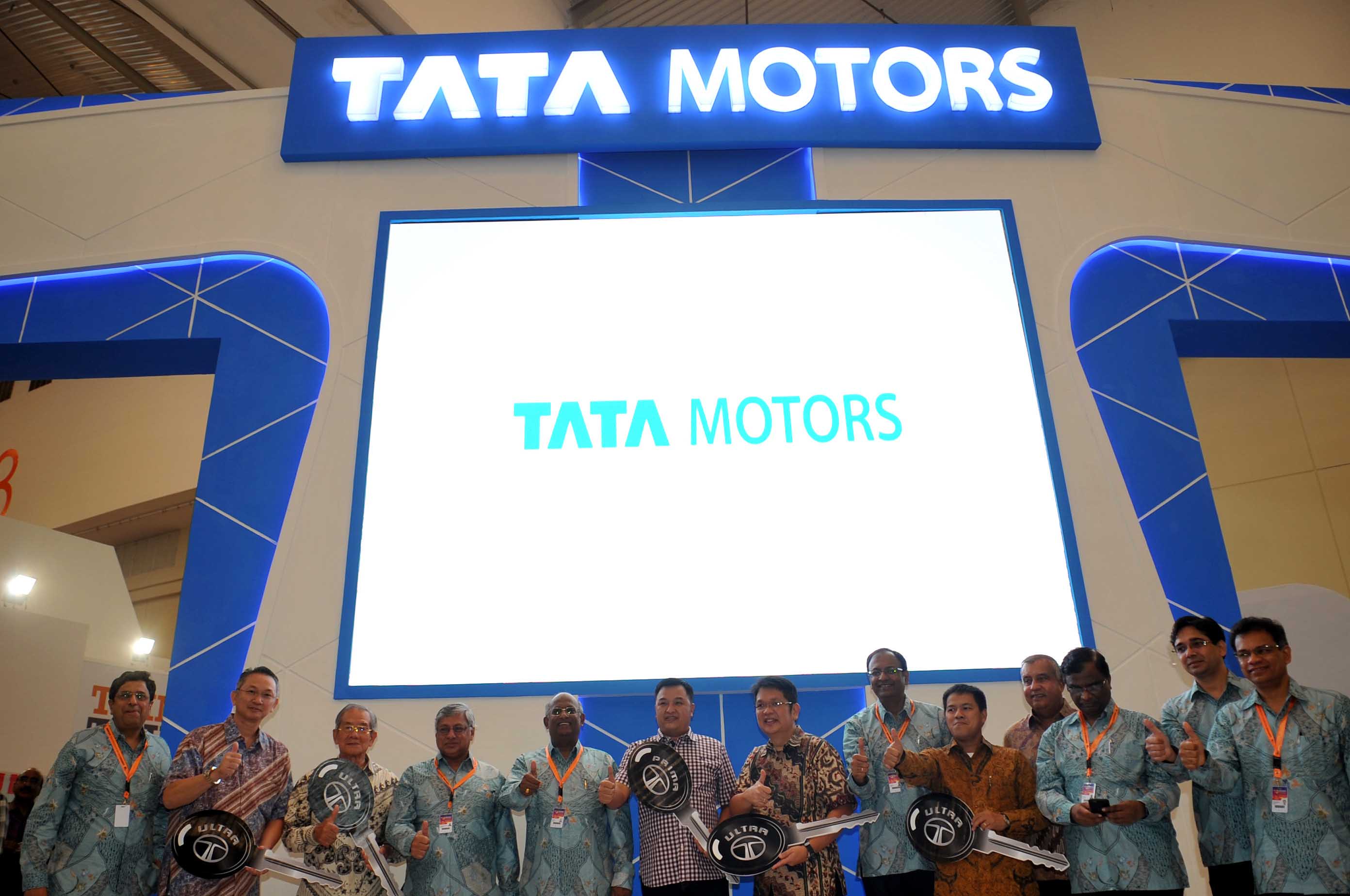 Executive Director, Commercial Vehicles Tata Motors Ltd Ravindra Pisharody (keempat dari kiri) bersama President Director Tata Motors Distribusi Indonesia Biswadev Sengupta (keenam dari kanan) berfoto bersama sambil mengacungkan jempol seusai secara simbolis menyerahkan kunci kepada pembeli produk otomotif Tata Motors di Pameran Gaikindo Indonesia International Auto Show 2016 di ICE, BSD City, Tangerang, Banten, Jumat (19/8)