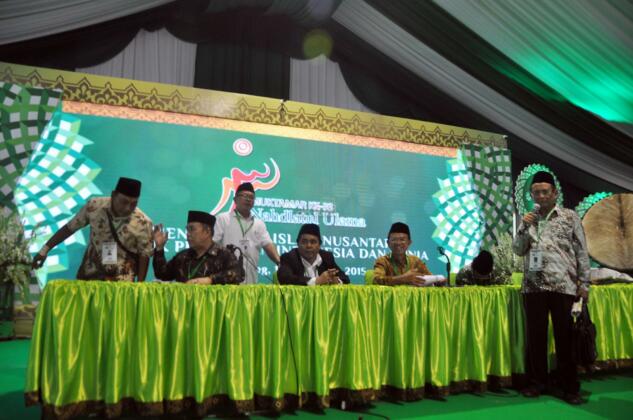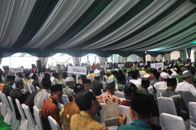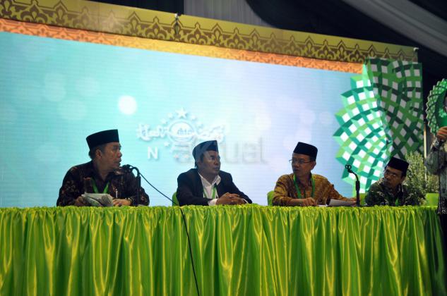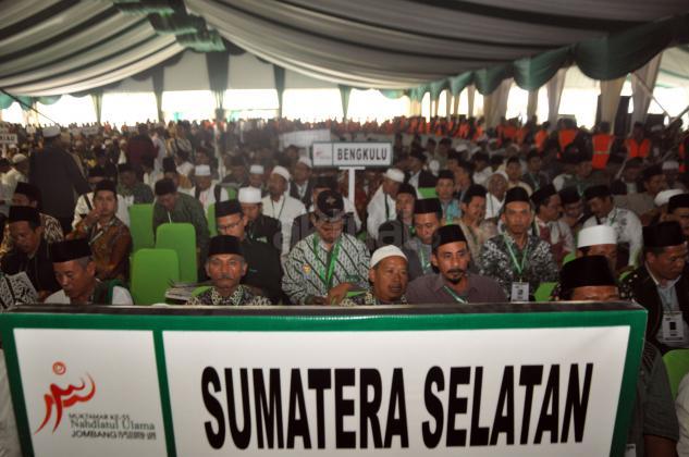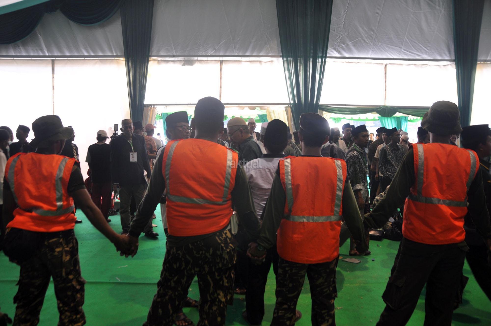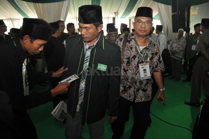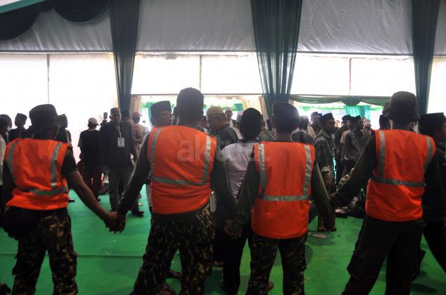 Muktamirin yang menggunakan ID Card dilengkapi dengan barcode menuju ruang Pleno I pembahasan dan pengesahan tata tertib Muktamar ke-33 NU di Alun-alun Jombang, Jawa Timur, Minggu (2/8/2015). Ribuan muktamirin mendapatkan ID Card kosong tanpa barcode hanya bisa digunakan untuk menghadiri pembukaan Muktamar. Sedangkan untuk mengikuti sidang, harus menggunakan ID Card yang lengkap dengan nama, foto dan barcode. Sidang tersebut dijaga ketat oleh petugas banser.