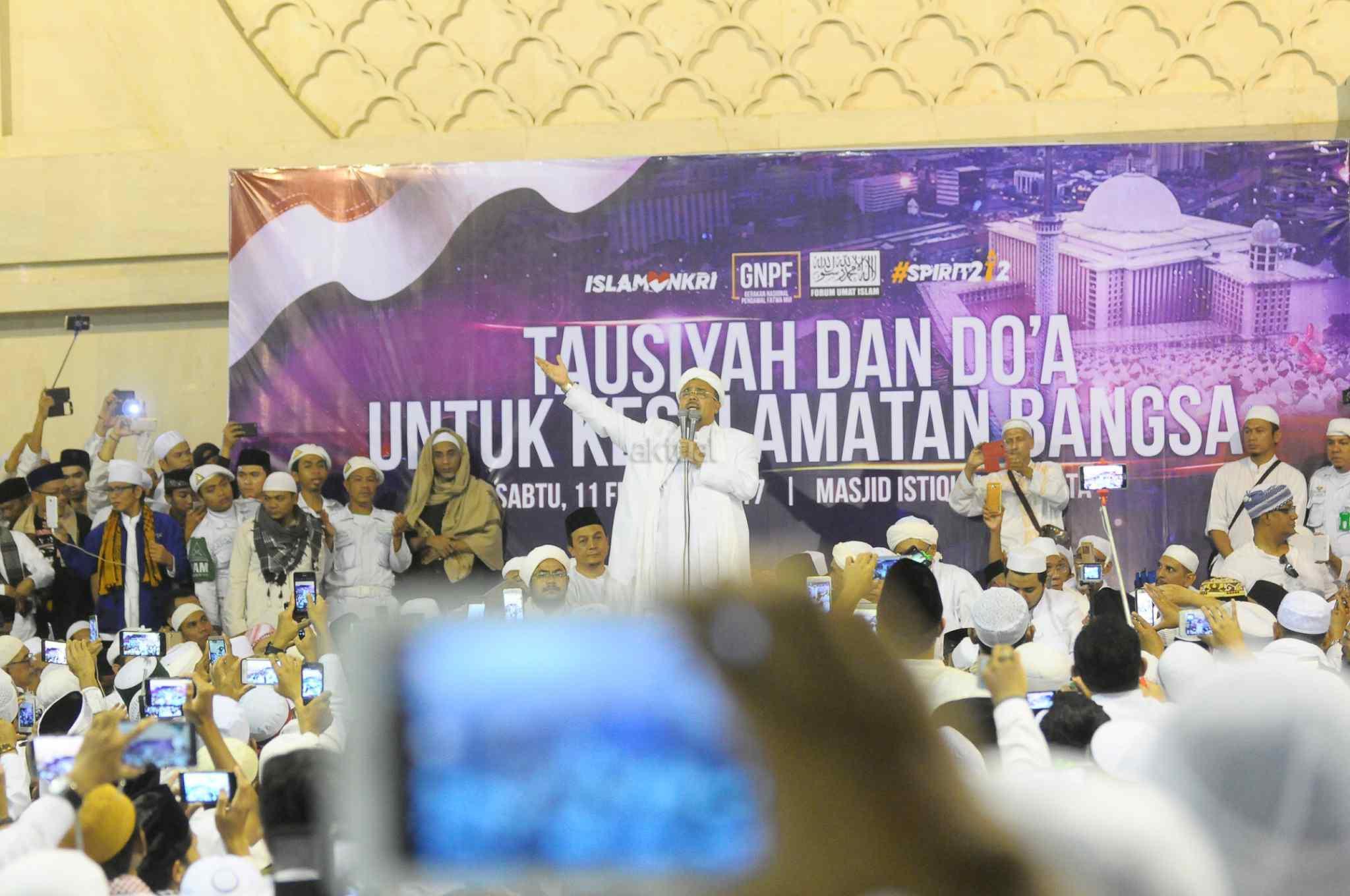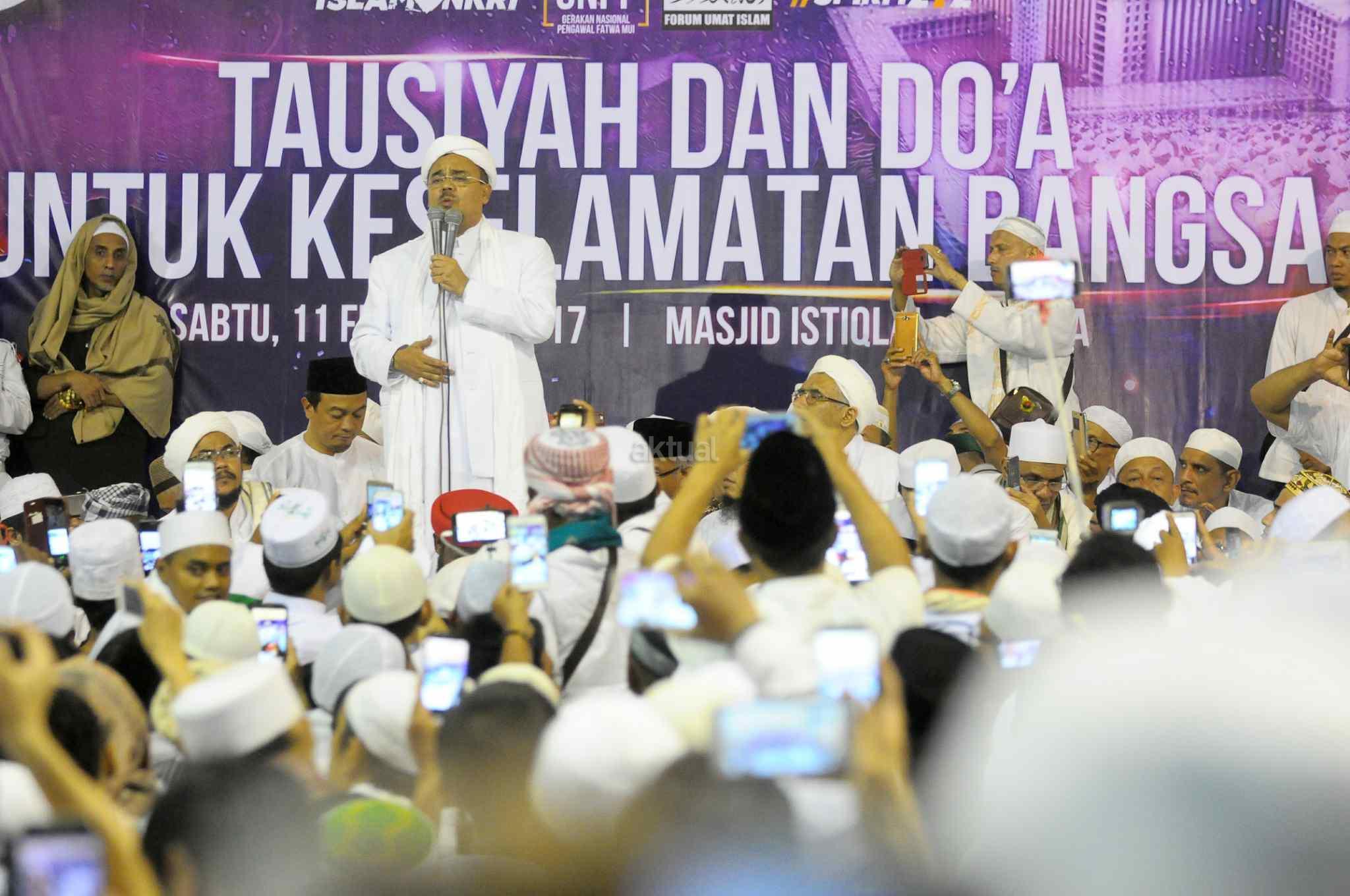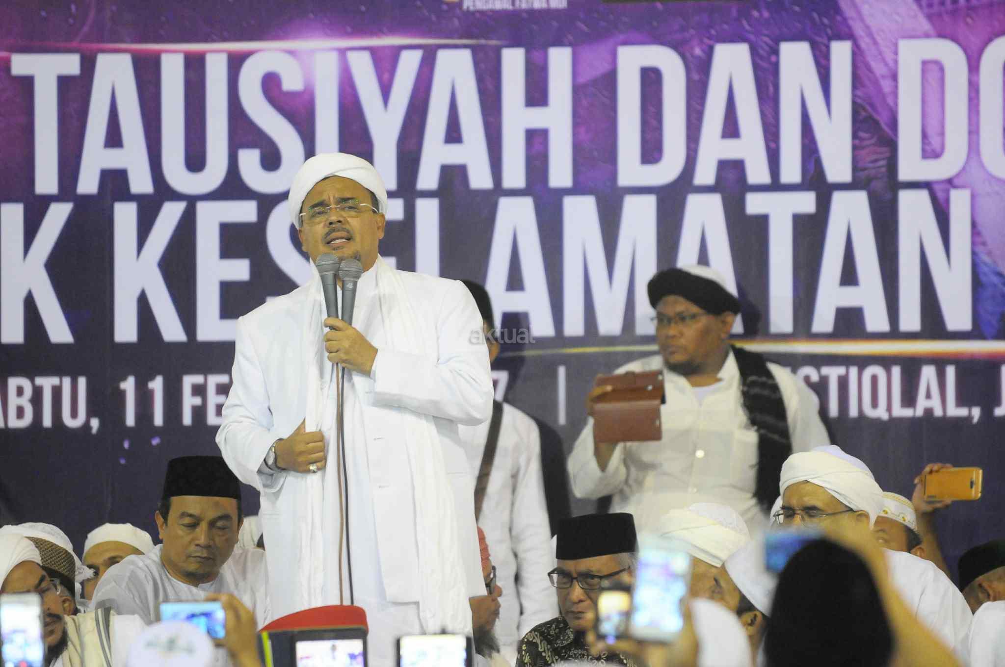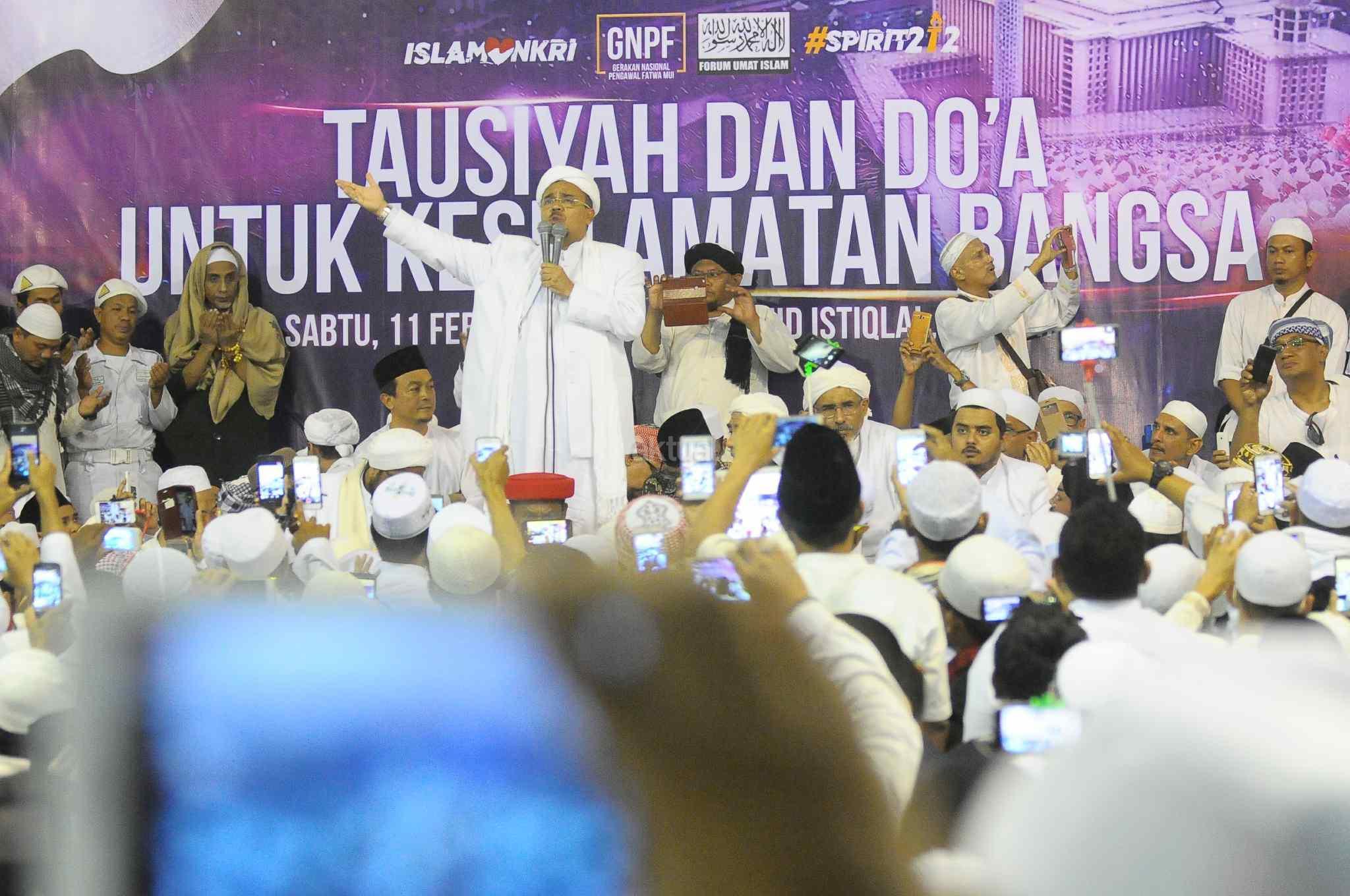 Imam Besar Front Pembela Islam (FPI), Habib Rizieq Shihab memberikan tausiyah saat aksi bela islam 112 di Masjid Istiqlal, Jakarta Pusat, Sabtu (11/2). Dalam tausiyahnya, Habib Riziek meminta kepada seluruh pimpinan politik di Tanah Air, untuk tidak menimbulkan opini buruk terhadap kegiatan dzikir dan tausiyah yang terpusat di Masjid Istiqlal. Khususnya para pemimpin di negeri ini. Jangan sekali-kali memaknai aksi kami sebagai aksi makar, sebagai aksi anti NKRI, aksi anti Pancasila, ataupun aksi anti Bhineka Tunggal Ika. AKTUAL/Tino Oktaviano