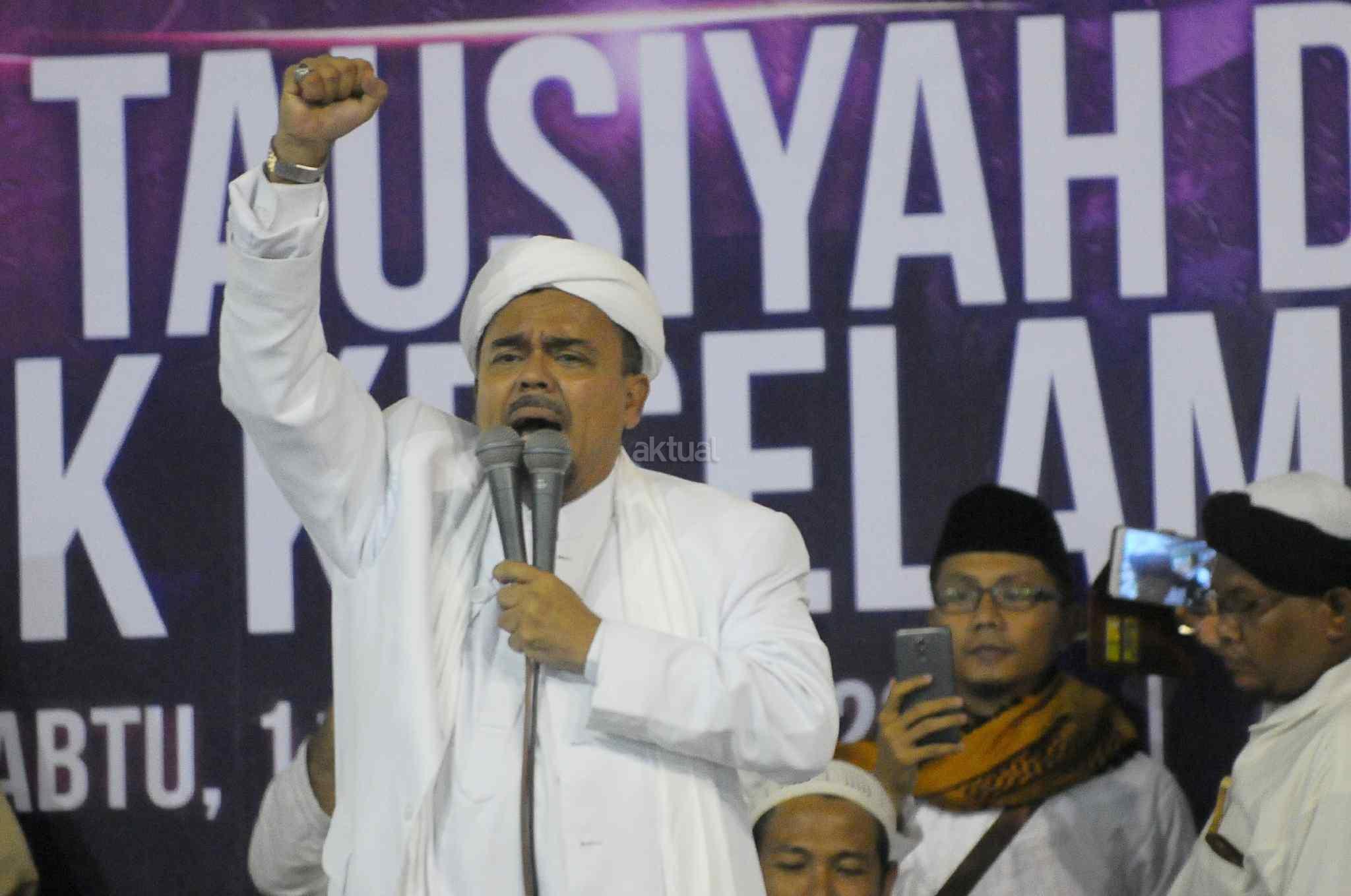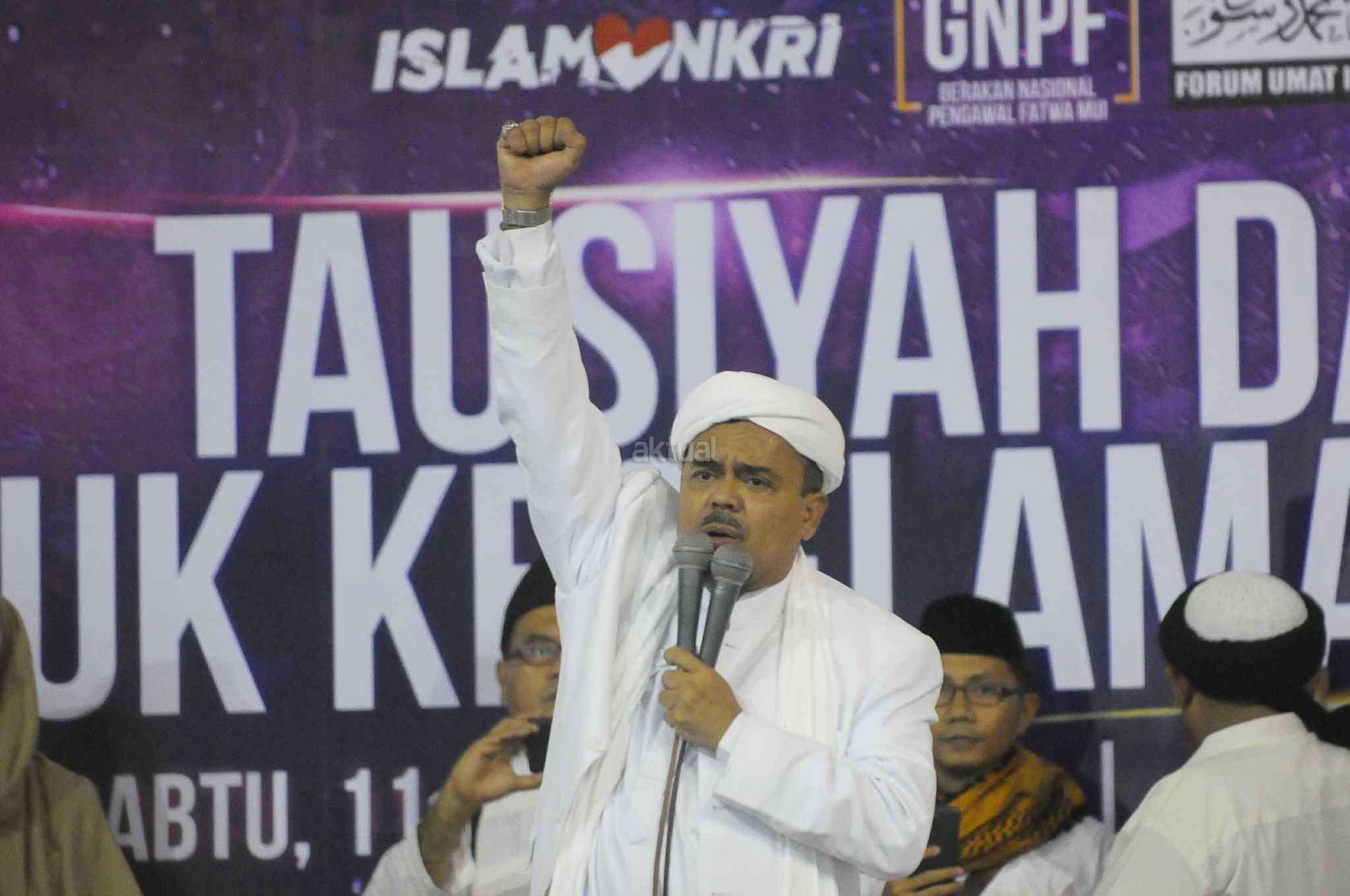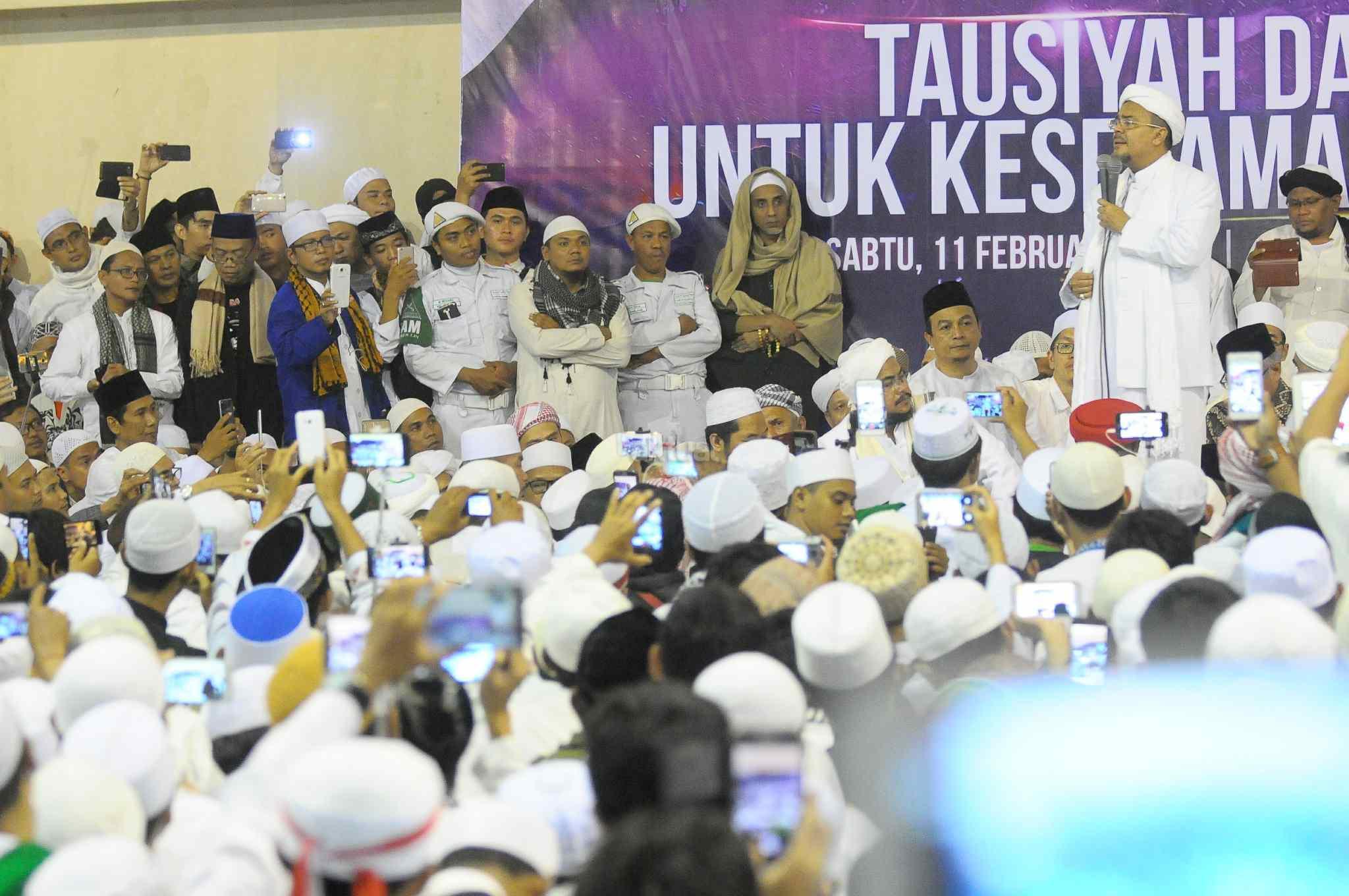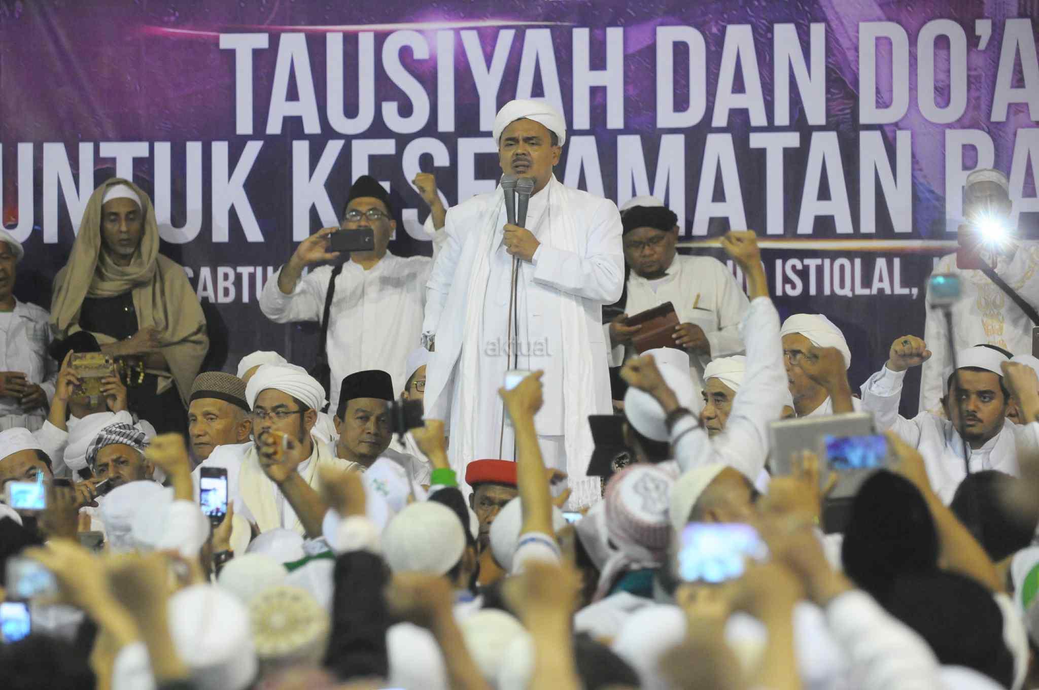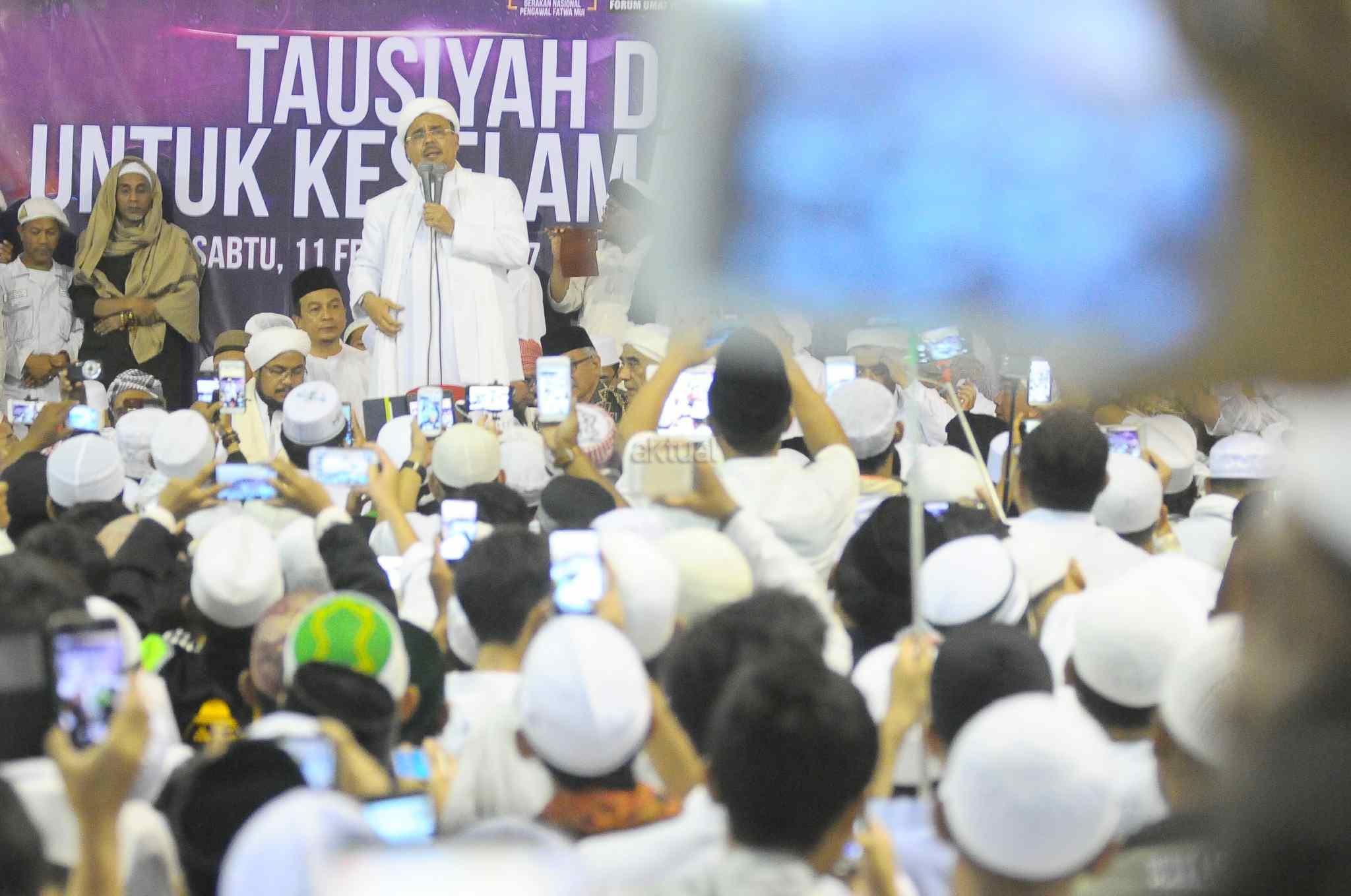 Imam Besar Front Pembela Islam (FPI), Habib Rizieq Shihab memberikan tausiyah saat aksi bela islam 112 di Masjid Istiqlal, Jakarta Pusat, Sabtu (11/2). Dalam tausiyahnya, Habib Riziek meminta kepada seluruh pimpinan politik di Tanah Air, untuk tidak menimbulkan opini buruk terhadap kegiatan dzikir dan tausiyah yang terpusat di Masjid Istiqlal. Khususnya para pemimpin di negeri ini. Jangan sekali-kali memaknai aksi kami sebagai aksi makar, sebagai aksi anti NKRI, aksi anti Pancasila, ataupun aksi anti Bhineka Tunggal Ika. AKTUAL/Tino Oktaviano