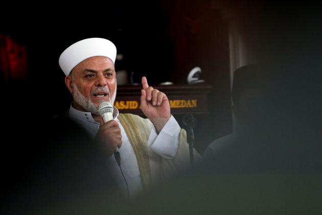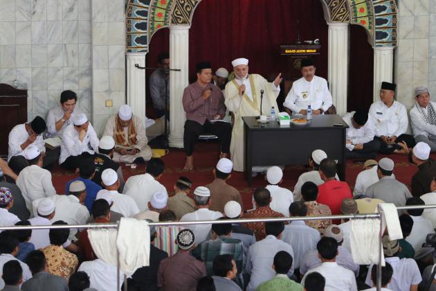 Imam besar Masjid Al Aqsha Palestina, Syeikh Yousef Abdelwahab Mahmoud Abu Sneineh menyampaikan tausiyah di Masjid Agung Medan, Sumatera Utara, Rabu (16/3). Tausiyah tersebut dalam rangka Safari Isra Mi'raj Nabi Muhammad SAW 1437 H. ANTARA FOTO/Irsan Mulyadi/pd/16