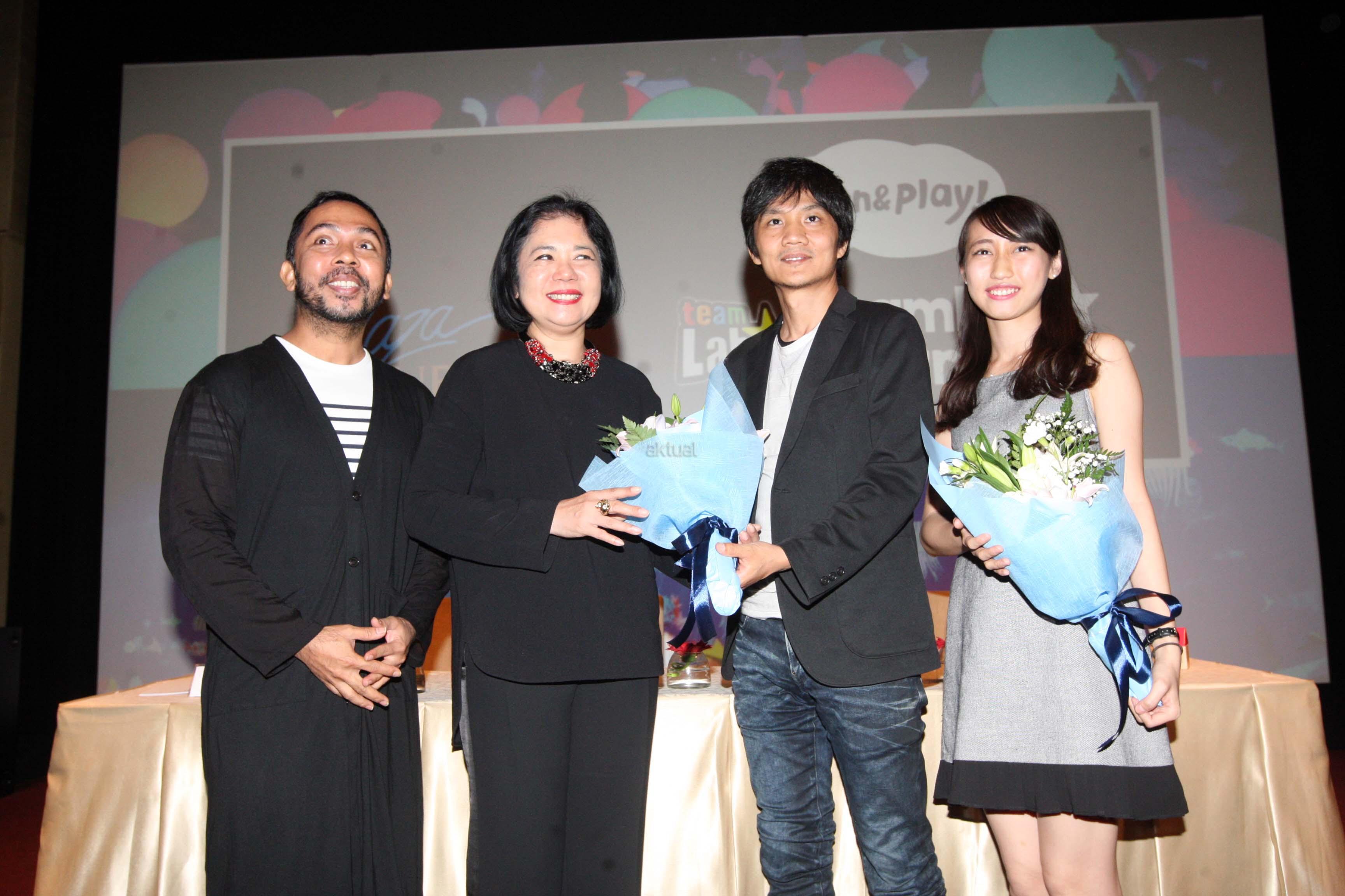Chief Operating Officer PT Plaza Indonesia Realty Tbk, Mia Egron,TeamLab Future Park, Junko Hara, President Director PT Plaza Indonesia Realty Tbk, Rosano Barack (kedua dari kanan) beserta istri dan CEO teamLab Kids, Mr Akitae Matsumoto mengunting pita saat launching teamLab Future Park di di Plaza Indonesi, Jakarta, Minggu (4/6). Area edukasi bermain bagi keluarga dan anak-anak menggunakan area seluas 700 sqm yang bertempat di lantai 5 pusat belanja tersebut, merupakan kali pertama hadir di Indonesia. teamLab Future Park menampilkan area-area yang menggunakan aplikasi teknologi tinggi yang terdiri dari tujuh macam antara lain sketch aquarium, sketch town, sketch town papercraft, ligth ball orchestra, dan lain sebagainya. teamLab Future Park dibuka untuk umum mulai Senin (5/6/2017) hingga 8 Oktober 2017 mendatang. AKTUAL/Eko S Hilman