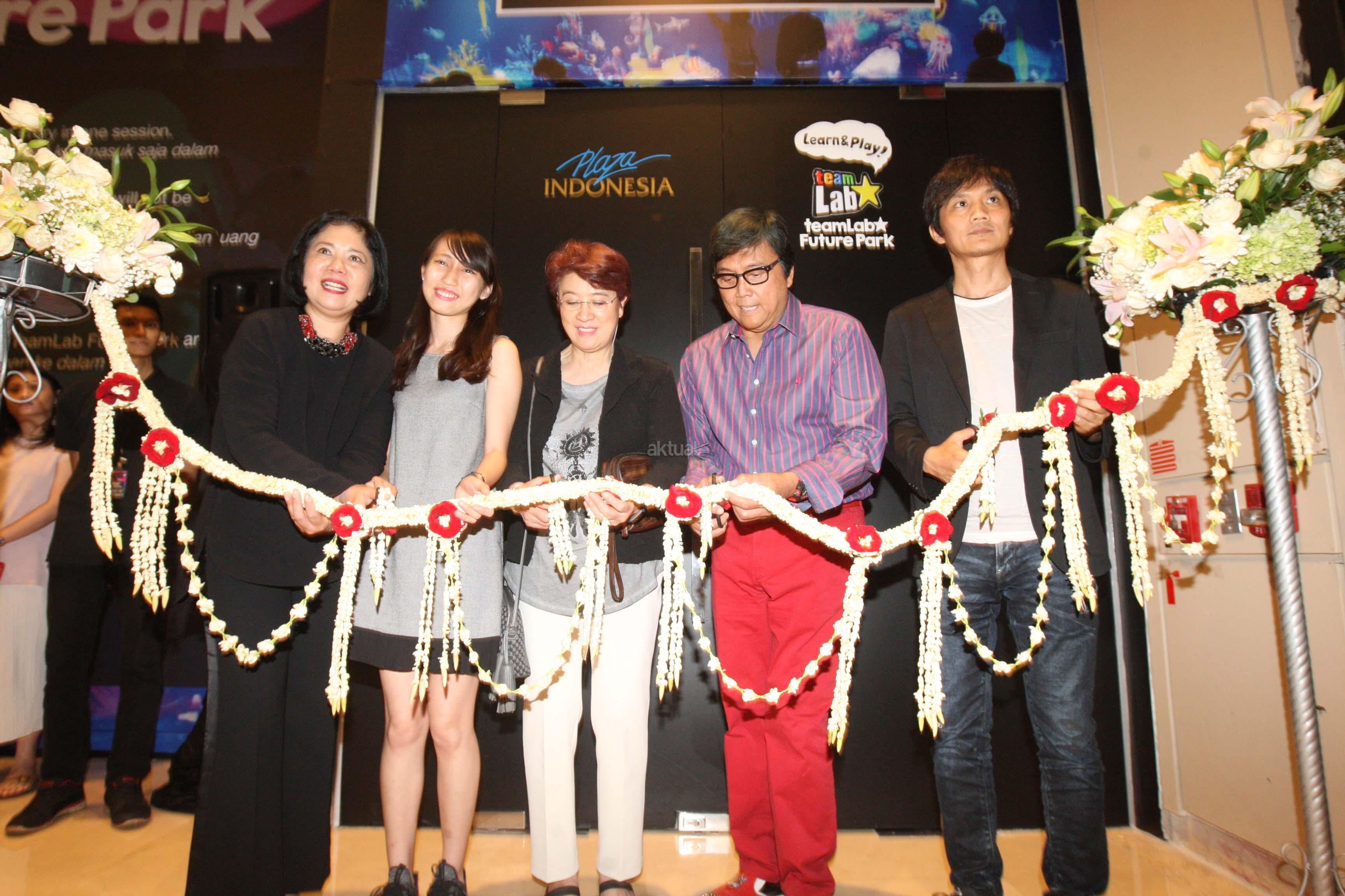 (dari kiri ke kanan) Chief Operating Officer PT Plaza Indonesia Realty Tbk, Mia Egron,TeamLab Future Park, Junko Hara, President Director PT Plaza Indonesia Realty Tbk, Rosano Barack (kedua dari kanan) beserta istri dan CEO teamLab Kids, Mr Akitae Matsumoto mengunting pita saat launching teamLab Future Park di di Plaza Indonesi, Jakarta, Minggu (4/6). Area edukasi bermain bagi keluarga dan anak-anak menggunakan area seluas 700 sqm yang bertempat di lantai 5 pusat belanja tersebut, merupakan kali pertama hadir di Indonesia. teamLab Future Park menampilkan area-area yang menggunakan aplikasi teknologi tinggi yang terdiri dari tujuh macam antara lain sketch aquarium, sketch town, sketch town papercraft, ligth ball orchestra, dan lain sebagainya. teamLab Future Park dibuka untuk umum mulai Senin (5/6/2017) hingga 8 Oktober 2017 mendatang. AKTUAL/Eko S Hilman