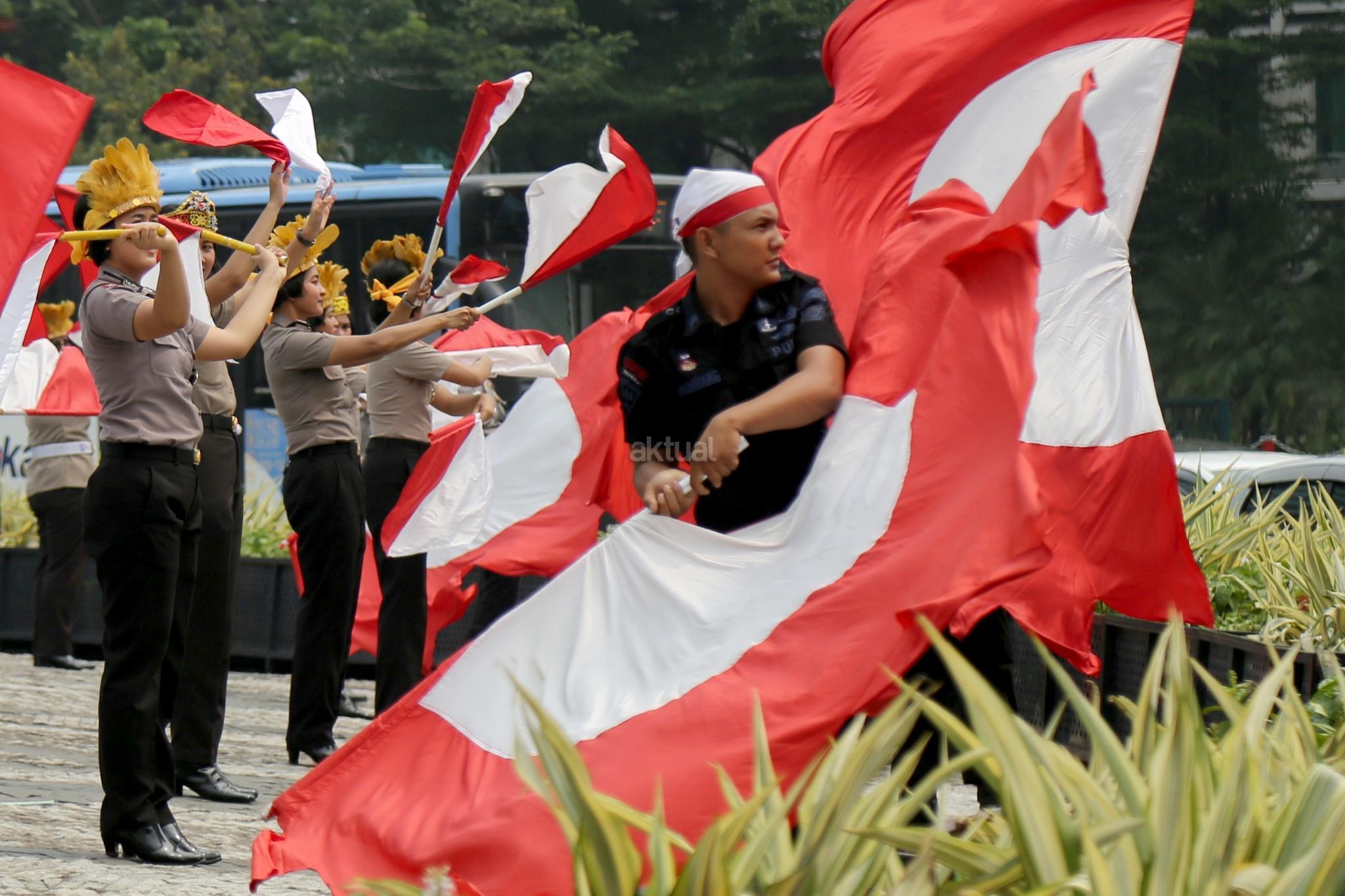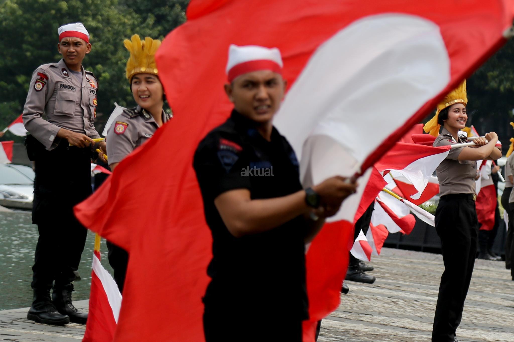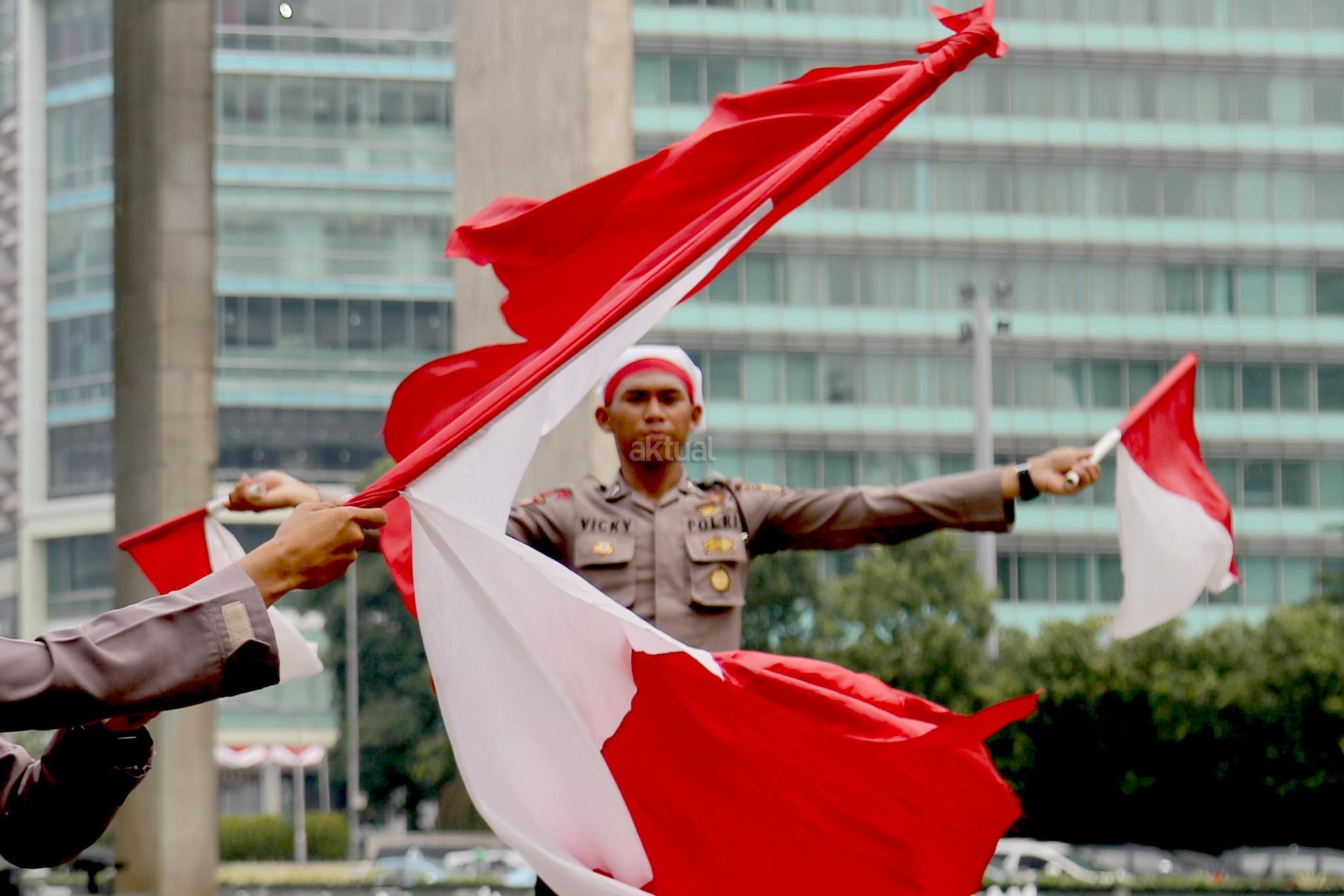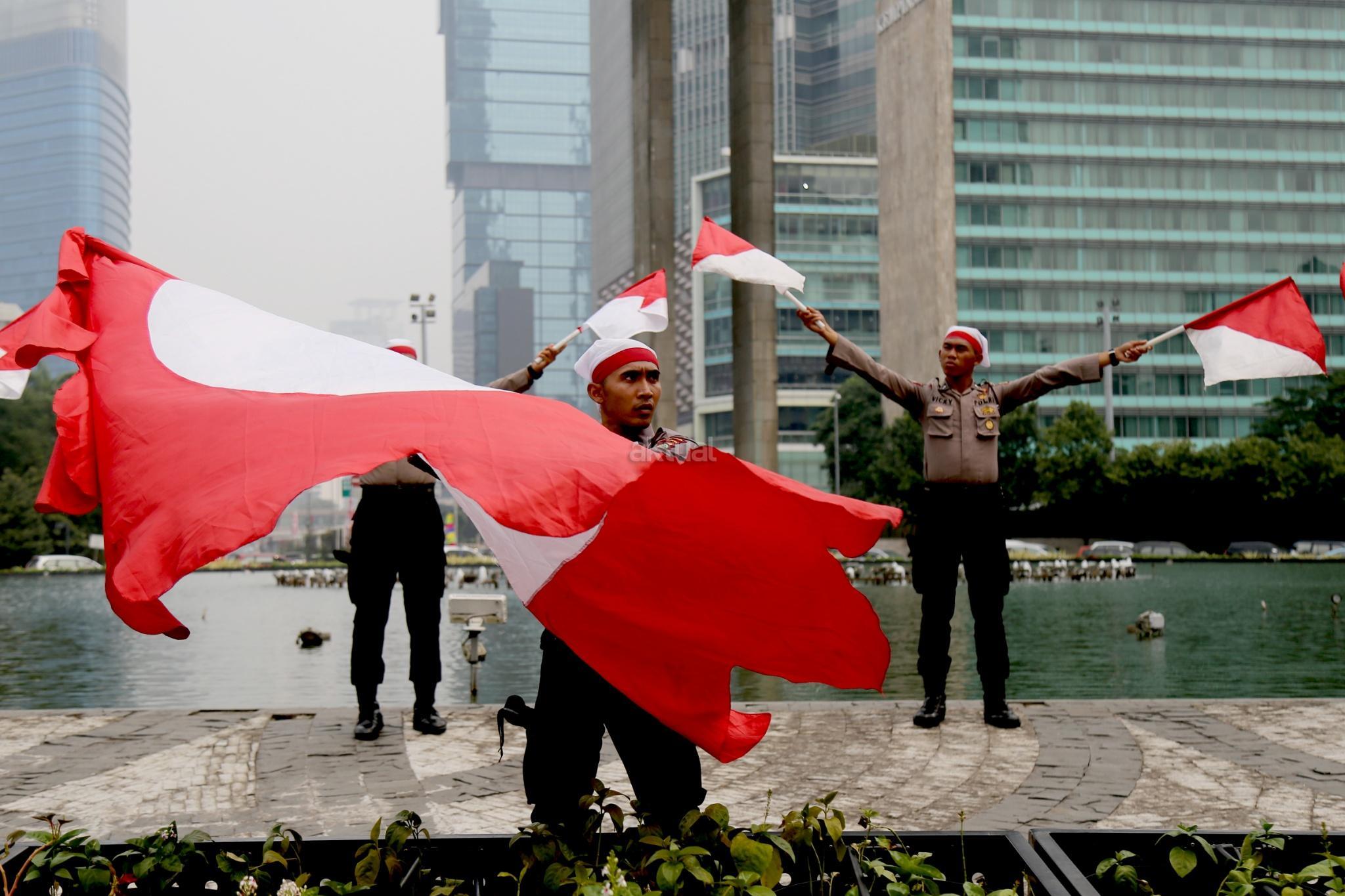 Sejumlah anggota polisi melakukan teaterikal merah putih di Bundaran Hotel Indonesia, Jakarta Pusat, Selasa (15/8). Aksi ini dalam rangka menyambut HUT Kemerdekaan RI ke 72 Tahun. AKTUAL/Tino Oktaviano