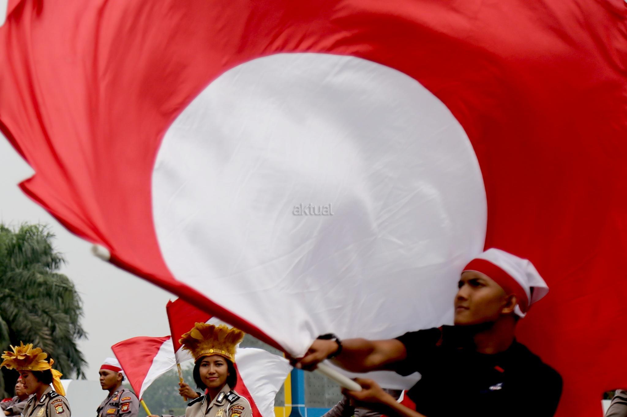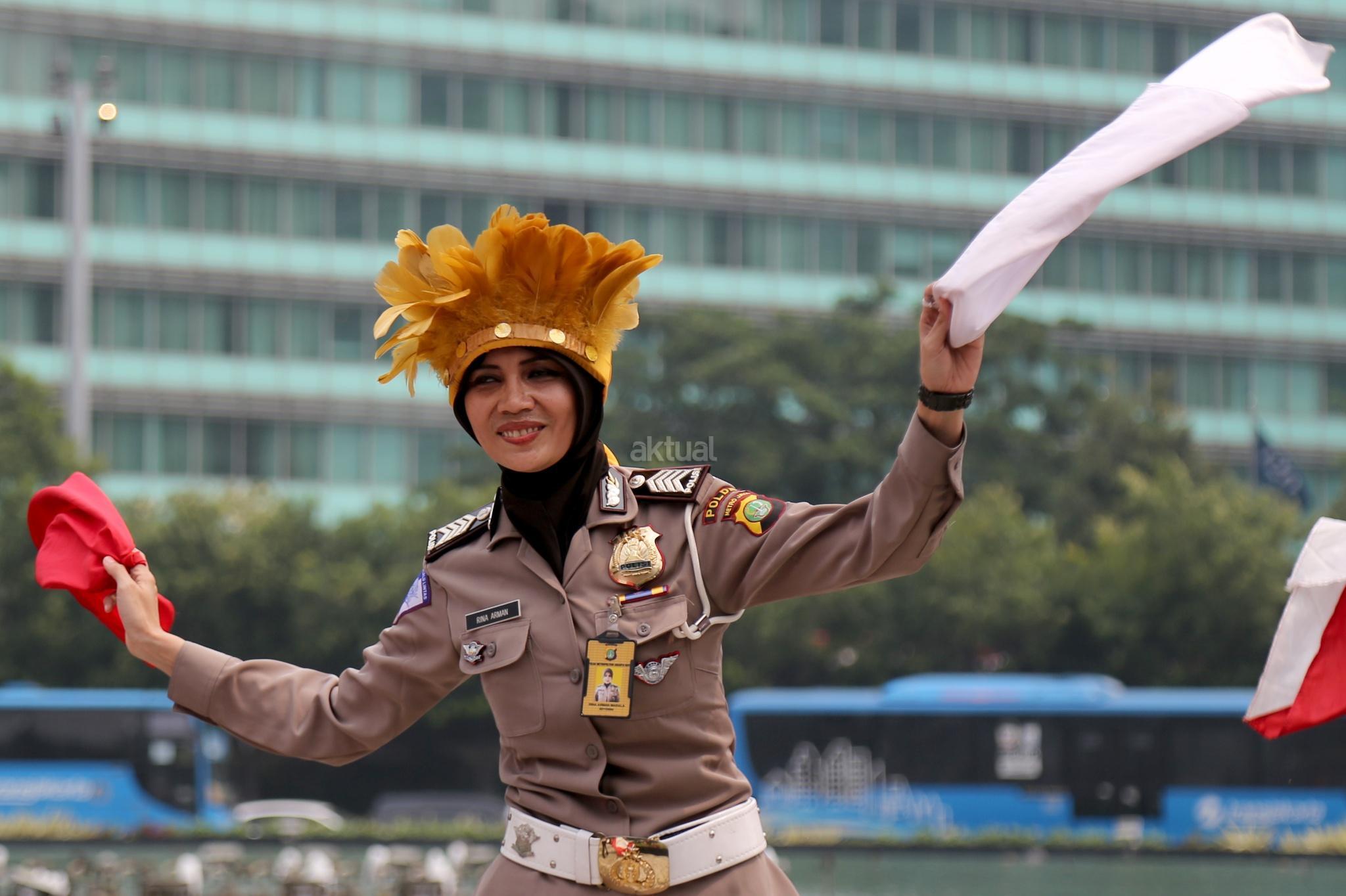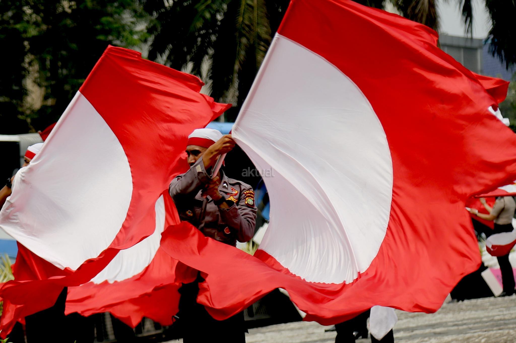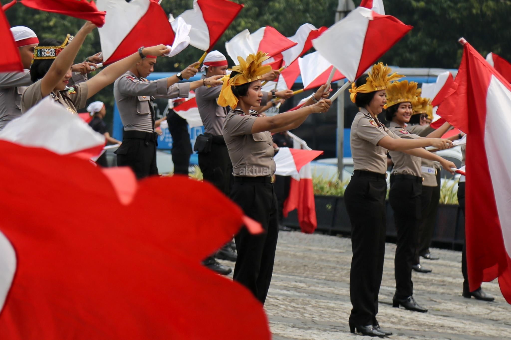 Sejumlah anggota polisi melakukan teaterikal merah putih di Bundaran Hotel Indonesia, Jakarta Pusat, Selasa (15/8). Aksi ini dalam rangka menyambut HUT Kemerdekaan RI ke 72 Tahun. AKTUAL/Tino Oktaviano