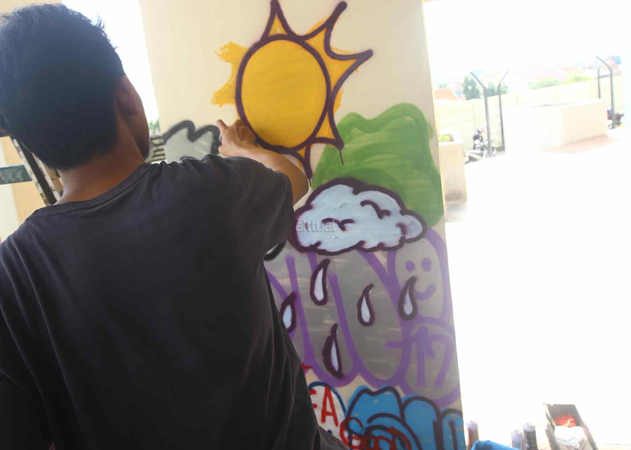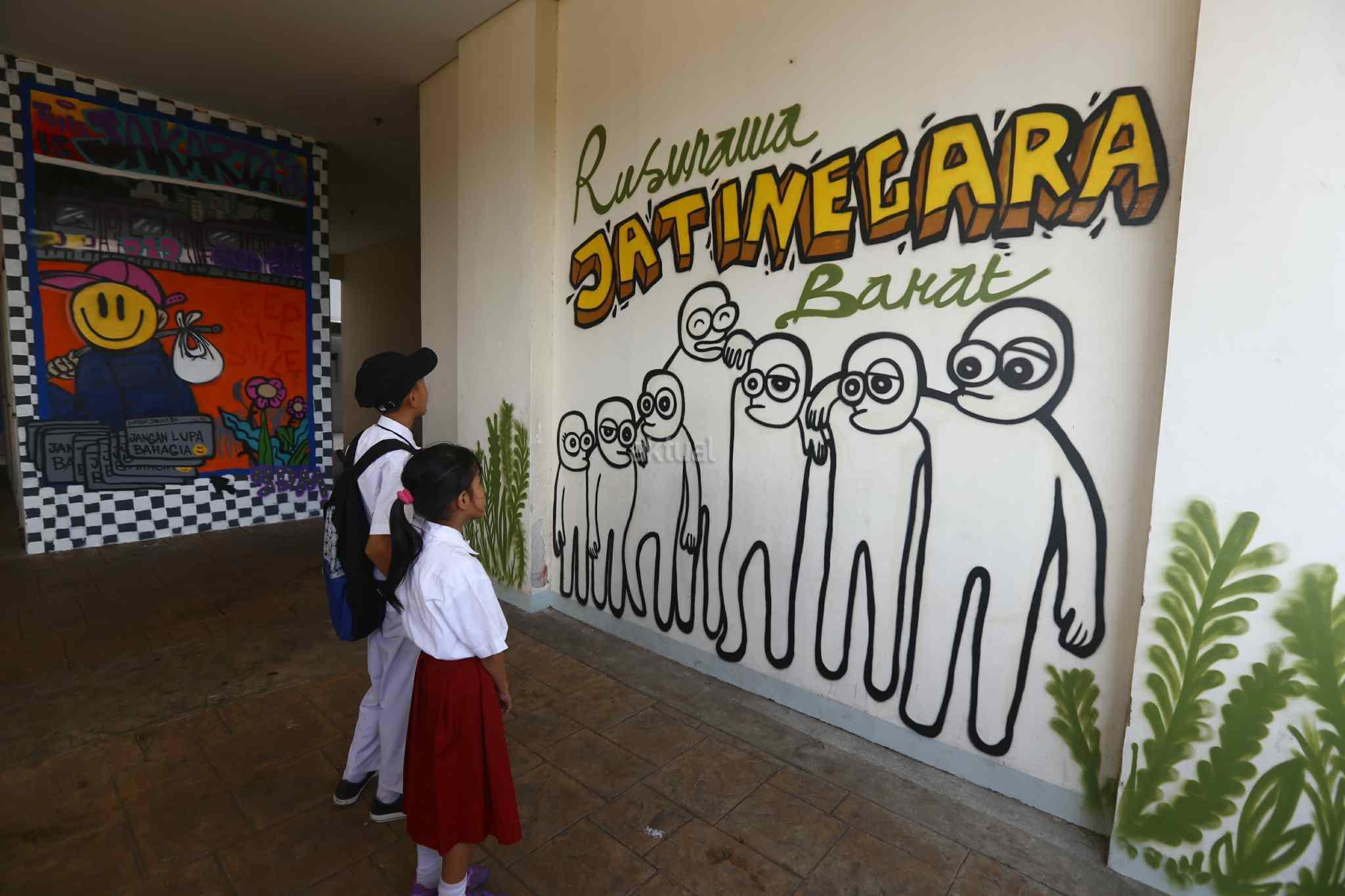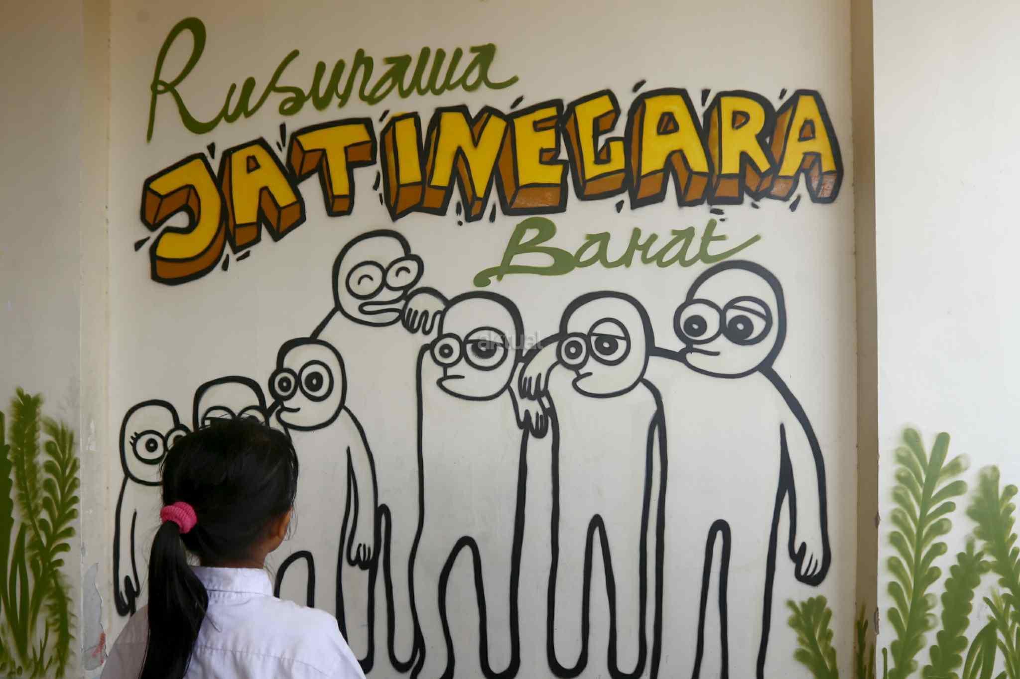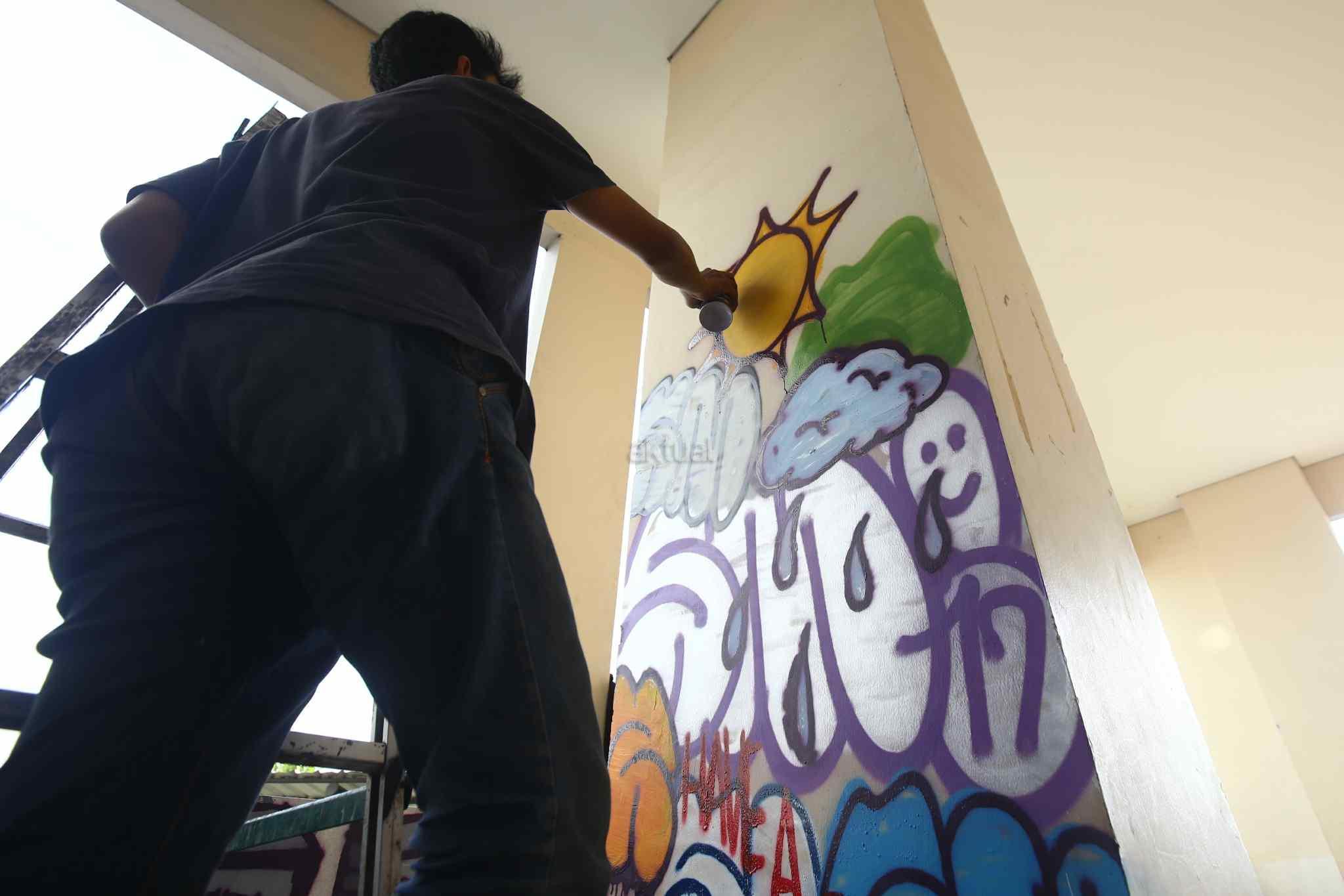 Seniman menyelesaikan mural di rumah susun sederhana sewa (rusunawa) Jatinegara Barat, Jakarta Timur, Senin (13/3). Sejumlah seniman melakukan seni mural (melukis di atas media dinding) di tembok Rusunawa Jatinegara Barat, Jatinegara, Jakarta Timur. Kegiatan itu dilakukan sebagai rangkaian acara Ruang Publik Terpadu Ramah Anak (RPTRA) Mural Festival dan Workshop Jakarta 2017, yang diselenggarakan oleh Artsip Jakarta. AKTUAL/Tino Oktaviano