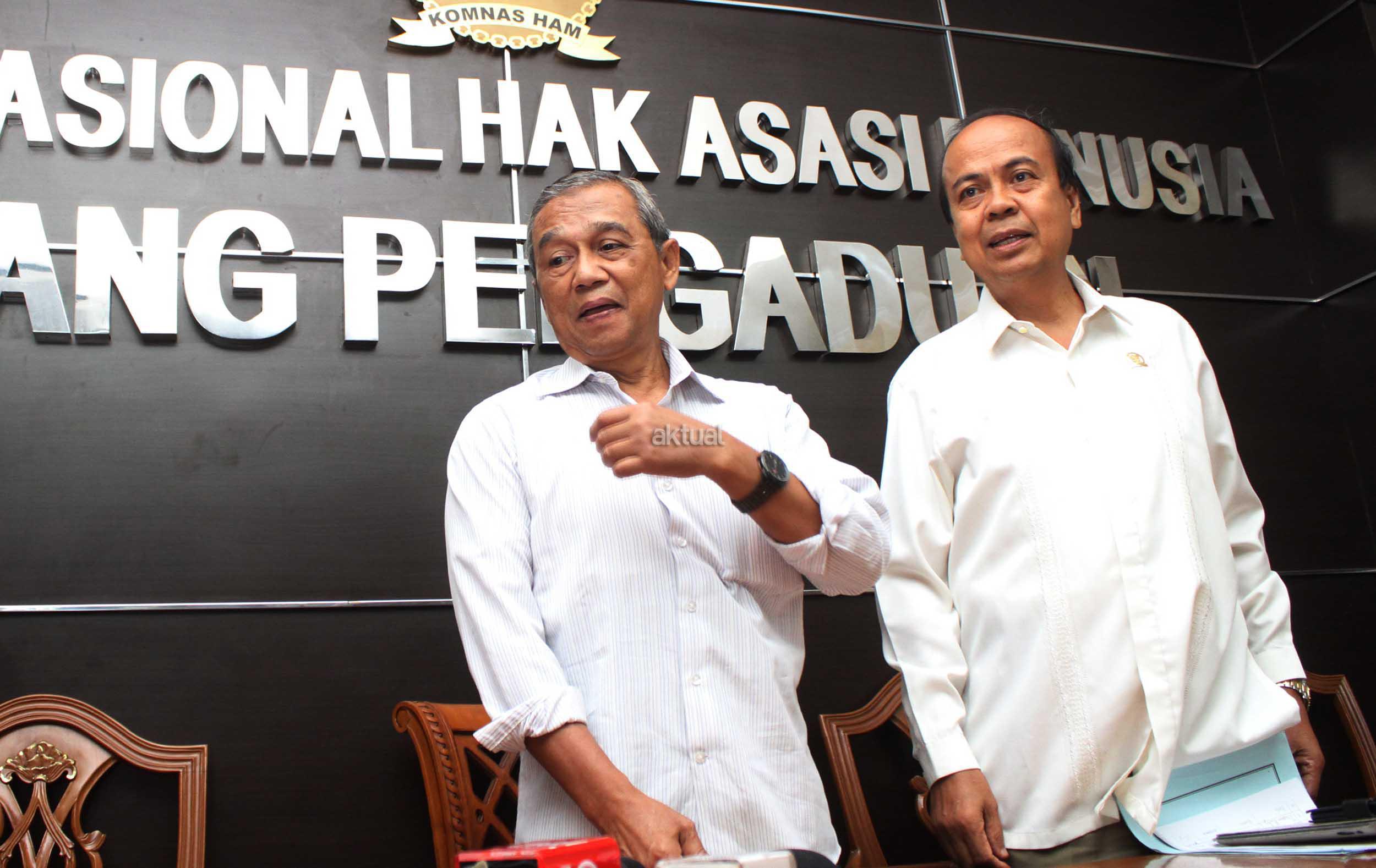 Ketua PP Muhammadiyah Busyro Muqodas (kiri) bersama Komisioner Komnas Ham Prof. Dr.Hafid Abbas (kanan) saat akan melakukan jumpa persnya di Komnas HAM,Jakarta, Senin (11/4). Tim forensik Muhammadiyah bersama seorang dokter forensik Polda Jawa Tengah menemukan sejumlah luka akibat benda tumpul ditubuh Siyono, warga Klaten, Jawa Tengah yang tewas setelah ditangkap Tim Detasemen Khusus 88 Antiteror Polri.