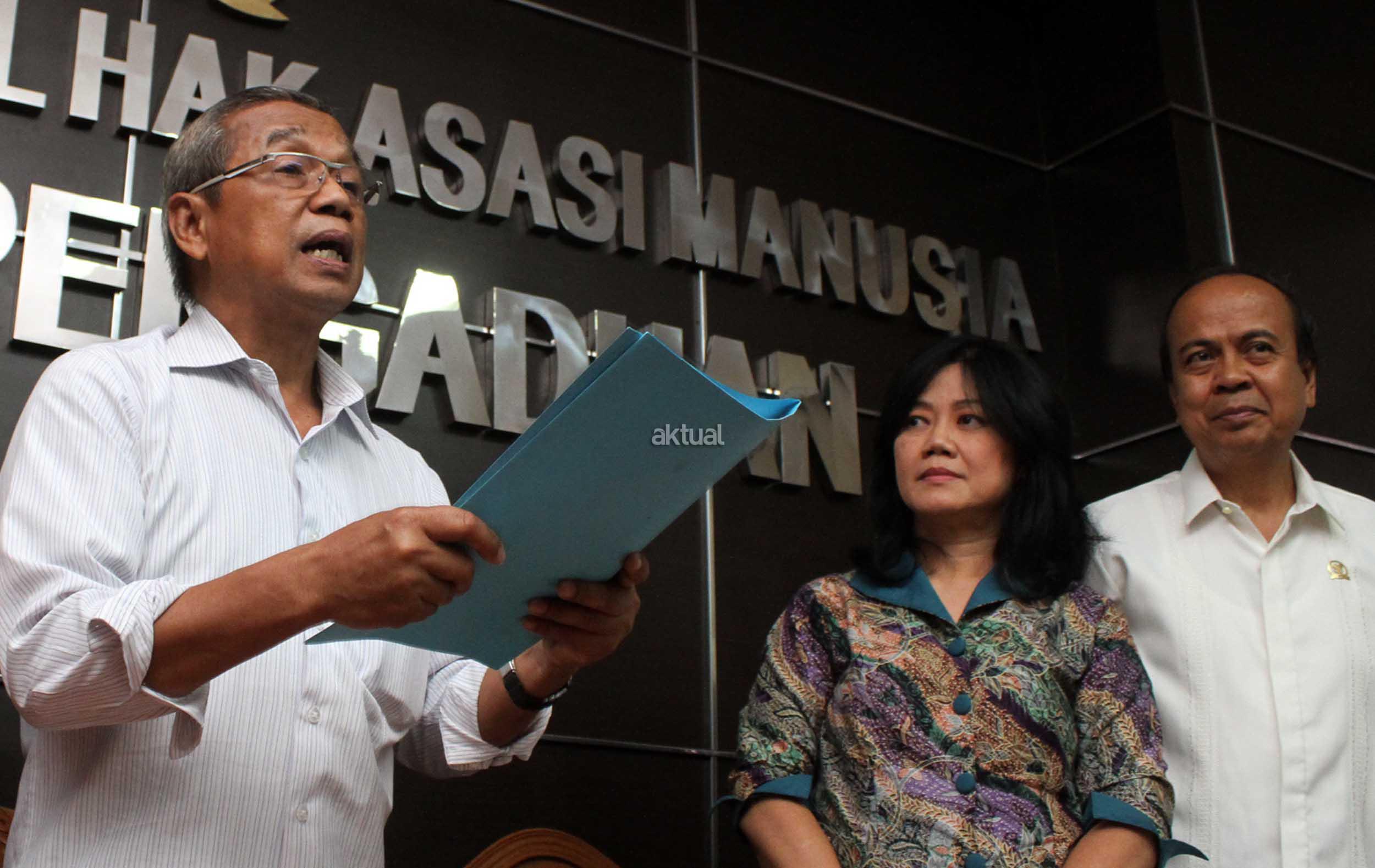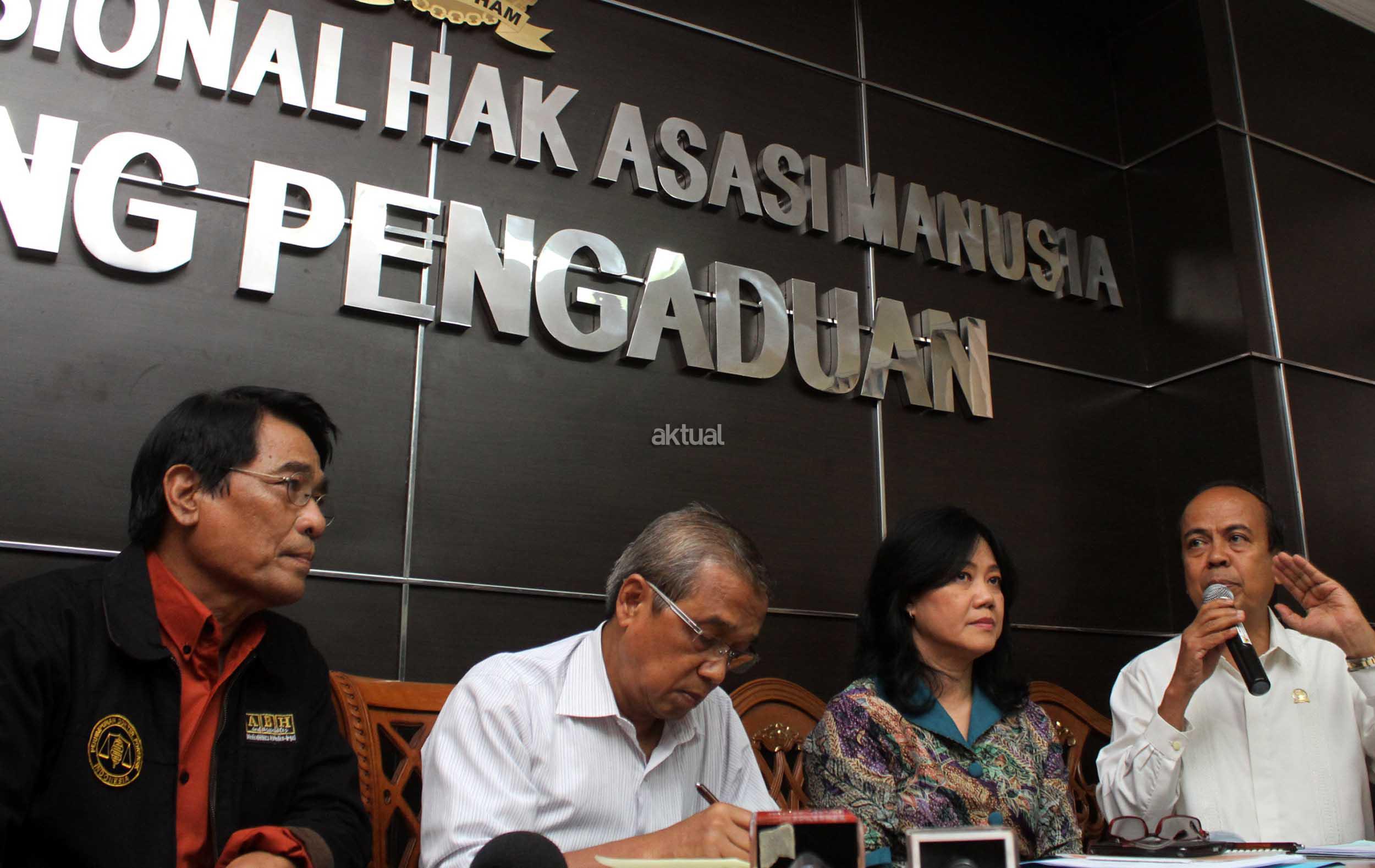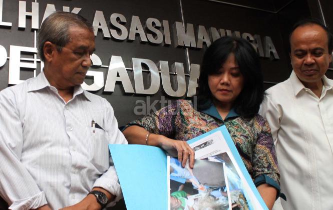 Ketua PP Muhammadiyah Busyro Muqodas (kiri), bersama Komisioner Komnas HAM Siane Indriani (kedua kanan) dan Hafid Abbas (kanan) menunjukan foto saat dilakukan otopsi jasad Siyono di Kantor Komnas HAM, Jakarta, Senin (11/4/2016). Tim forensik Muhammadiyah bersama seorang dokter forensik Polda Jawa Tengah menemukan sejumlah luka akibat benda tumpul ditubuh Siyono, warga Klaten, Jawa Tengah yang tewas setelah ditangkap Tim Detasemen Khusus 88 Antiteror Polri.