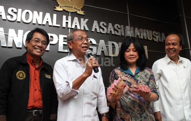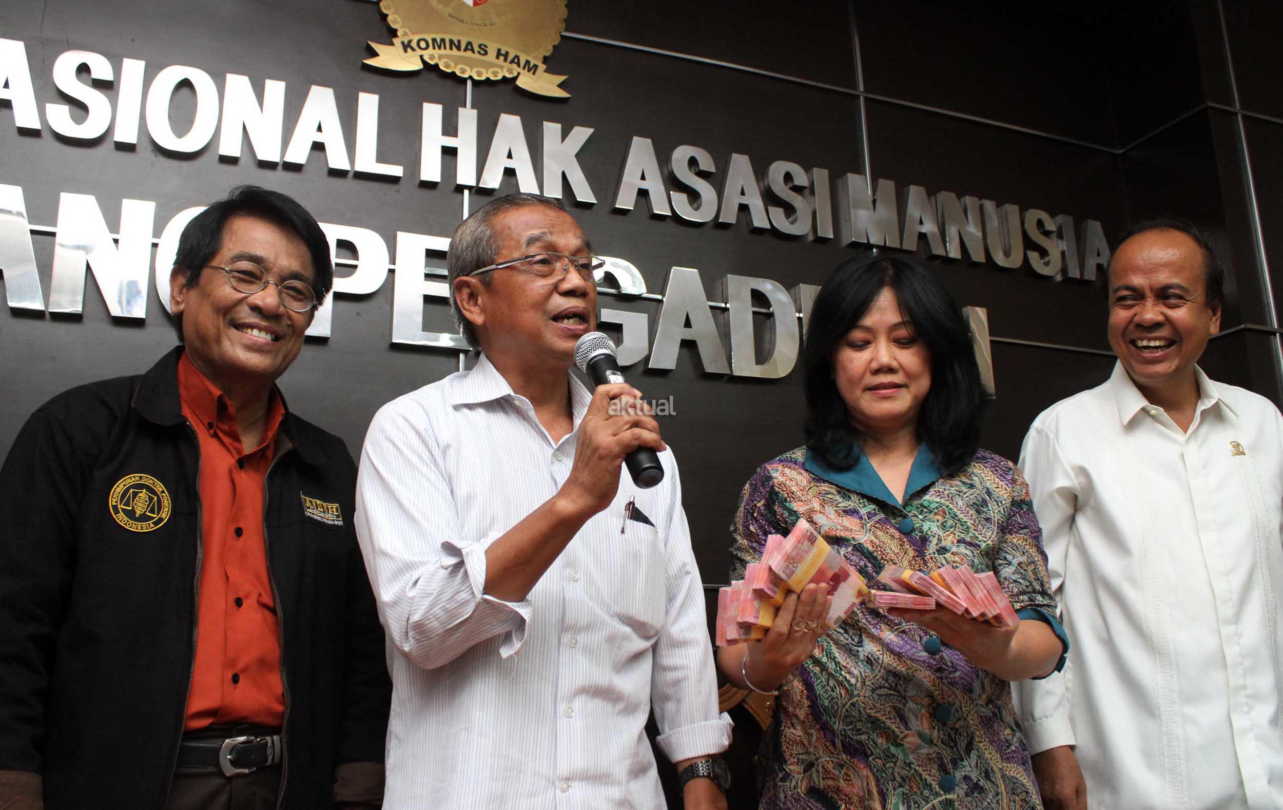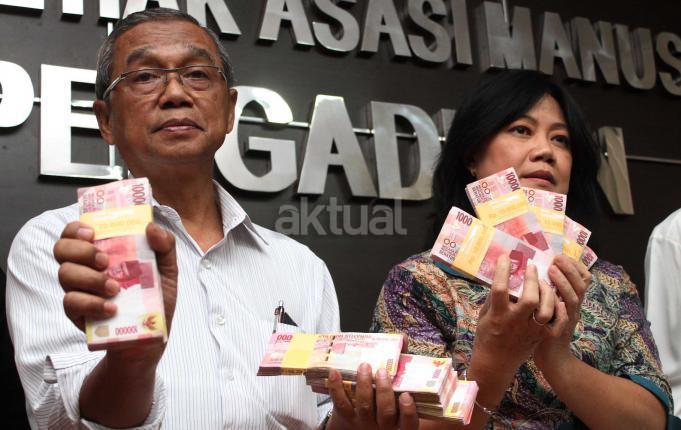 Ketua PP Muhammadiyah Busyro Muqodas (kiri), bersama Komisioner Komnas HAM Siane Indriani (kanan), menunjukan uang yang diberikan orang yang ditenggarai Polisi kepada keluarga korban Siyono saat mengumumkan hasil otopsi jasad Siyono di Kantor Komnas HAM, Jakarta, Senin (11/4/2016). Tim forensik Muhammadiyah bersama seorang dokter forensik Polda Jawa Tengah menemukan sejumlah luka akibat benda tumpul ditubuh Siyono, warga Klaten, Jawa Tengah yang tewas setelah ditangkap Tim Detasemen Khusus 88 Antiteror Polri.