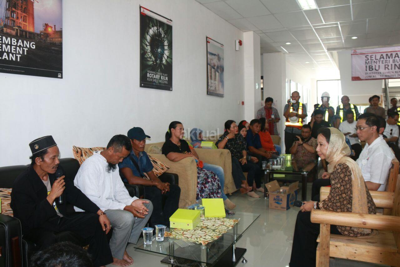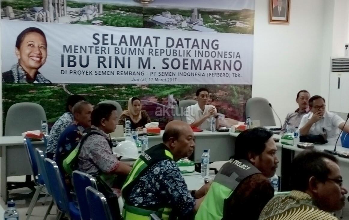 MenteriBUMN Rini M Soemarno meninjau proses pembangunan pabrik semen Indonesia di Kabupaten Rembang, Jumat (17/3). Rini didampingi Direktur Utama PT Semen Indonesia Rizkan Chandra, Direktur Utama BNI Ahmad Baiquni dan Direktur Utama Bank Mandiri Kartika Wirjoatmadjo. Dalam Kunjungannya, Rini sempat melihat beberapa bangunan pabrik dan berdialog dengan warga dari Ring 1 sekitar pabrik dan menjelaskan kepada warga bahwa saat ini pabrik masih dalam proses uji coba. Pabrik yang dioperasikan nantinya membawa kemakmuran bagi warga sekitar. April Tahun ini pabrik PT Semen Indonesia di Kecamatan Gunem, Kabupaten Rembang, Jawa Tengah yang menelan investasi hingga Rp 4,9 triliun ini berkapasitas produksi 3 juta ton semen per tahun. Selain mengunjungi pabrik, Rini bertolak ke kediaman tokoh kharismatik asal Rembang, KH. Maimun Zubair. AKTUAL/HO