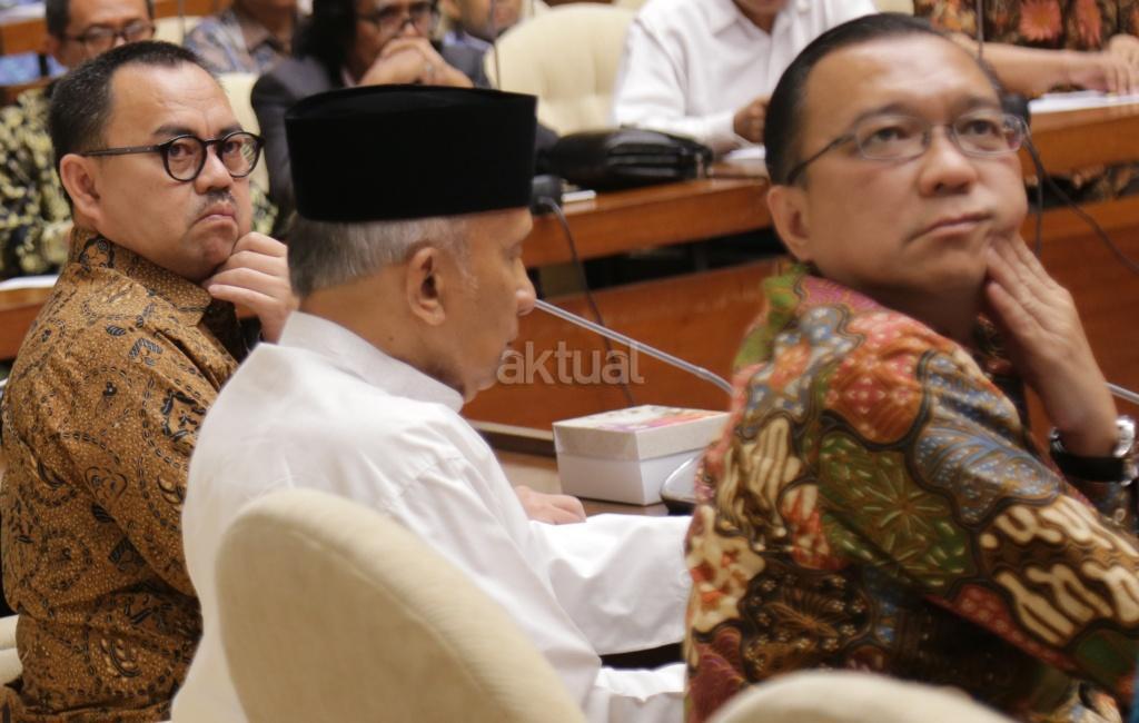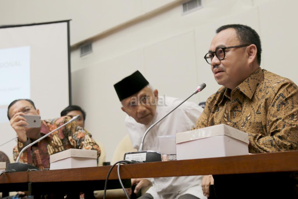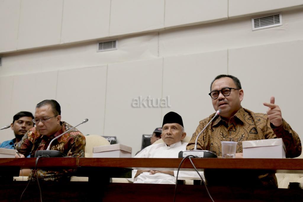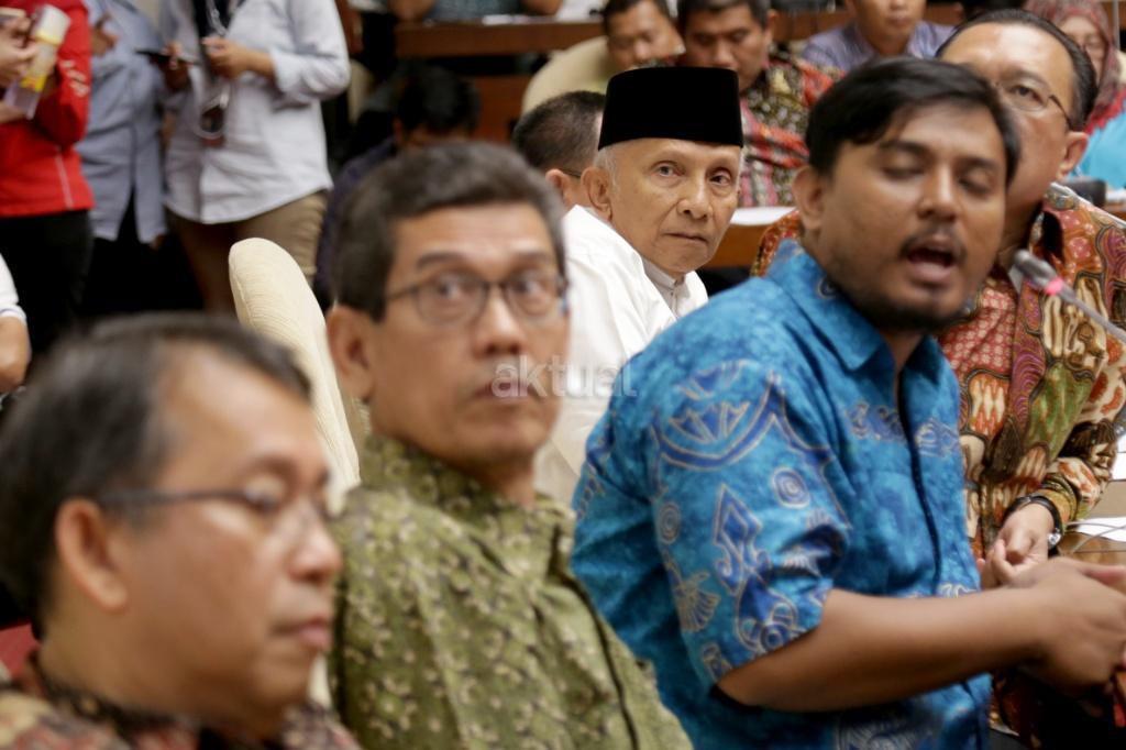 Ketua MPR 1999-2004 Amien Rais, Ketua Tim Sinkronisasi Anies-Sandi Sudirman Said saat seminar Stop Proyek Reklamasi Teluk Jakarta, di gedung Parlemen, Senayan, Jakarta, Kamis (2/11). Bahwa proyek Reklamasi 17 Pulau Teluk Jakarta tidak akan pernah dilanjutkan! Mengapa? Karena proyek tersebut justru akan menenggelamkan sebagian wilayah Jakarta, menghilangkan hak hidup dan mata pencaharian puluhan ribu nelayan, melanggar berbagai aturan, merusak lingkungan dan sarat dengan dugaan tindak pidana korupsi. AKTUAL/Tino Oktaviano