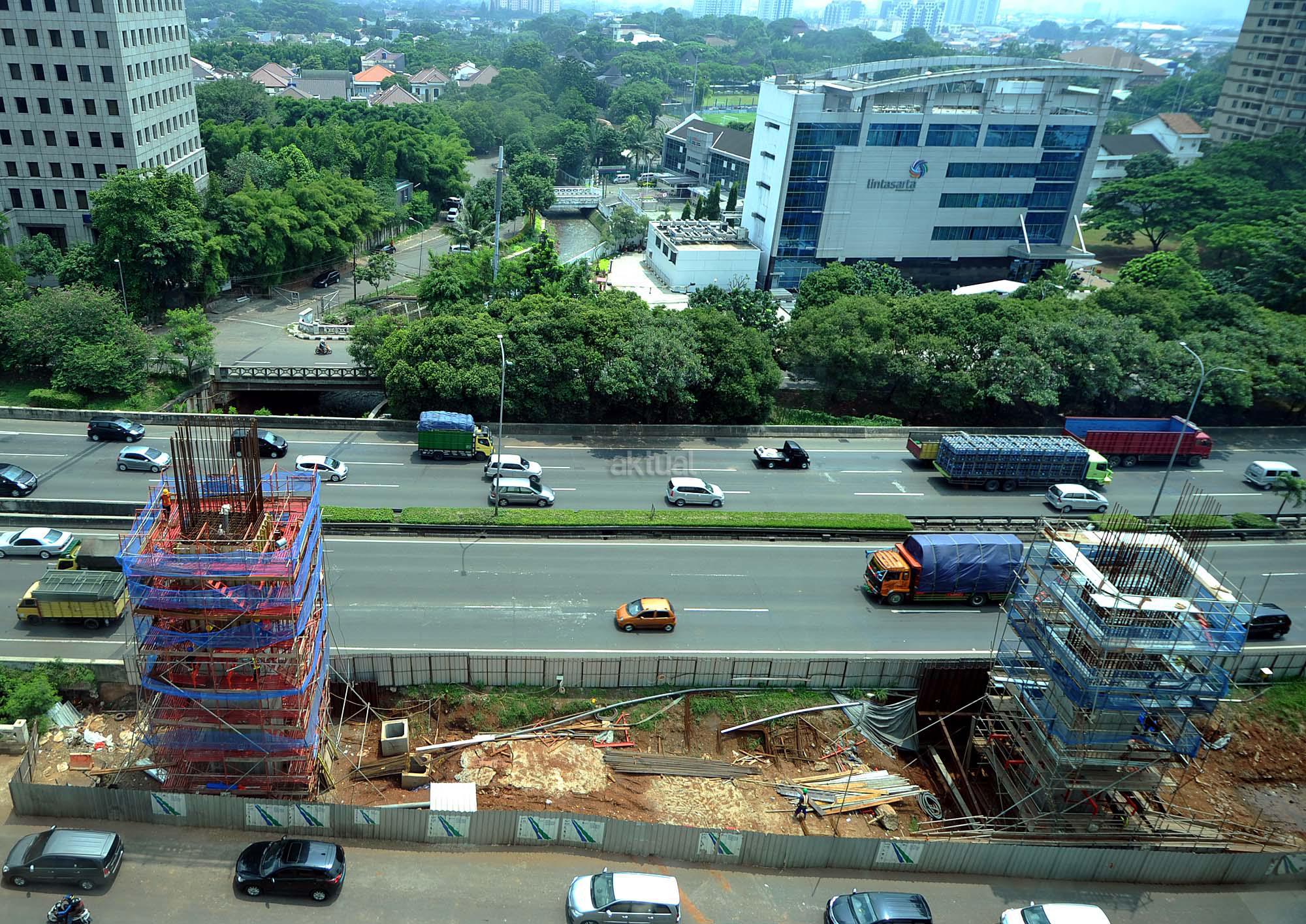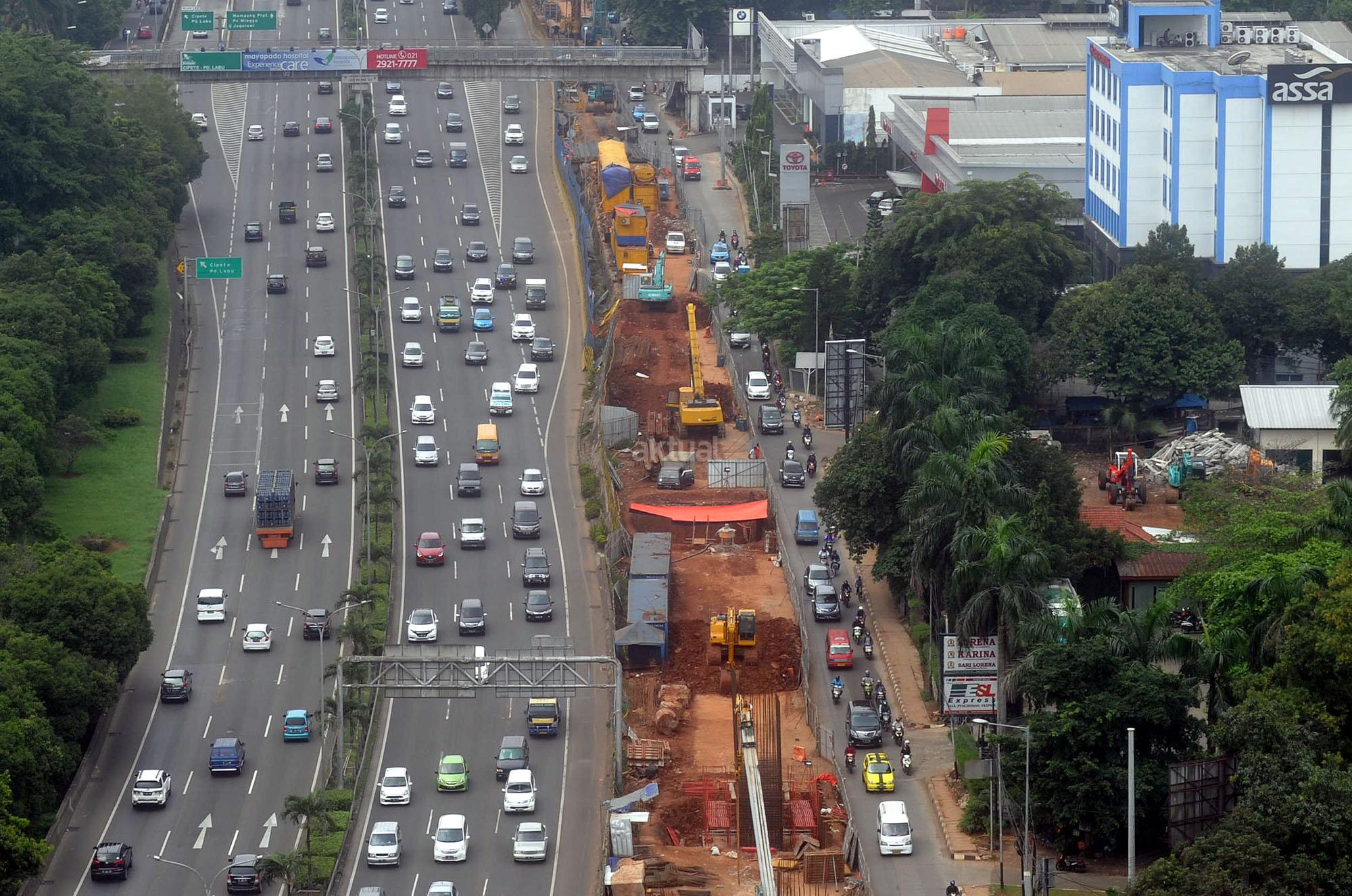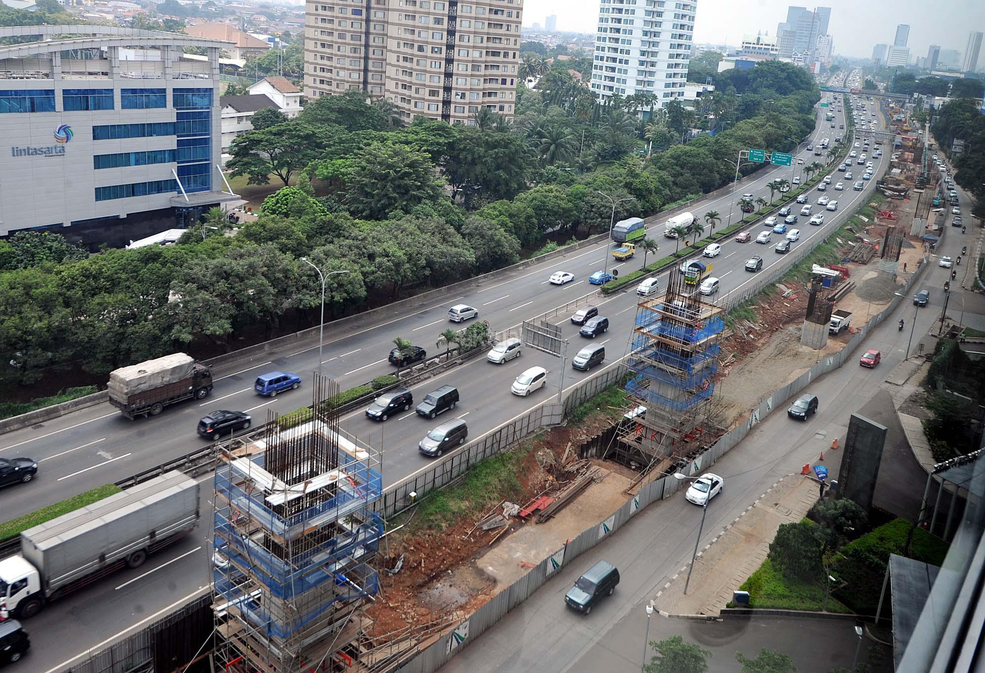 Kendaraan melewati kawasan pembangunan infrastruktur jalur layang Mass Rapid Transit (MRT) di Jalan TB Simatupang, Jakarta Selatan, Minggu (27/3). Gubernur DKI Jakarta Basuki Tjahaja Purnama memprediksi pengoperasian Mass Rapid Transit (MRT) akan molor dari jadwal yang telah ditargetkan. Hingga saat ini pembangunan MRT masih terkendala pembebasan lahan di Jalan Raya Fatmawati, Jakarta Selatan.